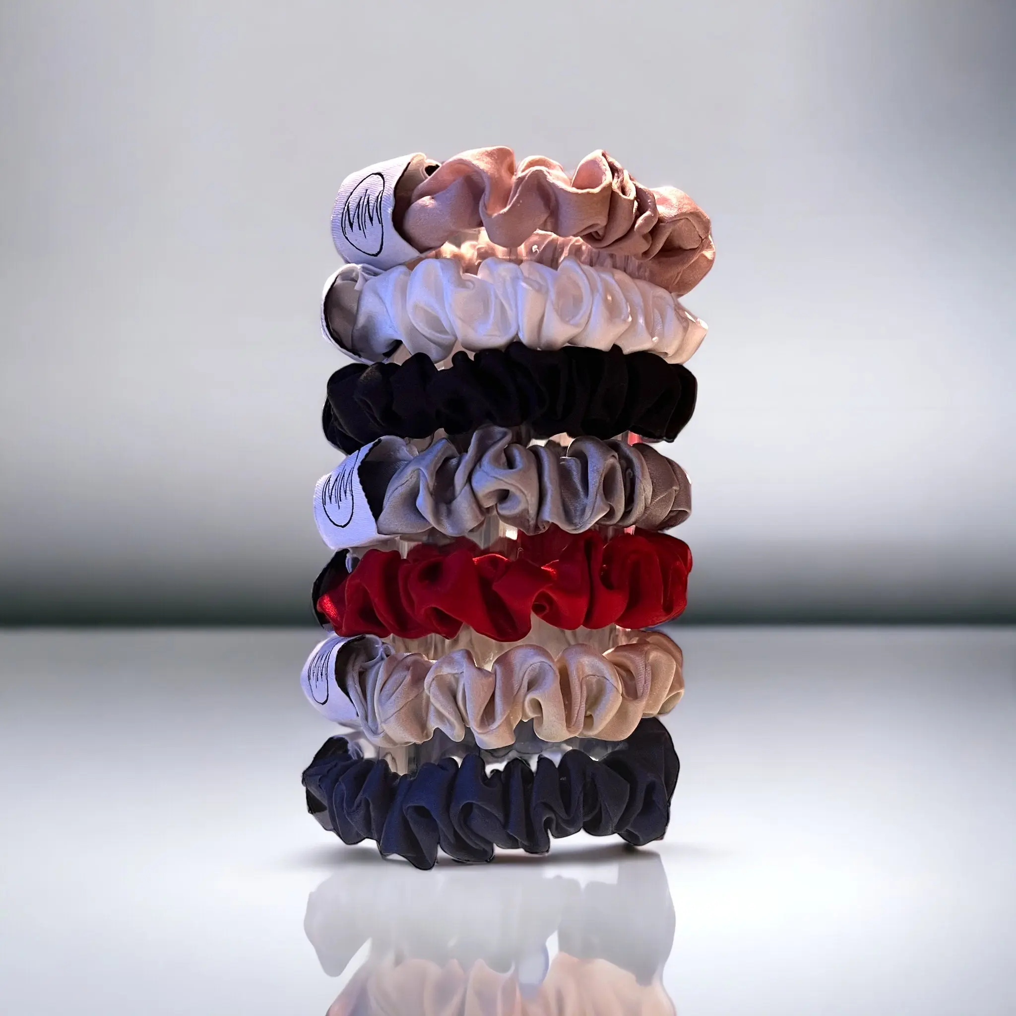 Perfect scrunchies for the care of your precious and delicate hair. Silk keeps your hair soft and moisturized by soaking up fewer natural oils from hair strands. Our silk scrunchies help prevent breakage and crinkles…. No frizz and no damage…Just beautiful hair!