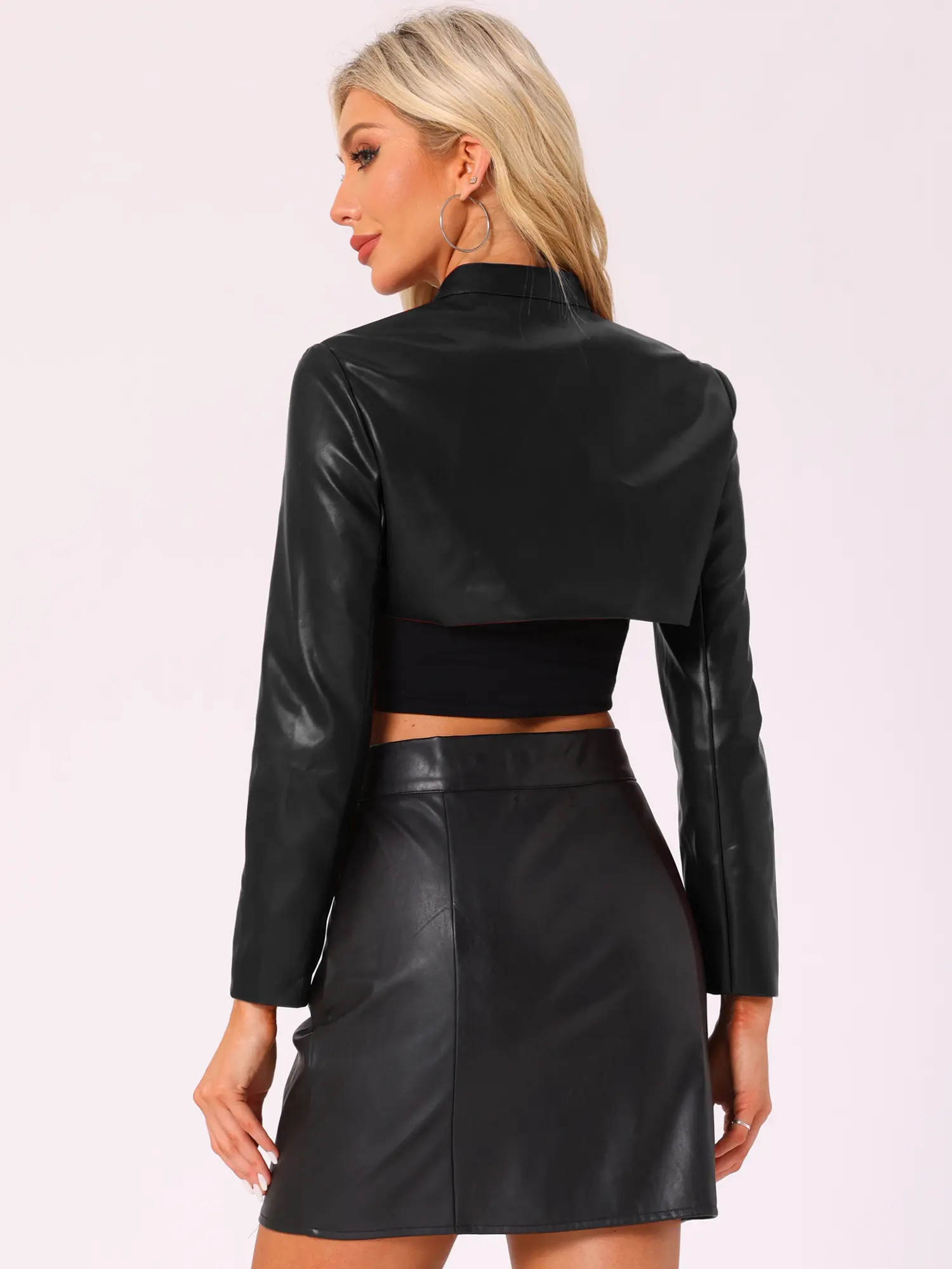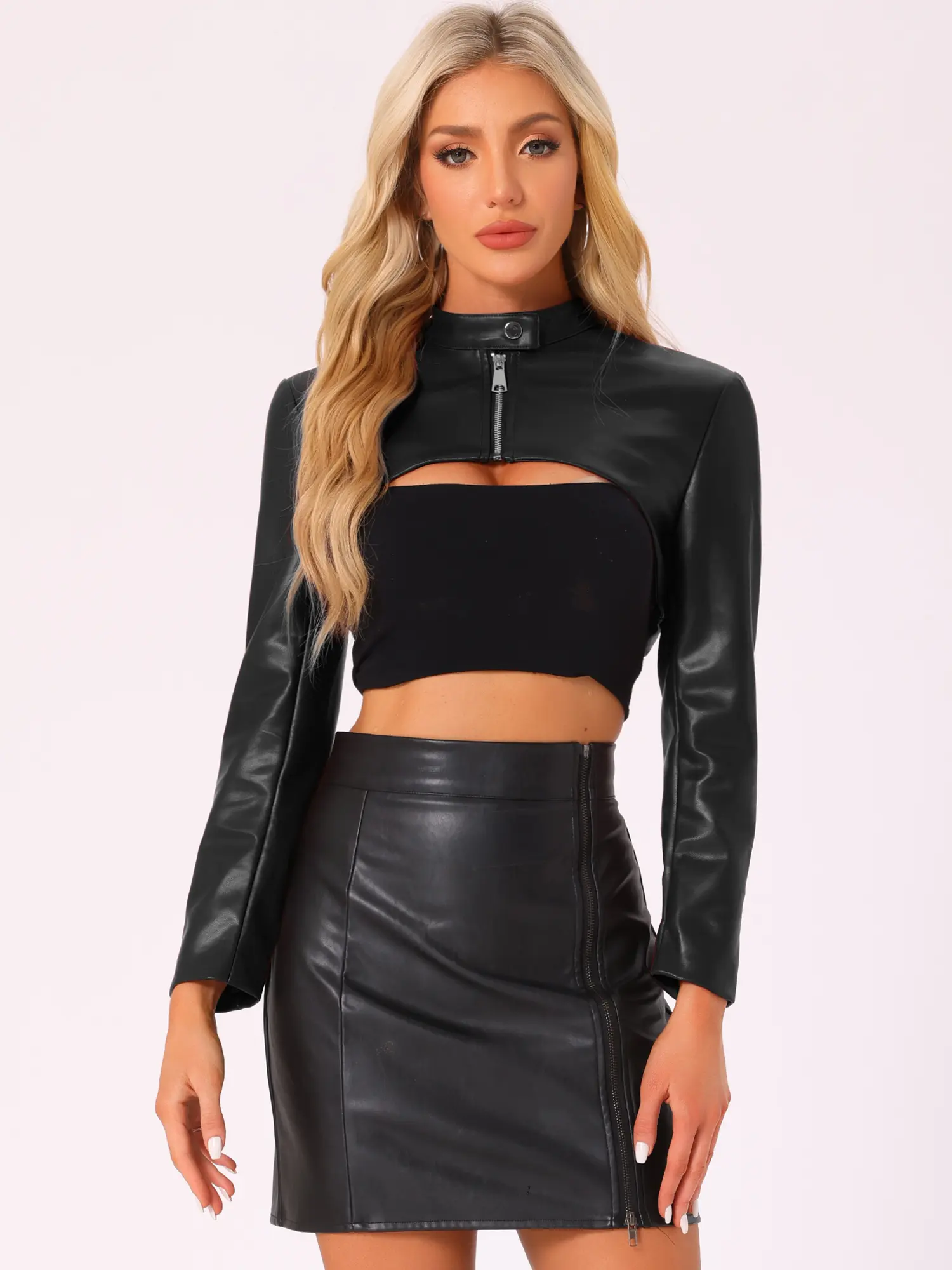 INSPIRE CHIC Women's Faux Leather Cropped Top Stand Collar Zipper Front Moto Biker Long Sleeve Jacket Coat