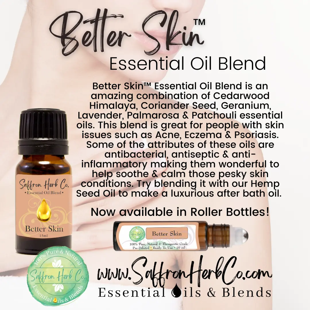 Better Skin Essential Oil Blend is an amazing combination of Sweet Almond, Cedarwood Himalaya, Coriander Seed, Geranium, Lavender, Palmarosa & Patchouli essential oils. This blend is great for people with skin issues such as Acne, Eczema & Psoriasis. Some of the attributes of these oils are antibacterial, antiseptic & anti-inflammatory making them wonderful to help soothe & calm those pesky skin conditions.