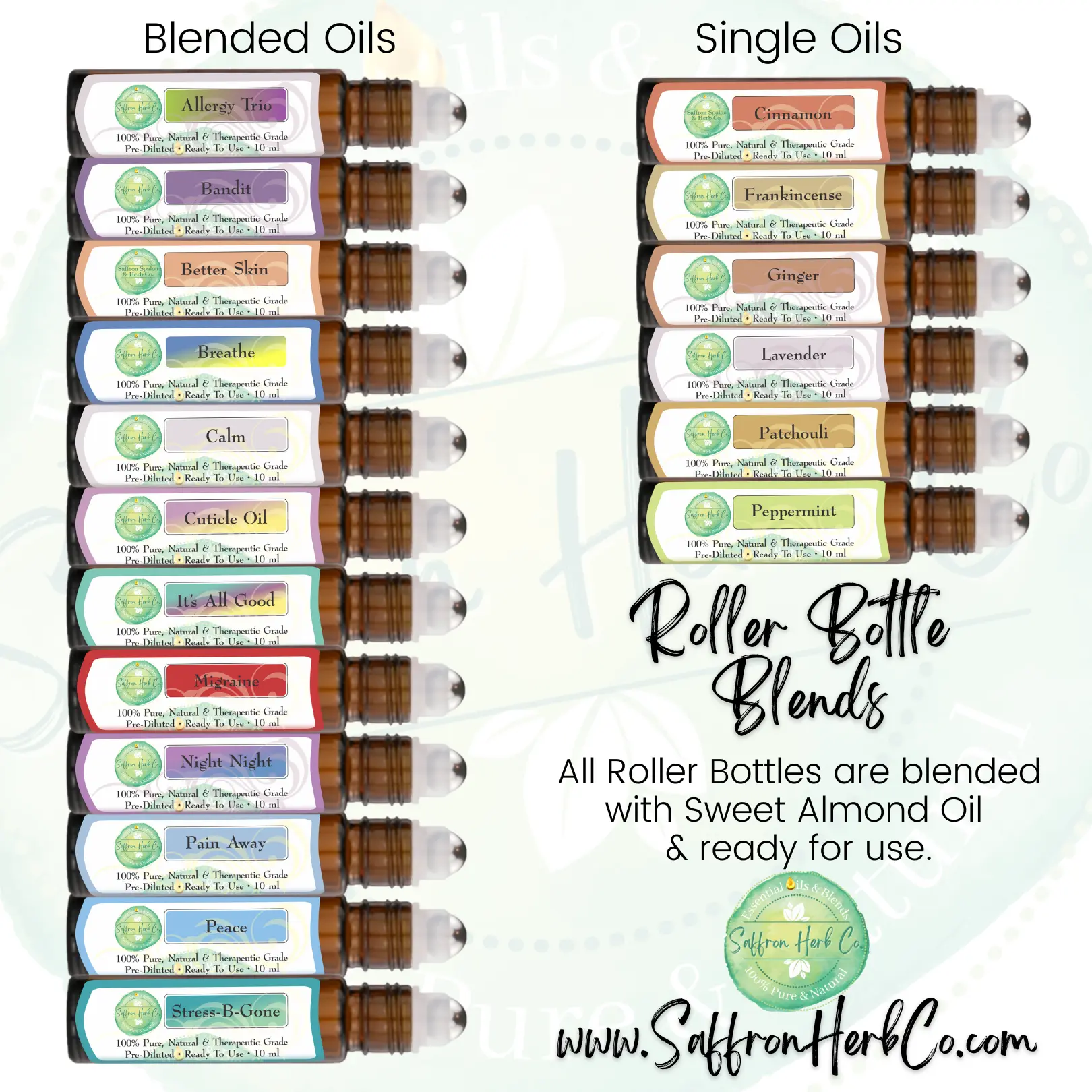 All of our Roller Bottle Blends are in 10 ml amber glass bottles, with a metal roller ball. Each has been blended with our Sweet Almond Oil & is ready for you to use! These are great to throw in your purse or gym bag & at this price, you can afford to carry them all with you!