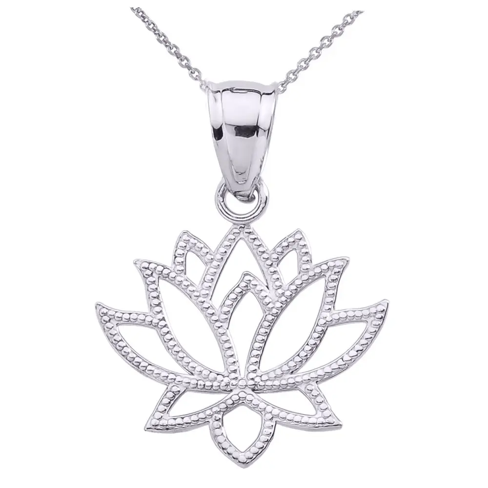 cutout enlightenment lotus flower charm fine jewelry dangling from its thin yet durable genuine silver chain necklace