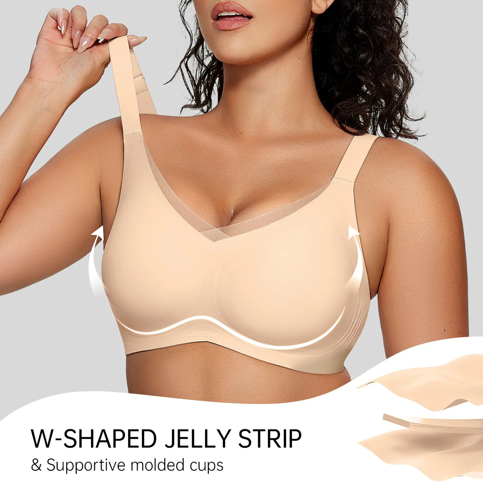 360° Jelly Strips Support – Full-cup + W-shaped front + bottom-edge strips. Lifts, shapes, and prevents spillage. No shifting, even when you move!