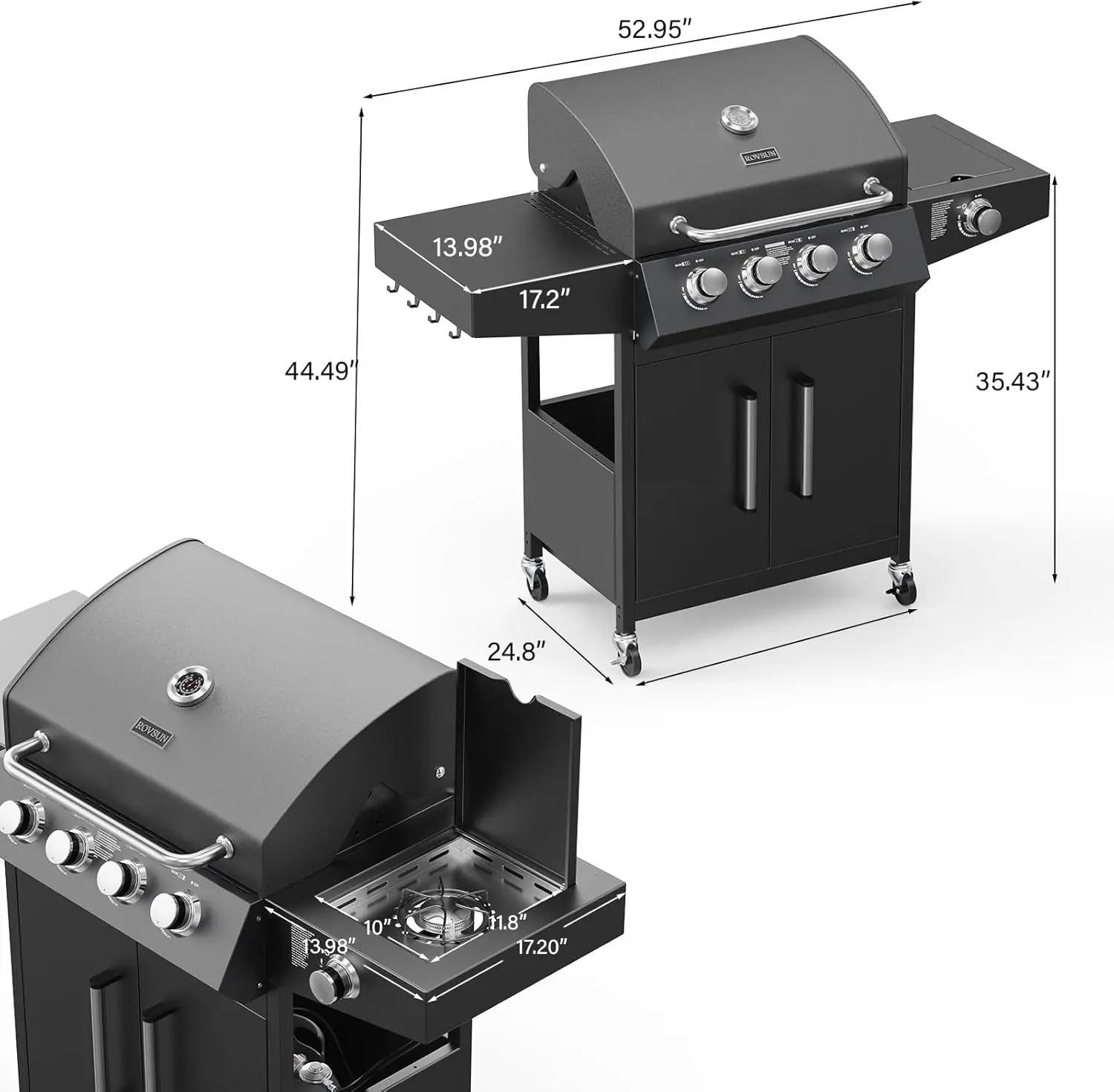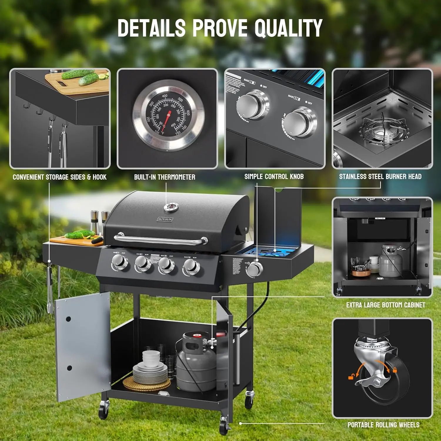 ROVSUN 4 Burner Propane Gas Grill with Side Burner, 58,000BTU BBQ Grills with Enameled Cast Iron Grates, Shelf & Cabinet for Outdoor Garden Patio Backyard Barbecue Cooking