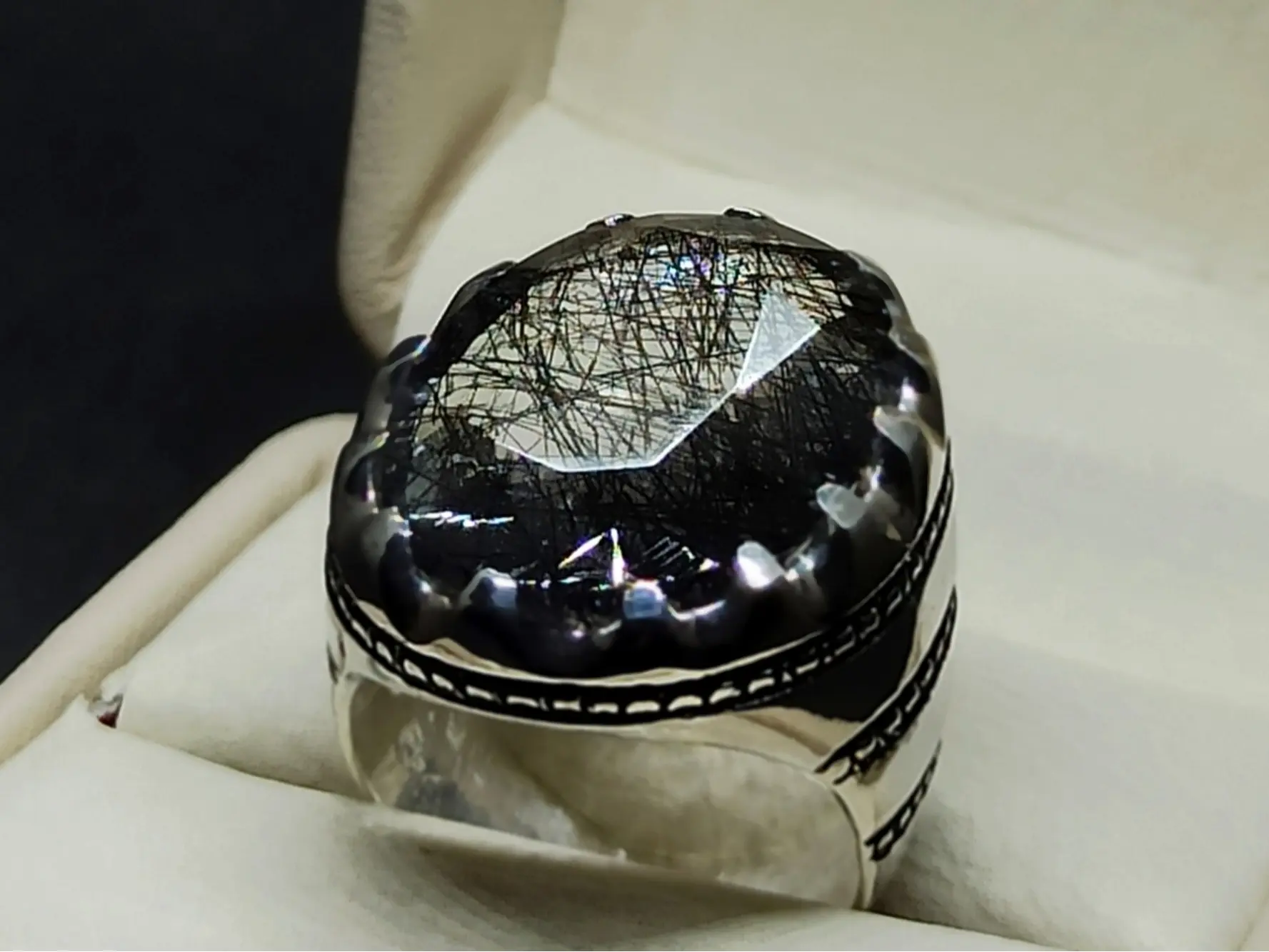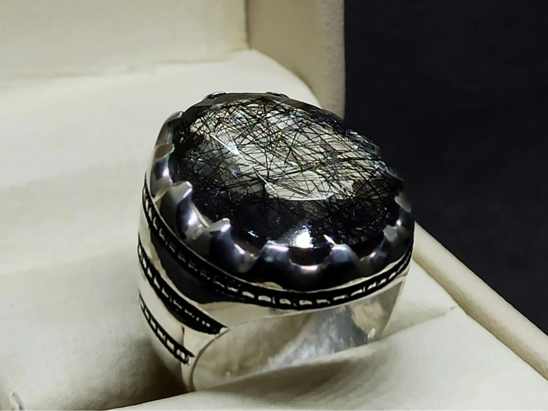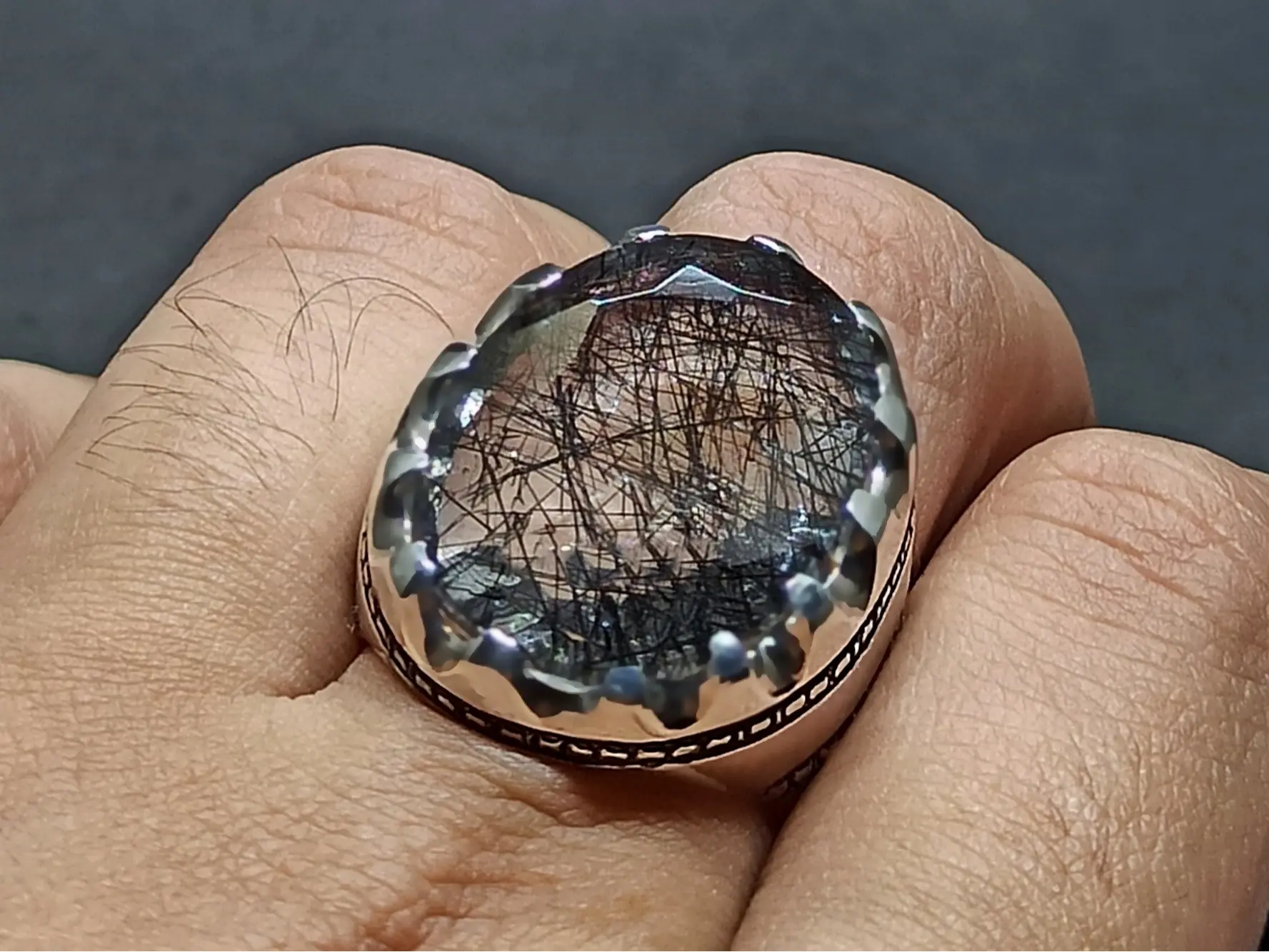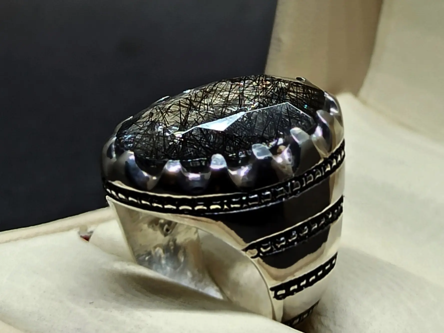 Discover the elegance of the Natural Big Muh e Najaf Sterling Silver Ring. Crafted from Rutilated Quartz and Mur e Najaf, this gemstone boasts a striking black and white color palette. Originating from the Middle East, it's natural and untreated, ensuring authenticity. The gemstone weighs 34 carats, measuring 22 x 15 x 8 mm. This handmade piece is a masterpiece of craftsmanship.