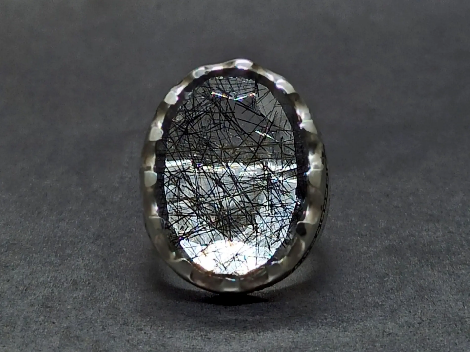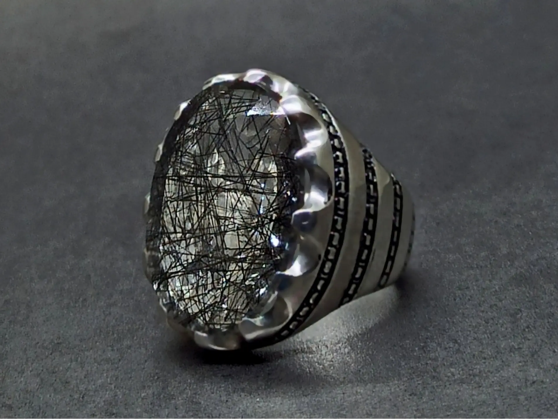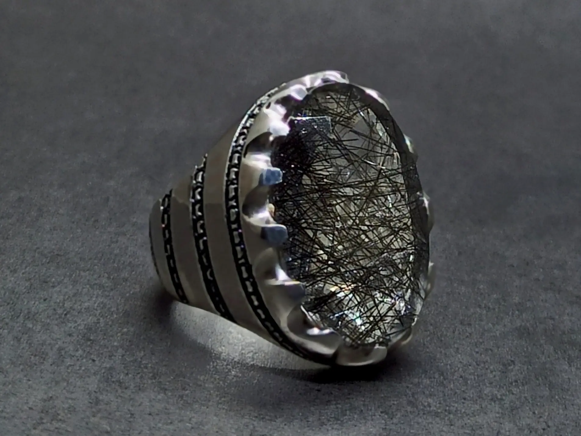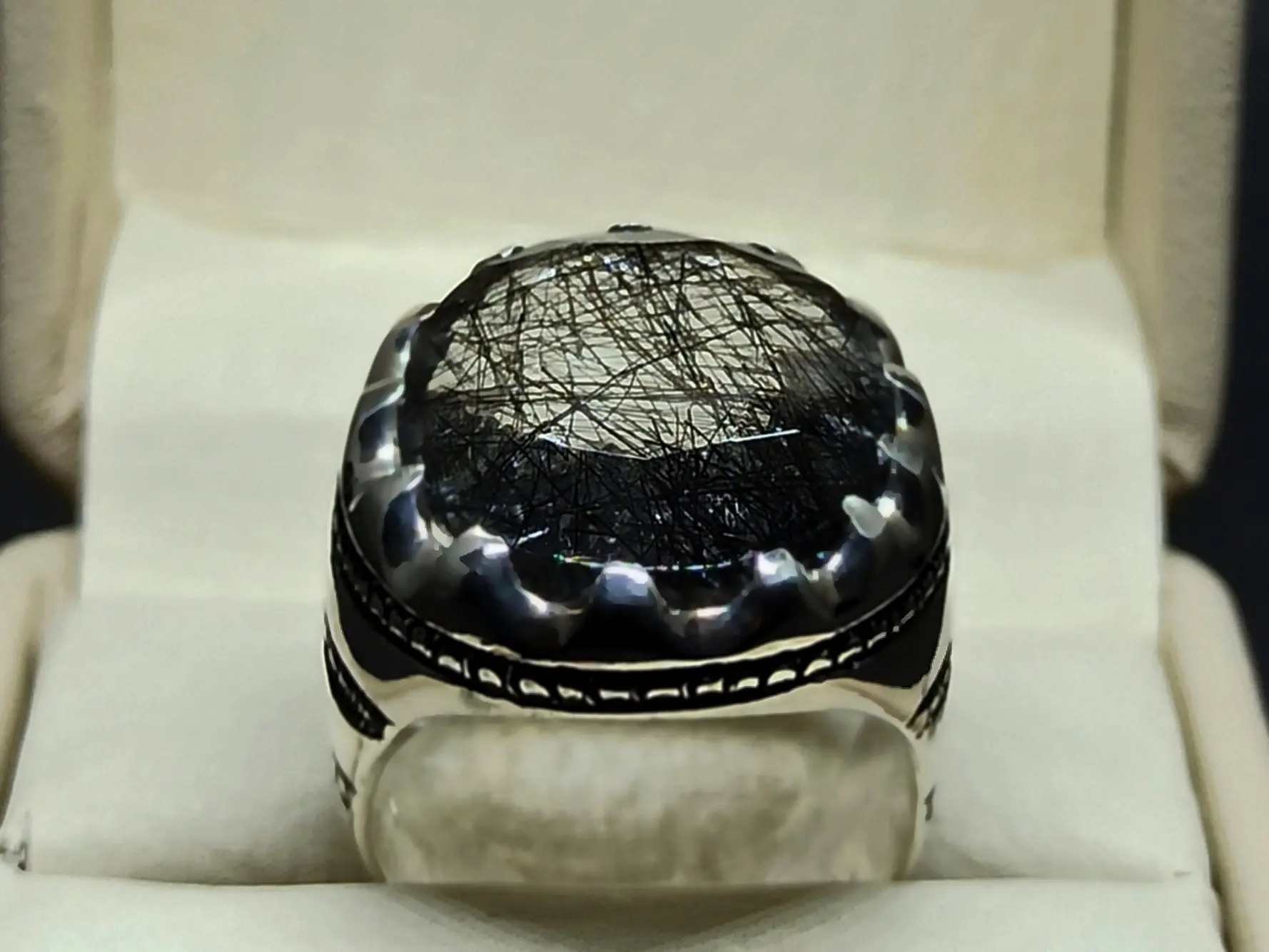 Discover the elegance of the Natural Big Muh e Najaf Sterling Silver Ring. Crafted from Rutilated Quartz and Mur e Najaf, this gemstone boasts a striking black and white color palette. Originating from the Middle East, it's natural and untreated, ensuring authenticity. The gemstone weighs 34 carats, measuring 22 x 15 x 8 mm. This handmade piece is a masterpiece of craftsmanship.