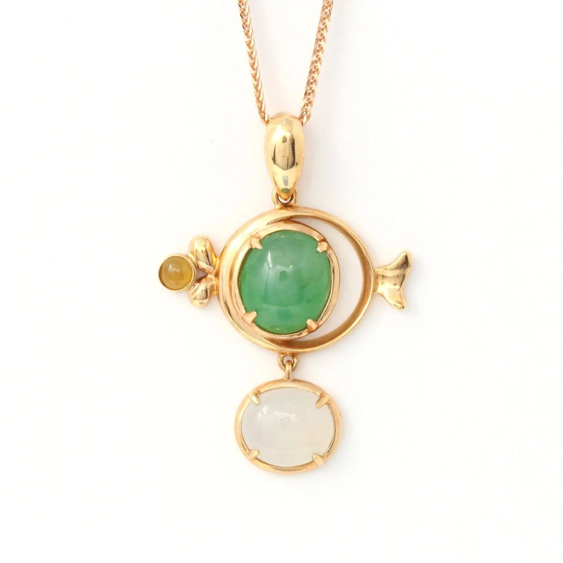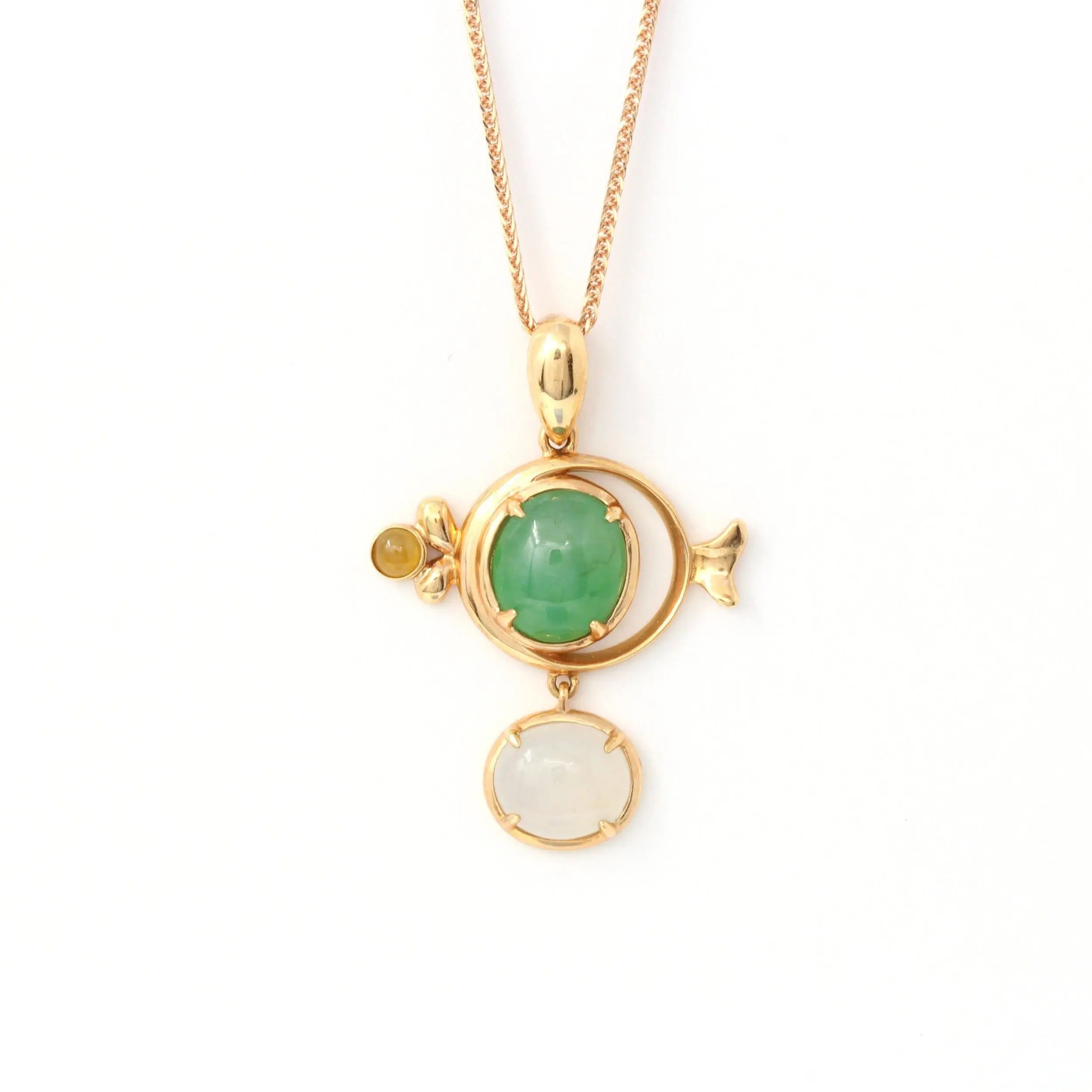 This necklace is made with three genuine Burmese Jadeite, one imperial green, one translucent white, and one royal yellow, truly a mesmerizing combination. The two stones are rare due to the color and translucency, especially the white jade, they are uncommon to be found in that color. The design was inspired by the simplistic yet elegant shape of a fish. Representing luck, happiness, and contentment. Fine polish.