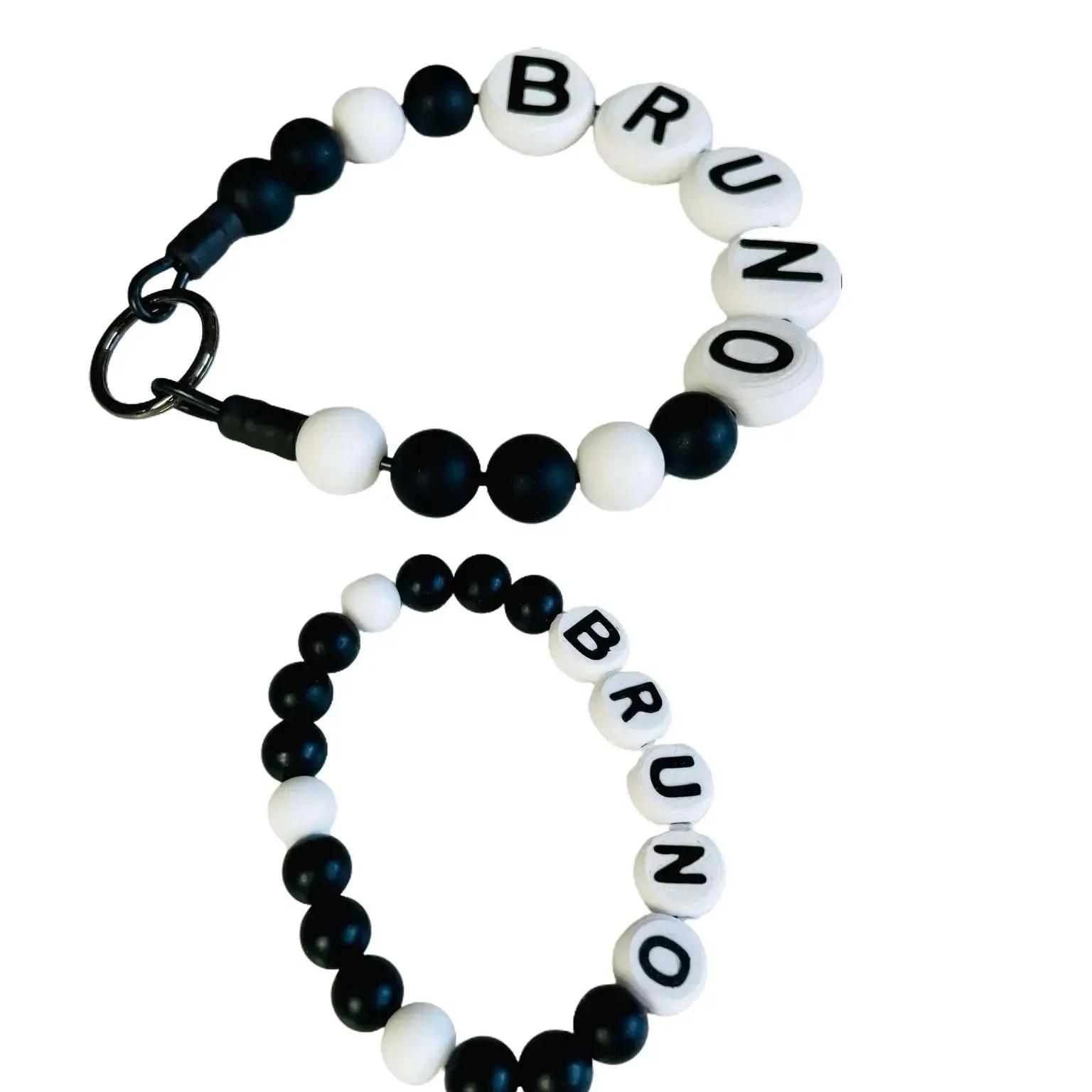 -Matching/ coordinating bracelet will be the most common size, 7 inches unless otherwise specified. Bracelets are made with durable latex- free elastic, 12mm letter beads, and silicone beads. Allow variation between collar and bracelet.