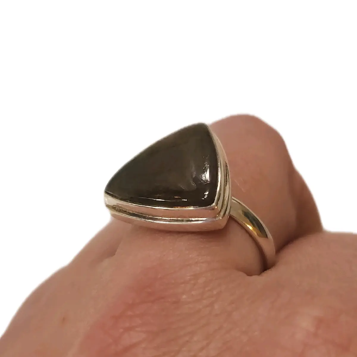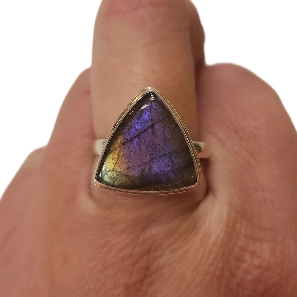 This sterling silver ring is a stunning piece of jewelry that features a unique triangle shape and a multicolor labradorite stone. The ring is designed to make a statement with its eye-catching design and flashy labradorite stone. The stone is known for its iridescent flashes of purple and yellow, which add a touch of elegance to the ring.