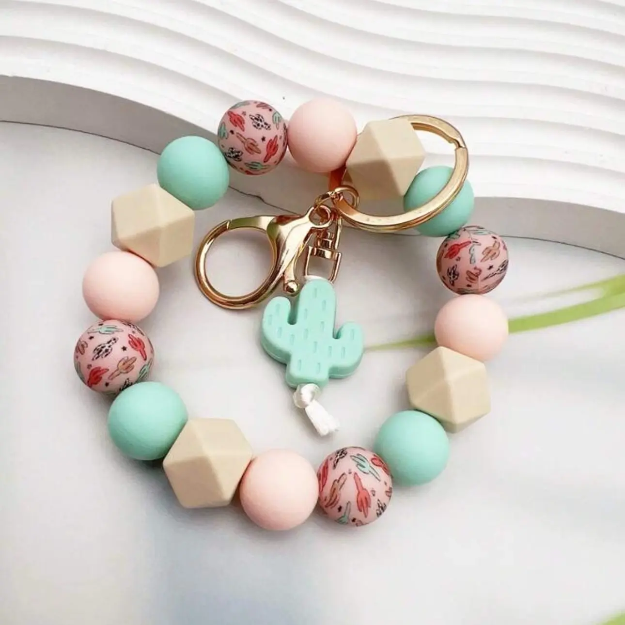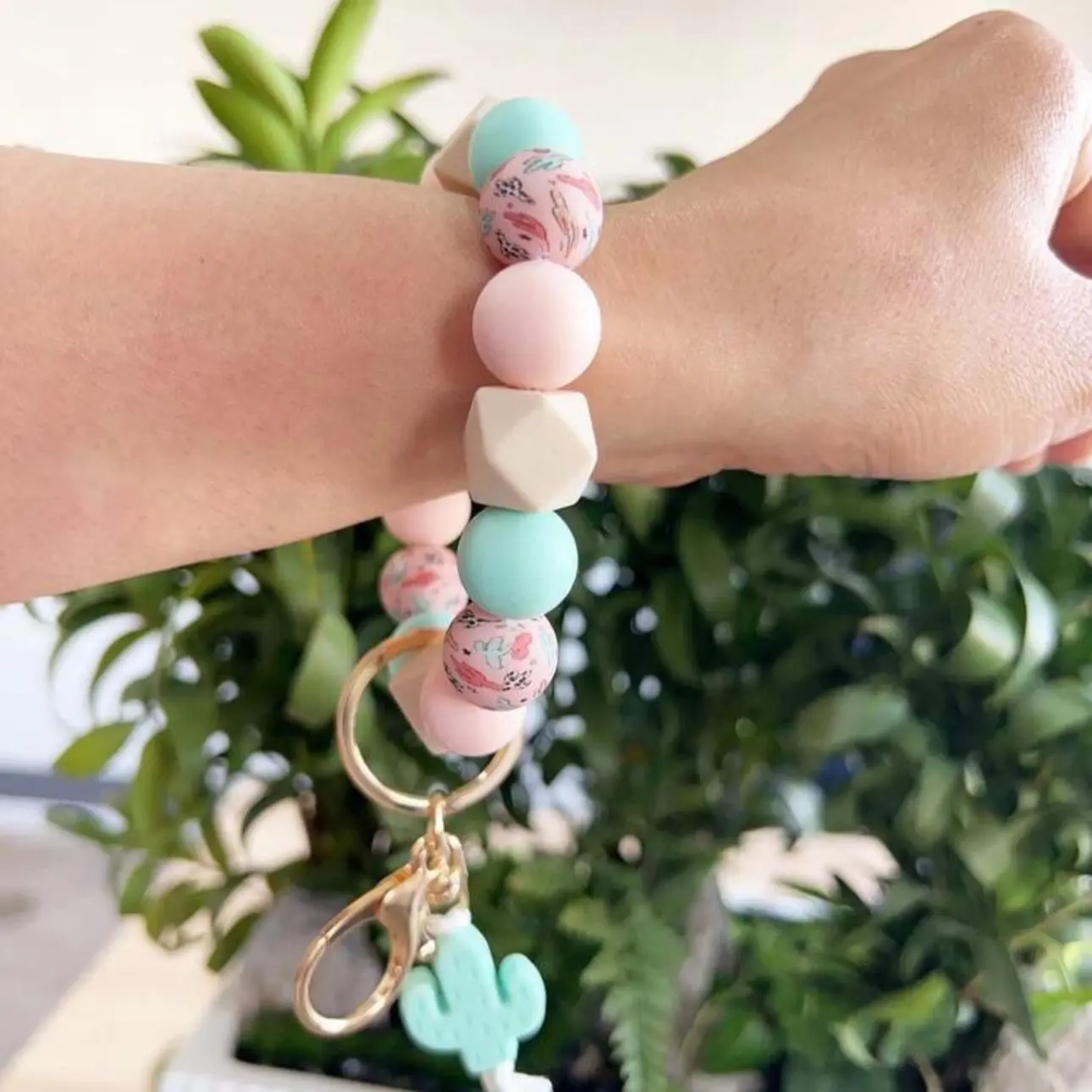 This wrist keychain is a stylish and practical accessory that is perfect for those who are always on the go. The keychain features a Western style cactus print design that adds a unique and trendy touch to the accessory. The silicone beaded material used in the keychain is durable and long-lasting, making it a reliable choice for everyday use.