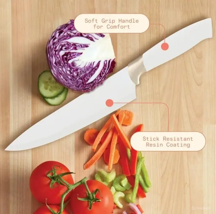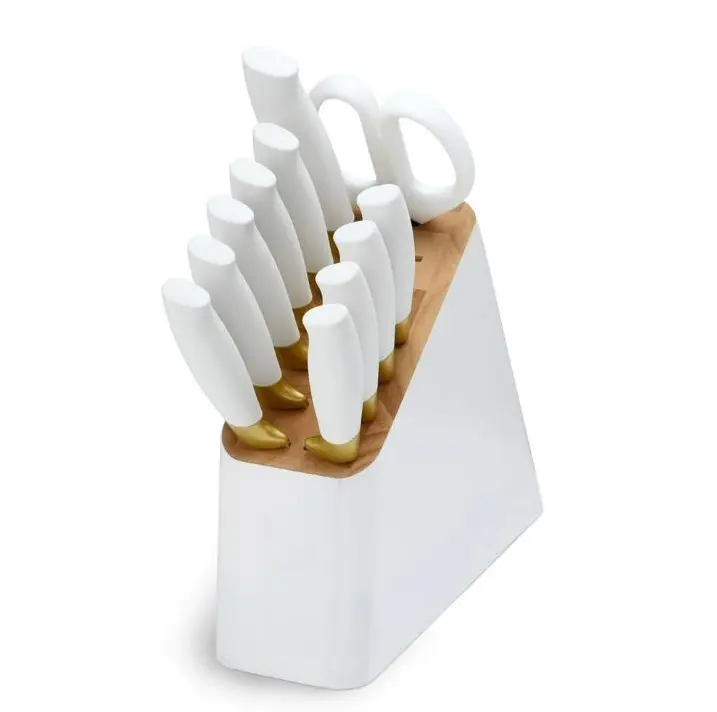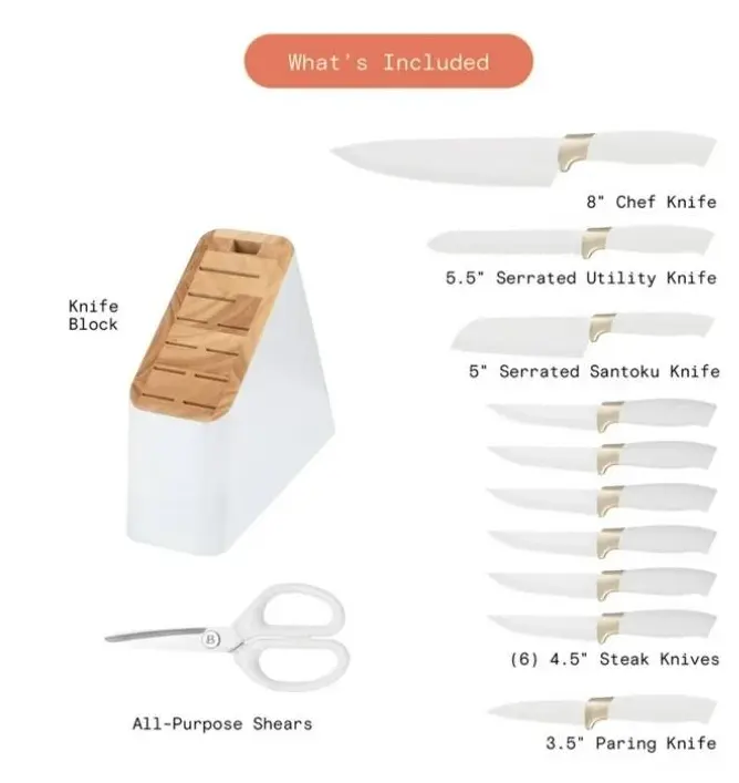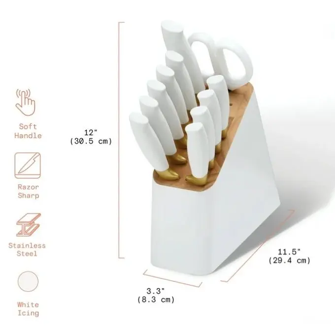 Here is an overview of the 12 Piece Stainless Steel Knife Block Set, Soft-Grip Handles, White Icing by Drew Barrymore: