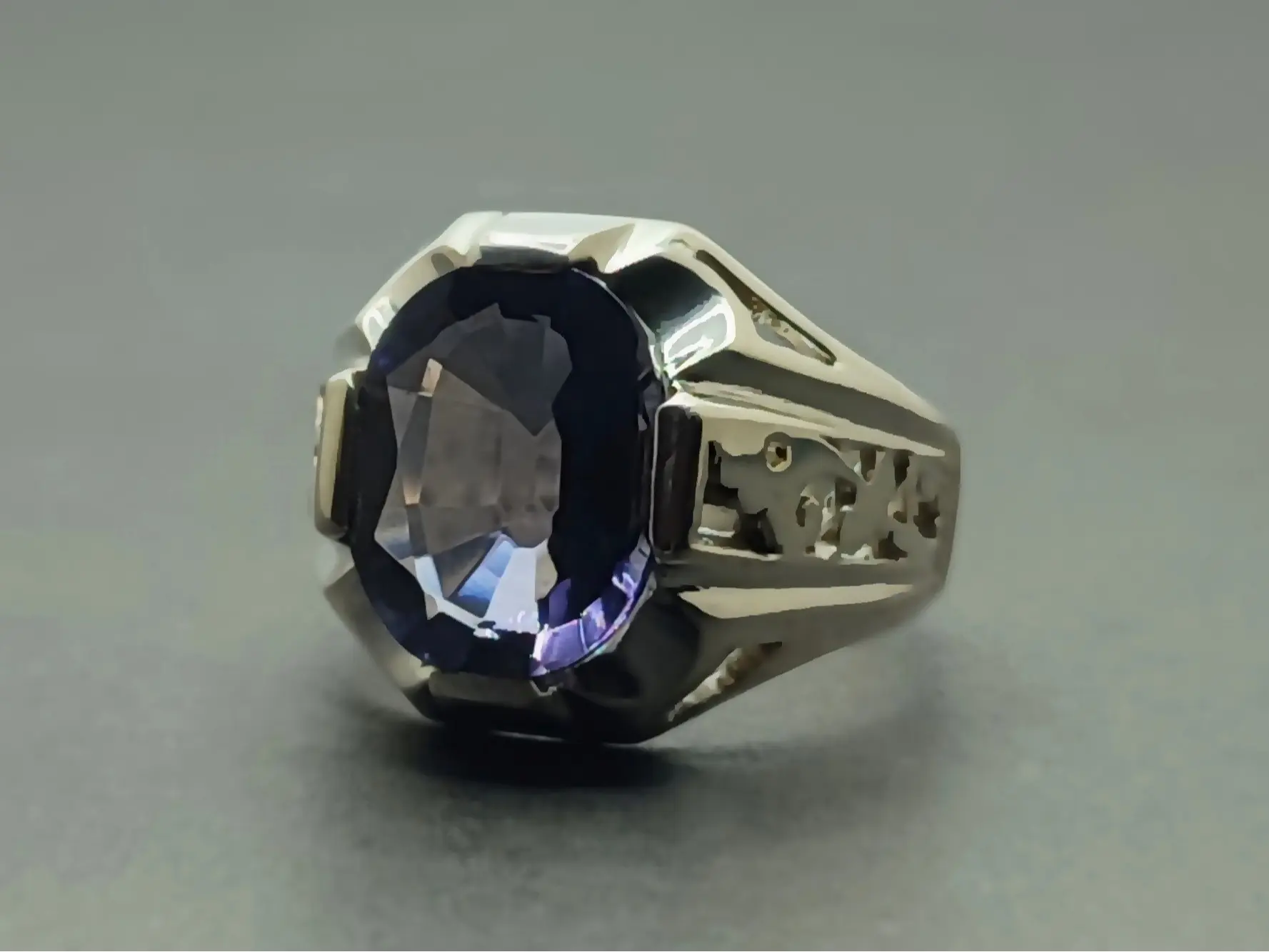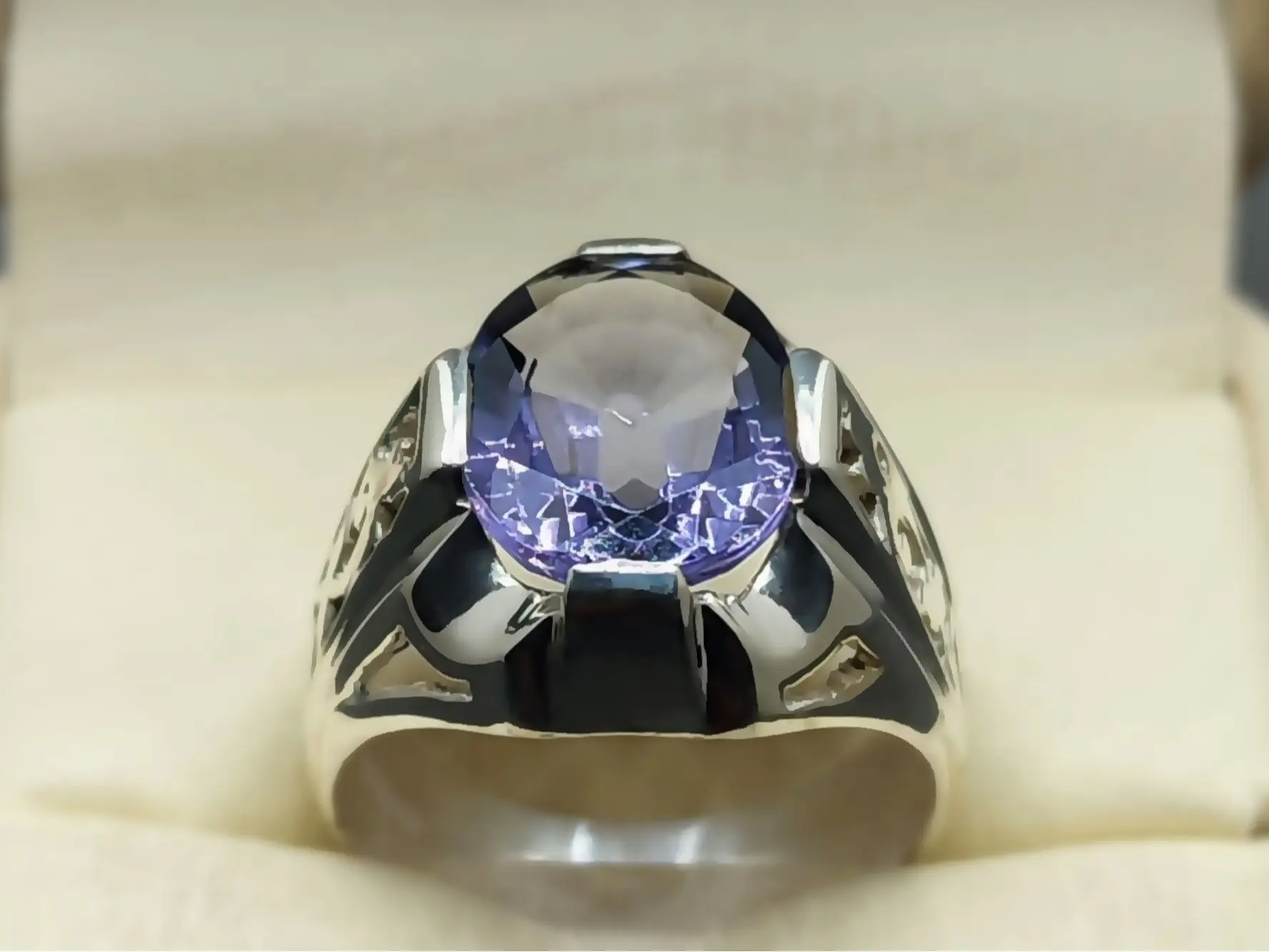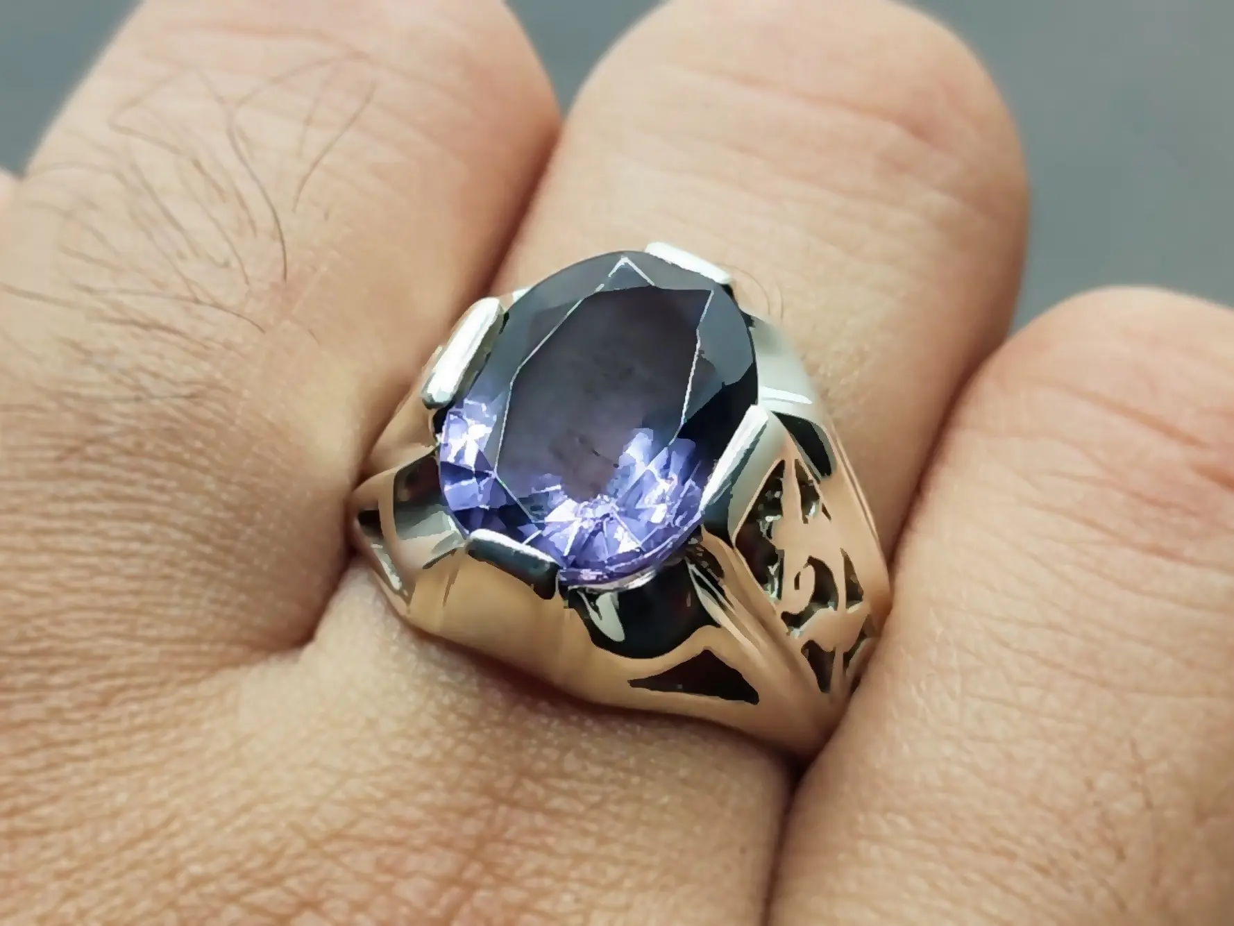 Oval Cut 10 Carat Deep Purple Lab Amethyst Sterling Silver 925 Handmade Mens Lattice Ring