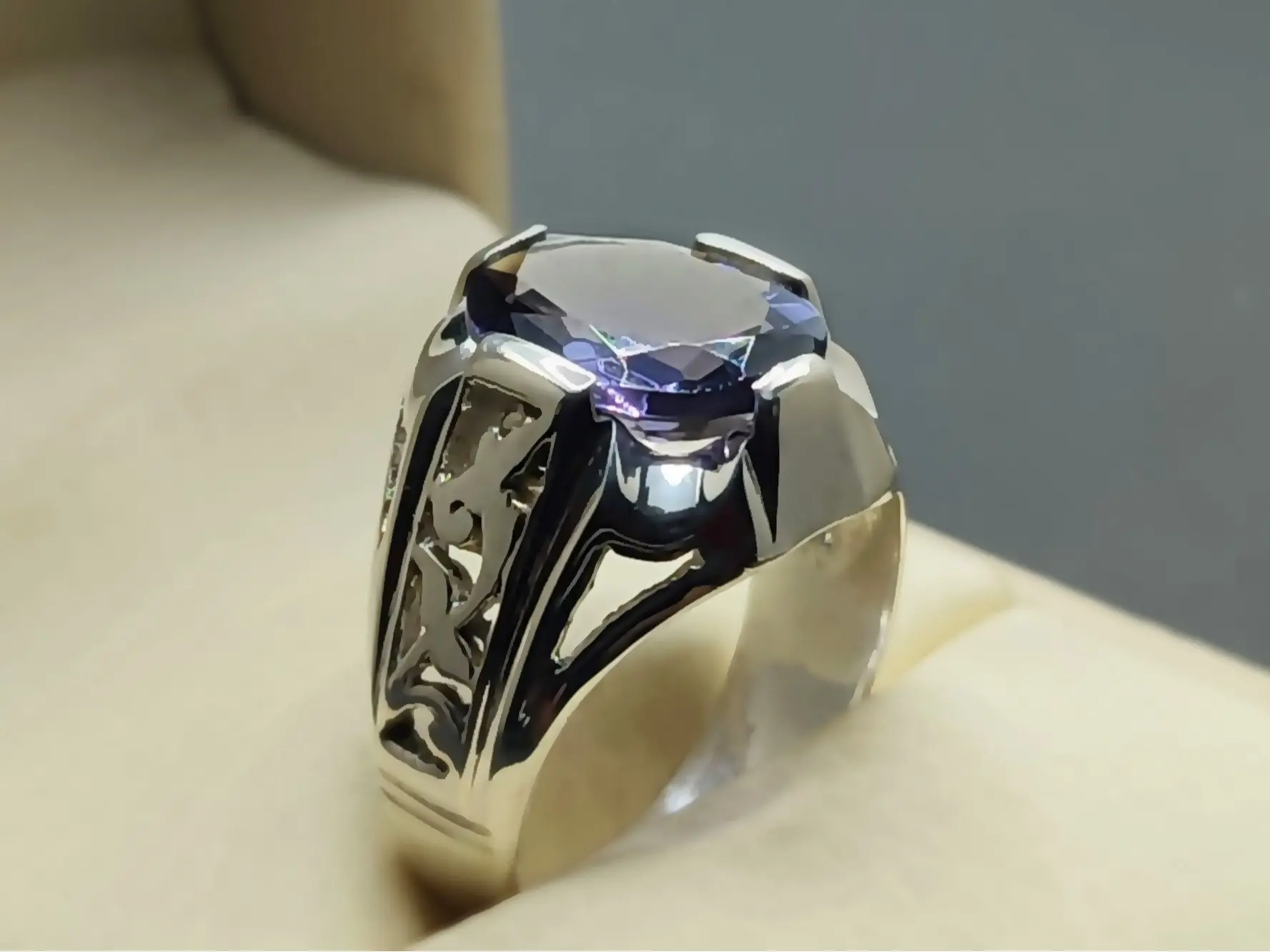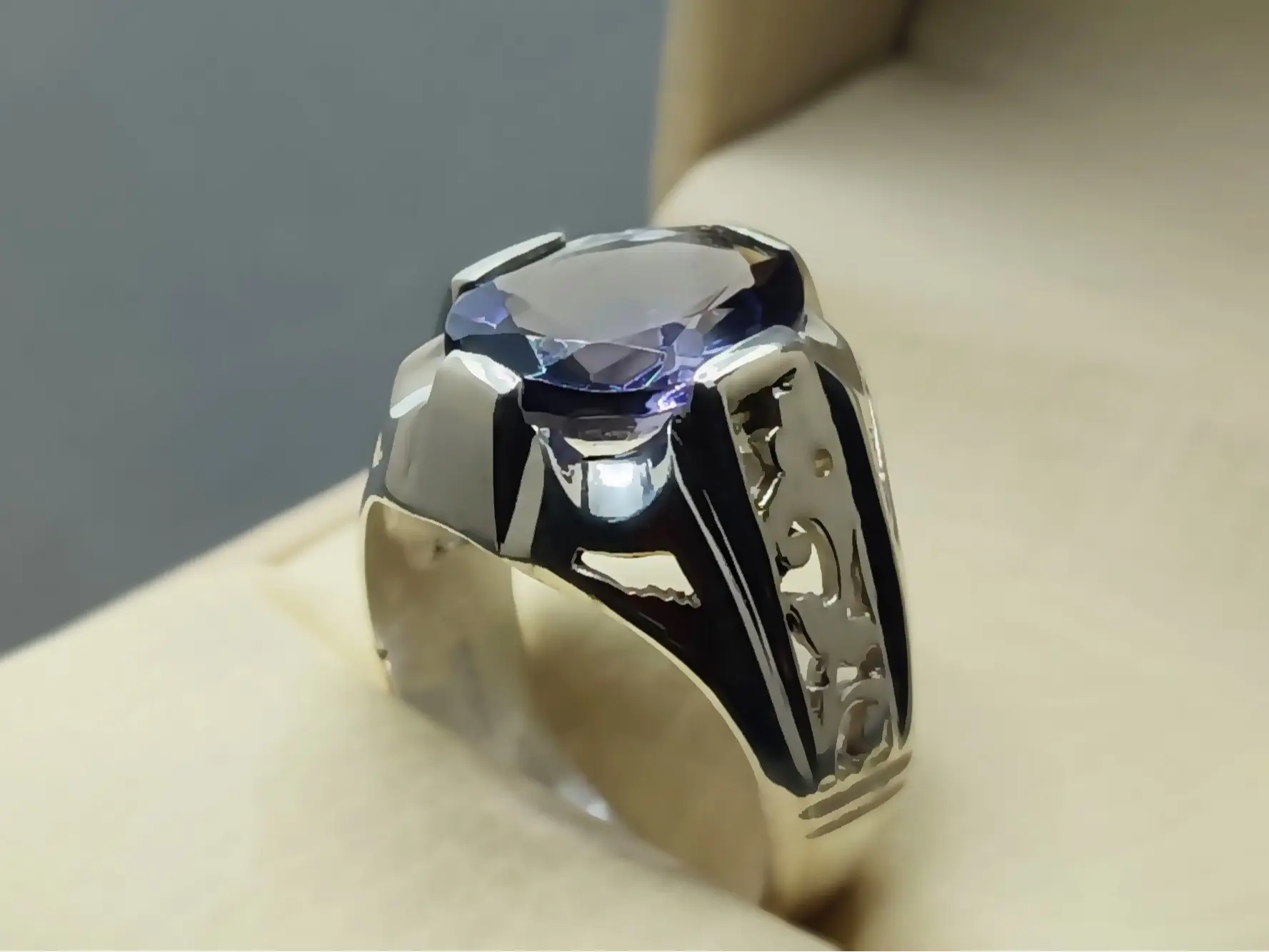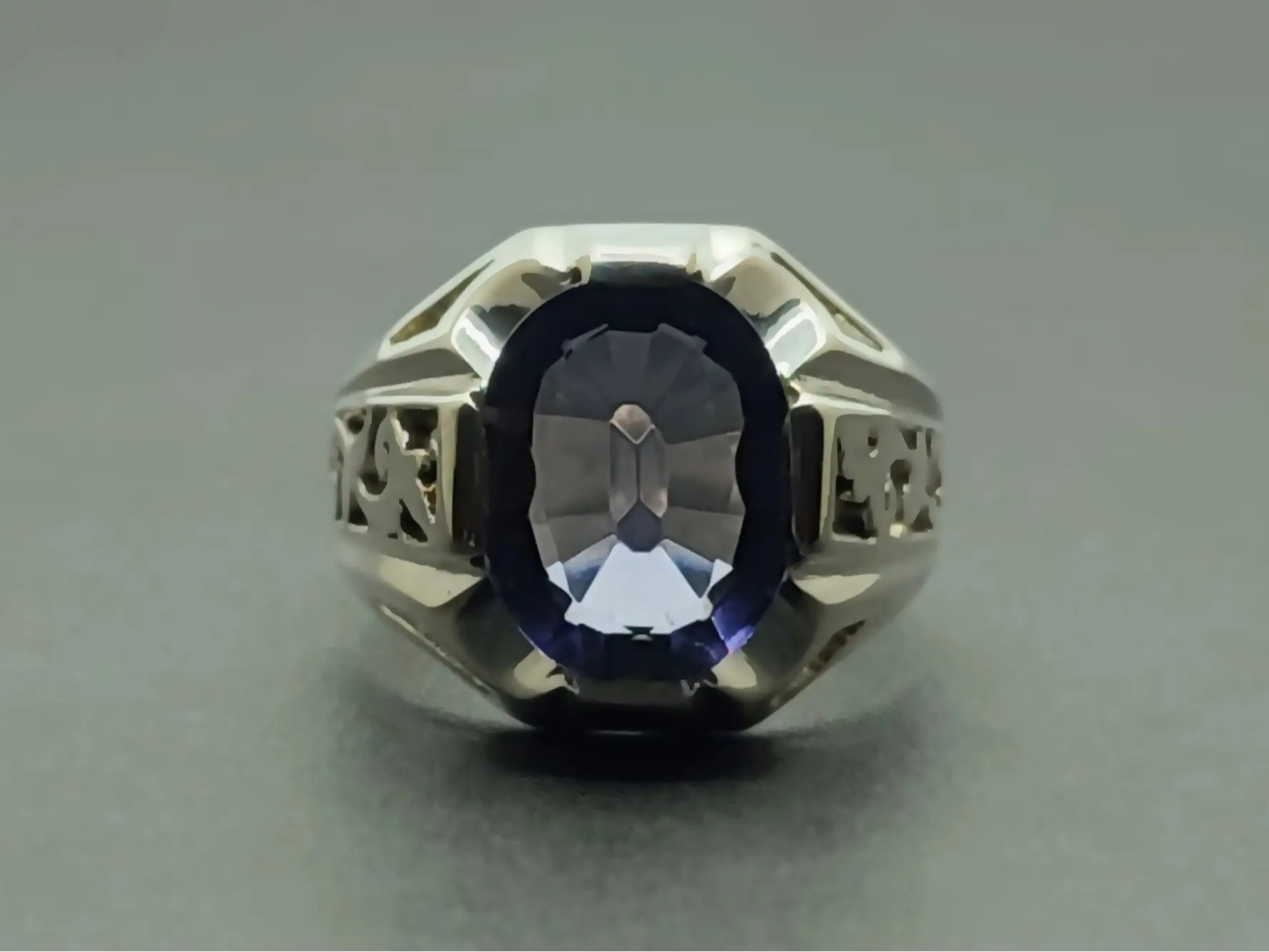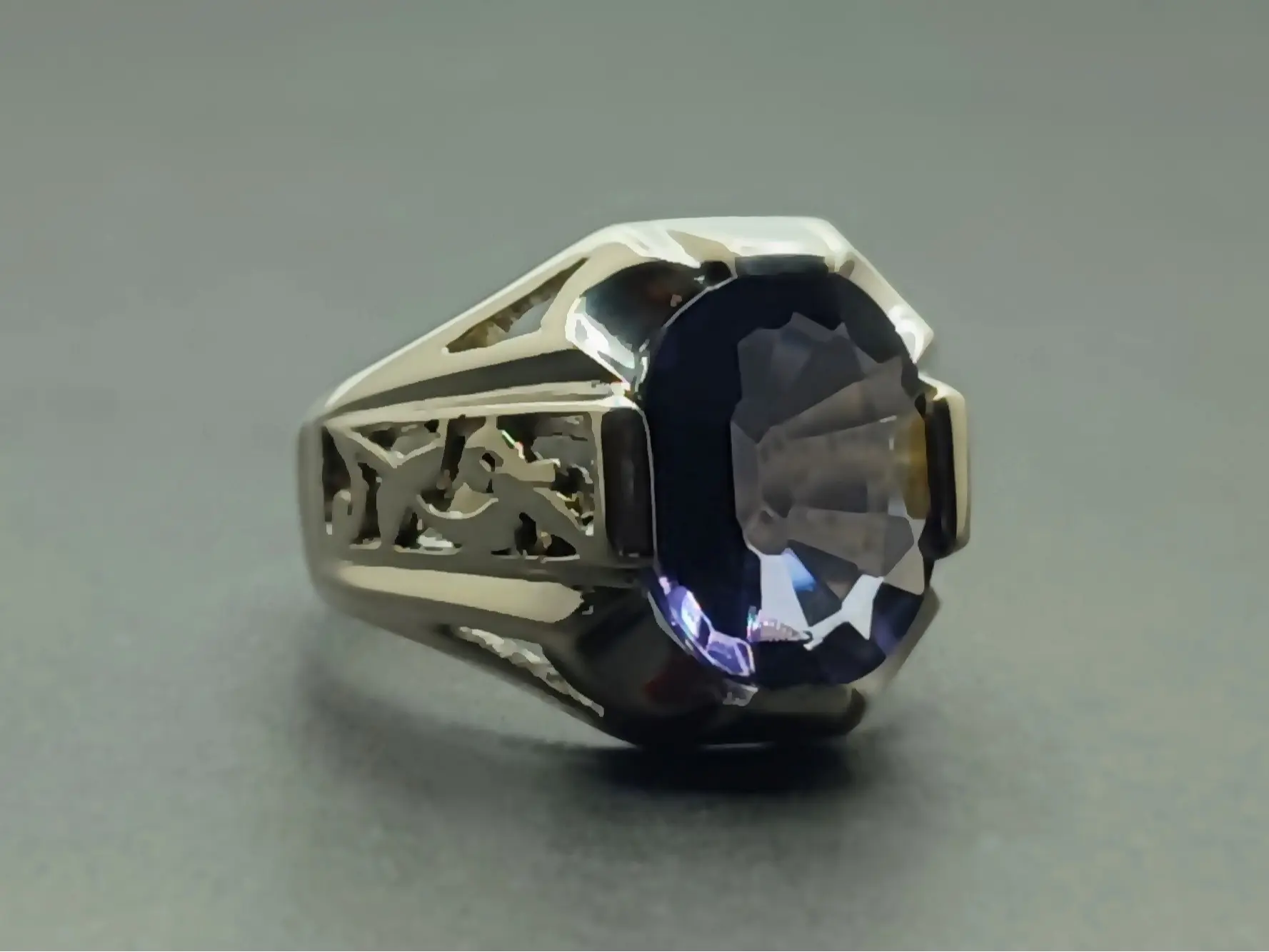 Oval Cut 10 Carat Deep Purple Lab Amethyst Sterling Silver 925 Handmade Mens Lattice Ring