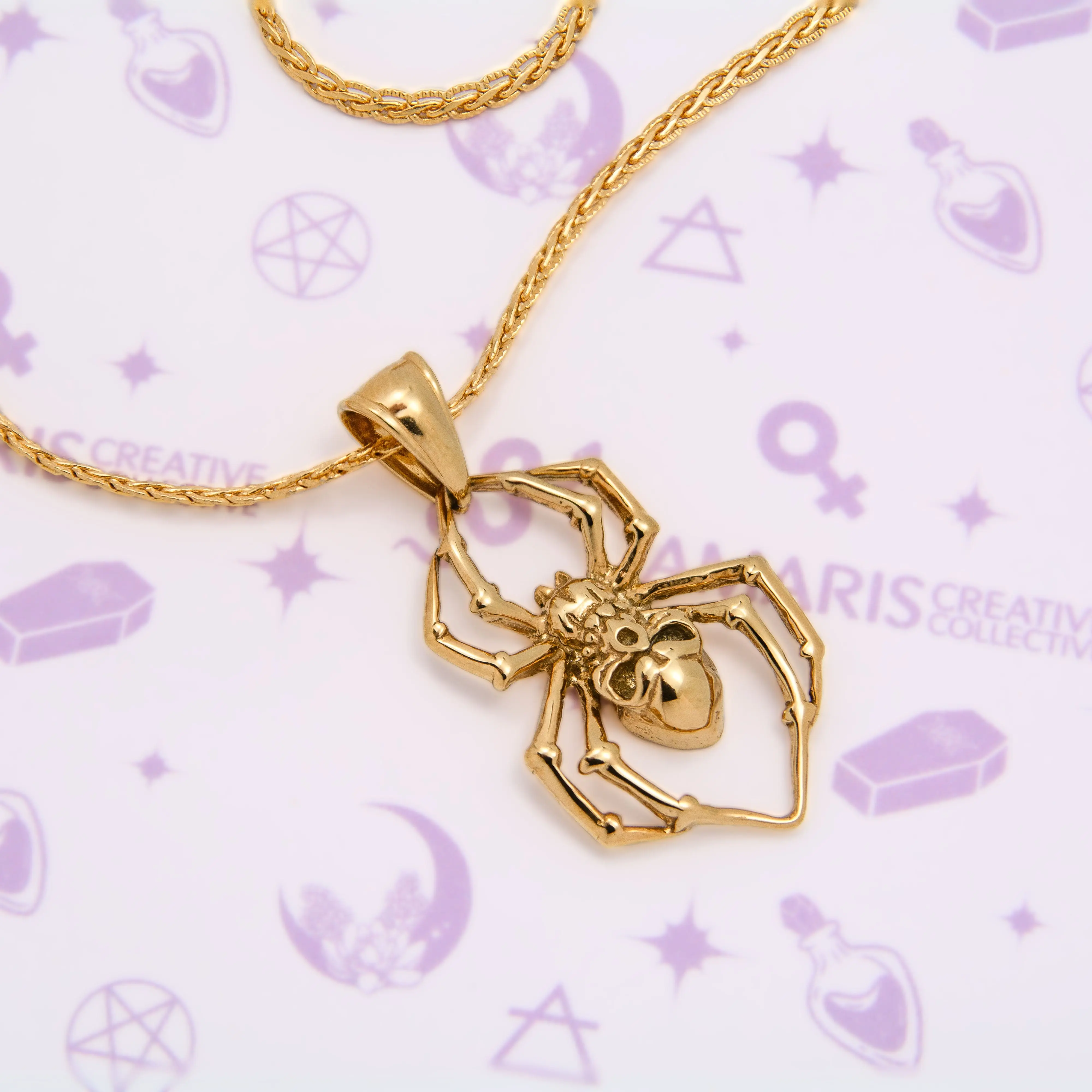 This 14K gold-filled necklace has a large widow spider pendant with a haunting face of death on its back. Paired with an intricately detailed curb scroll chain, it's the perfect addition to your spooky ensemble!