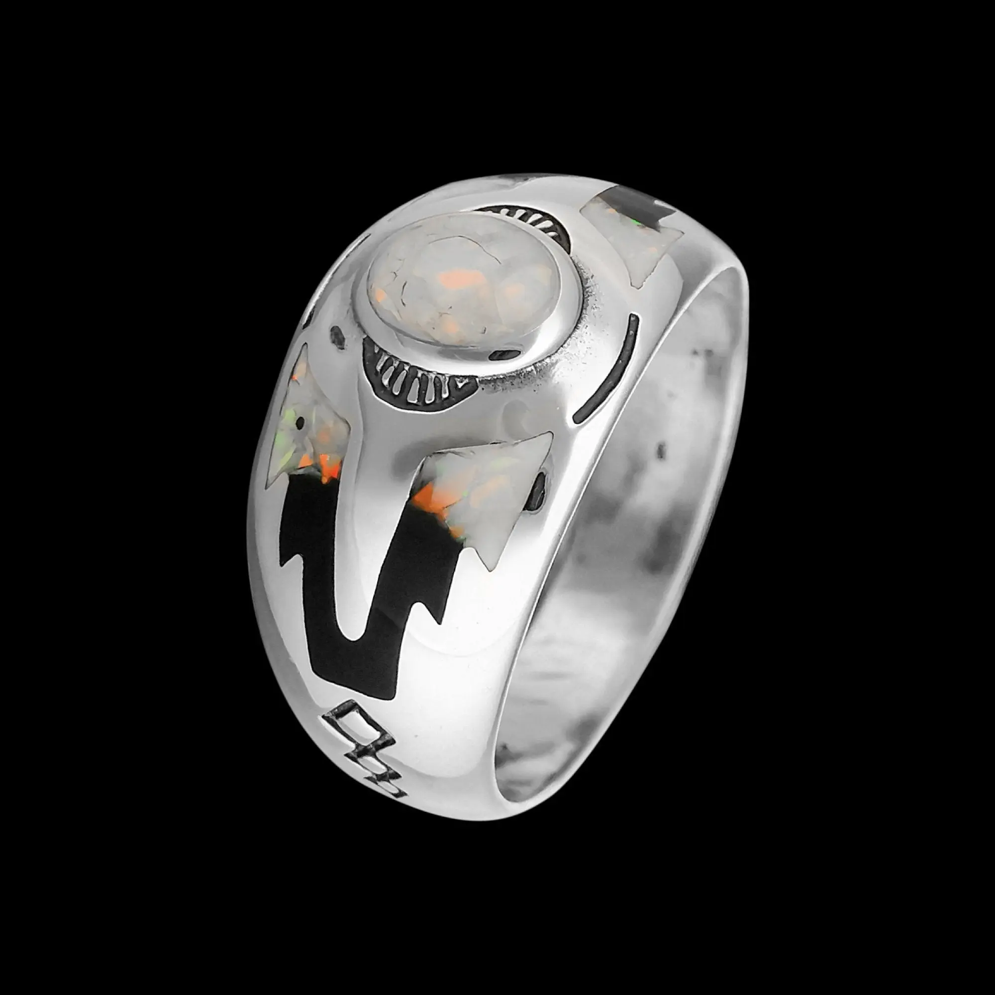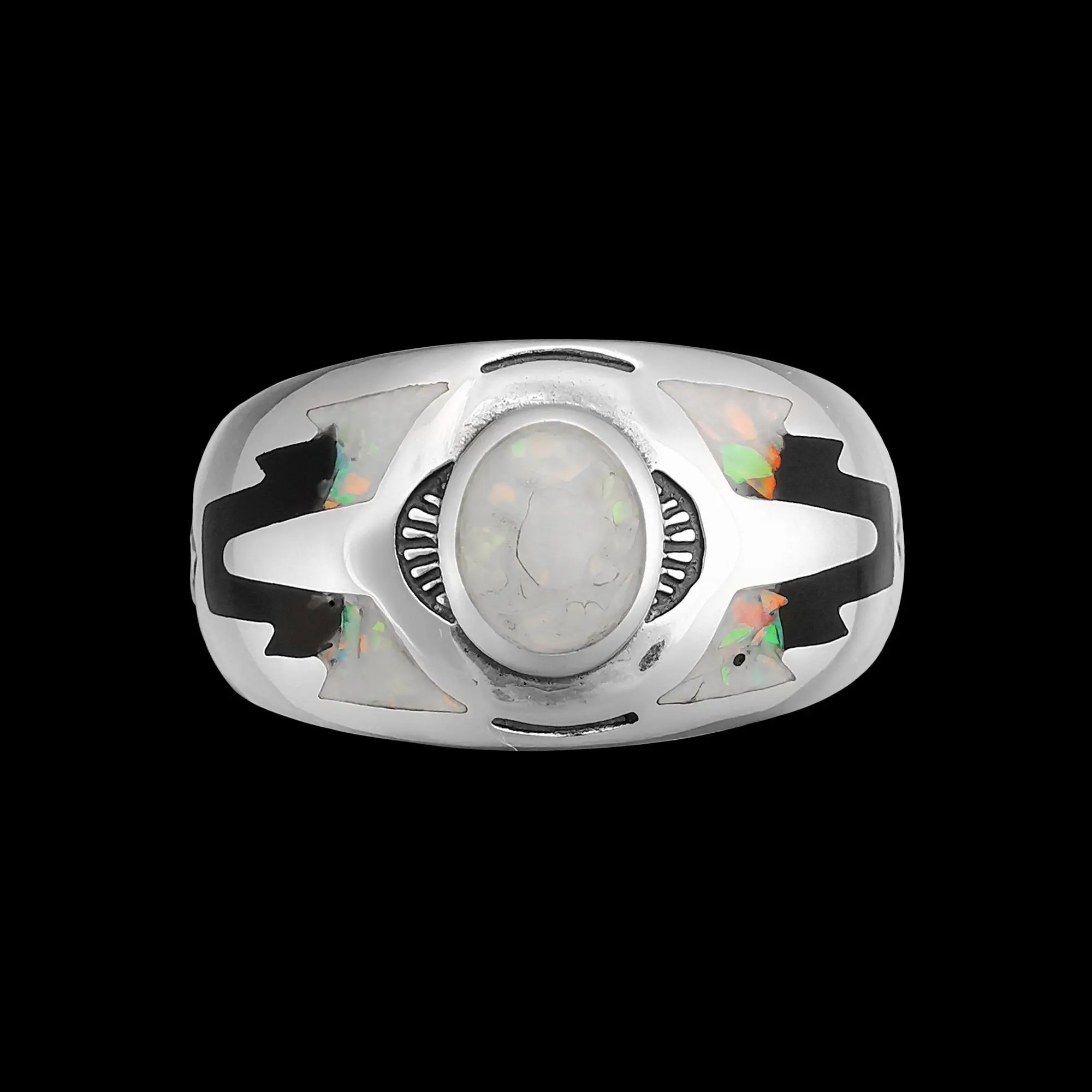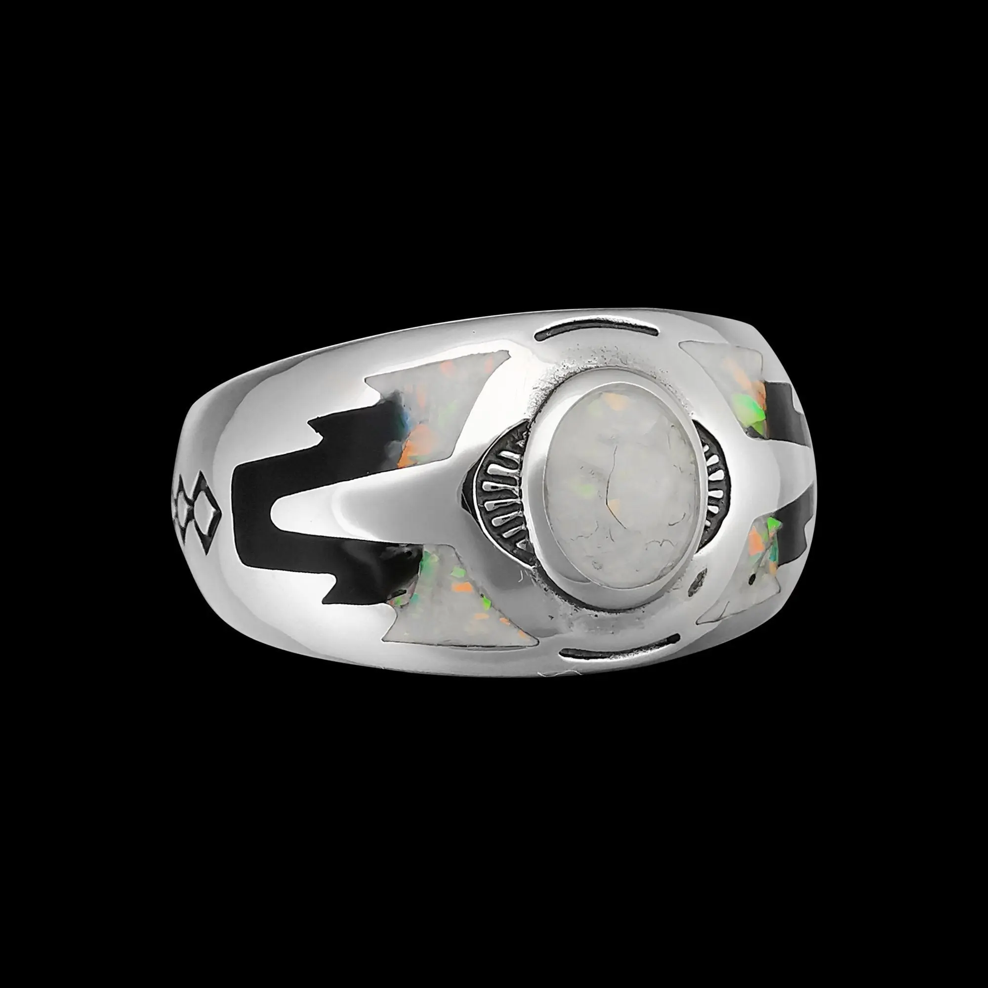 Sterling silver Navajo designed ring with inlaid cultured crushed White Fire Opal and a black resin inlay, and tied together with intricate stamping along the band and stones. This ring measures approximately 1/2" tall and 1" wide for the main stone stetting/artwork.