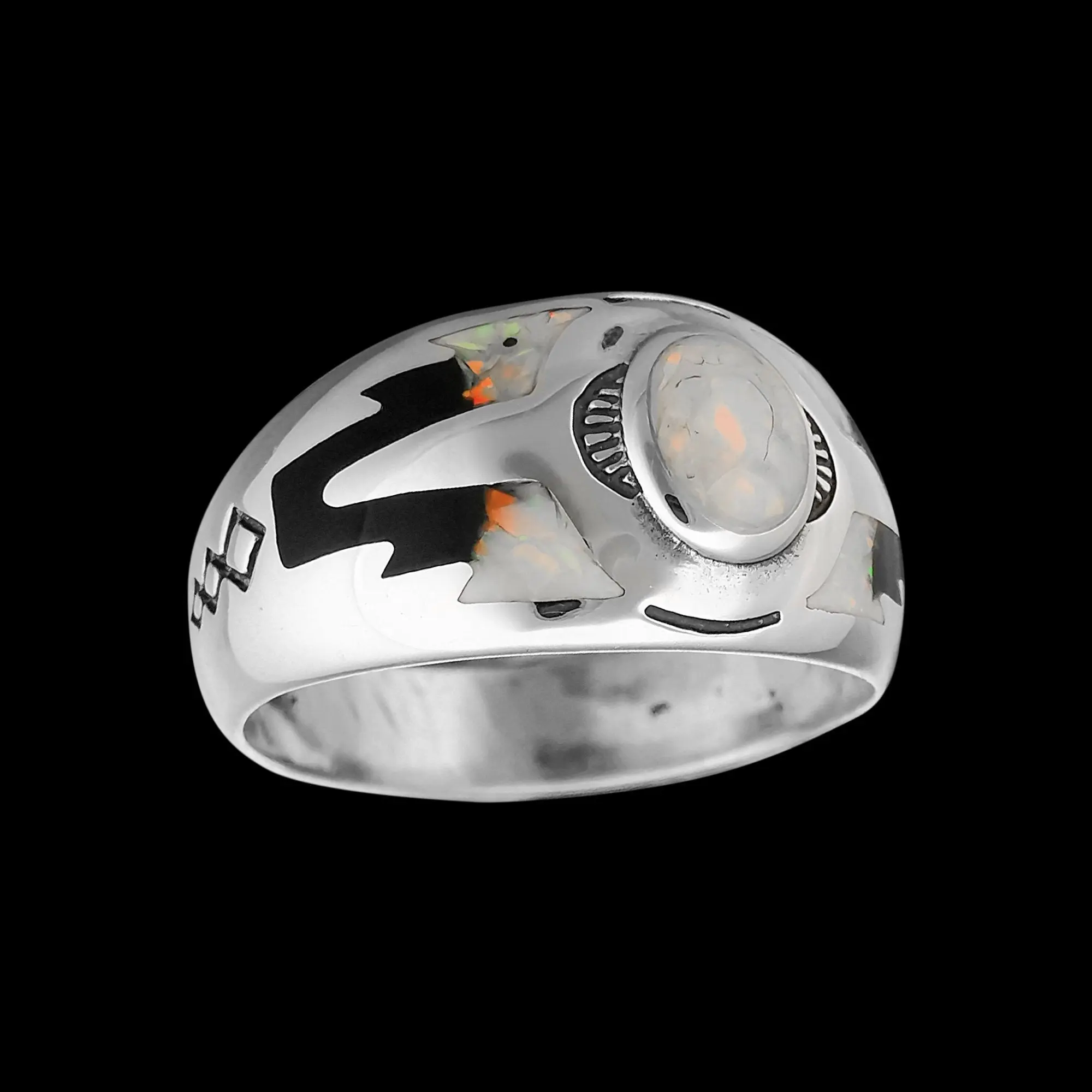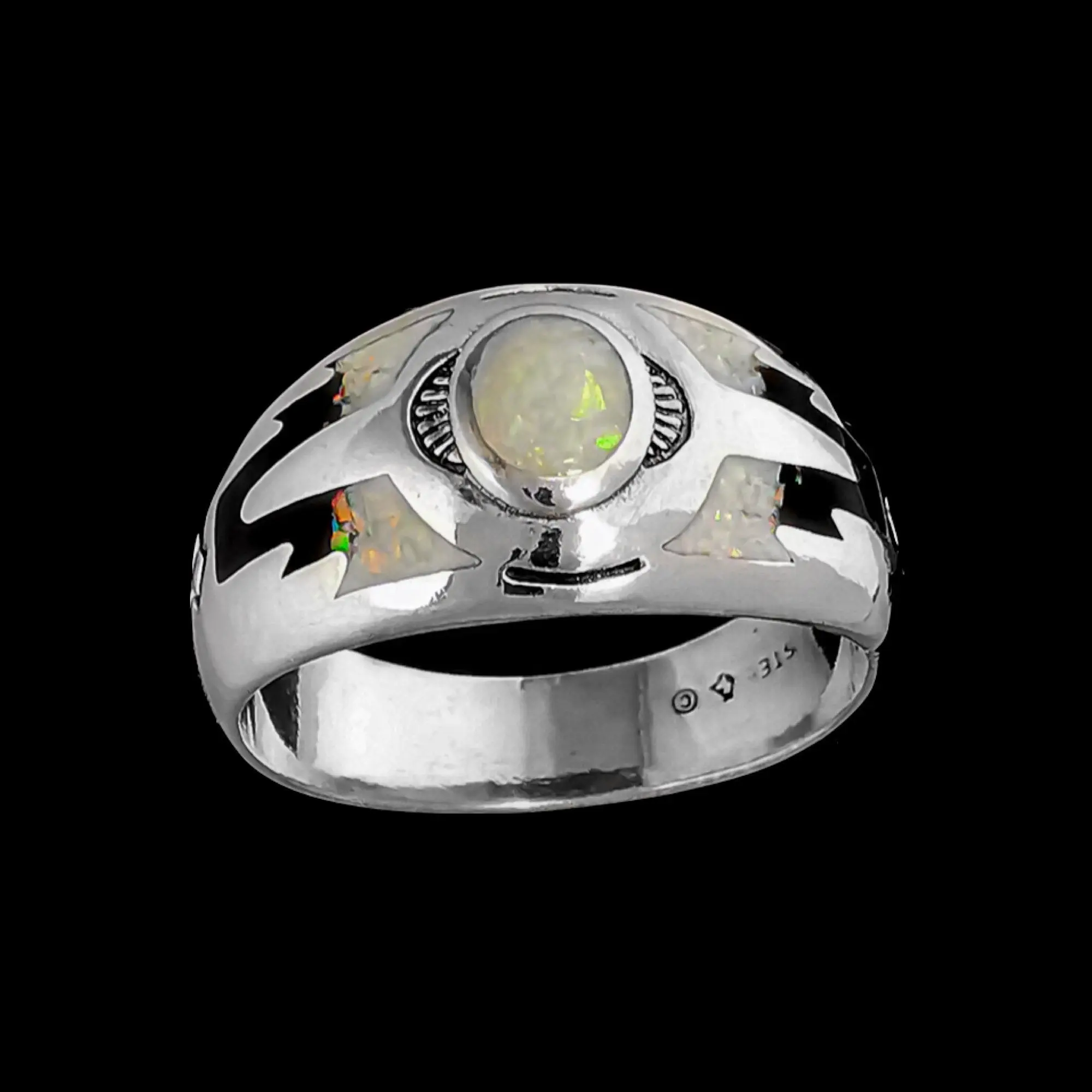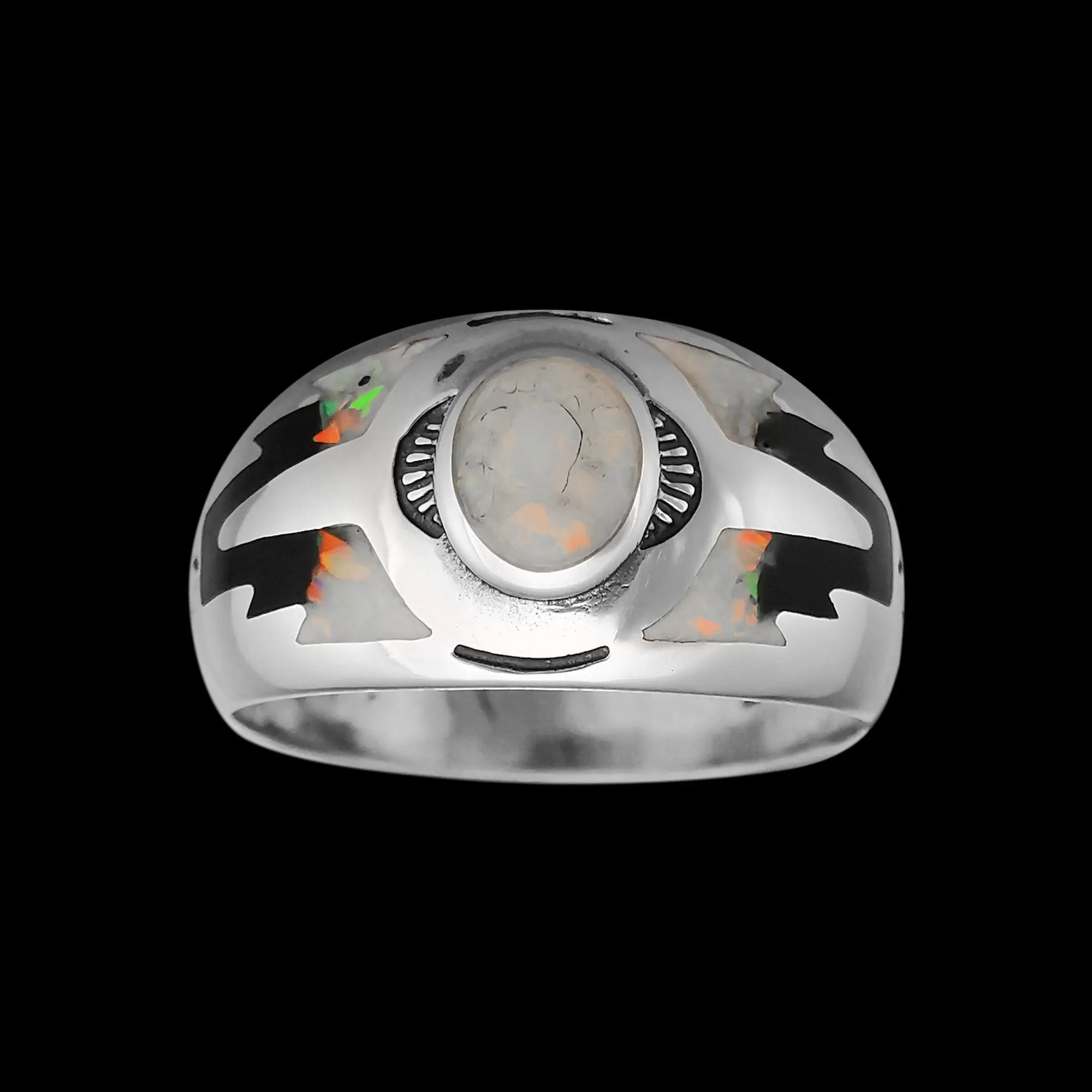 Sterling silver Navajo designed ring with inlaid cultured crushed White Fire Opal and a black resin inlay, and tied together with intricate stamping along the band and stones. This ring measures approximately 1/2" tall and 1" wide for the main stone stetting/artwork.