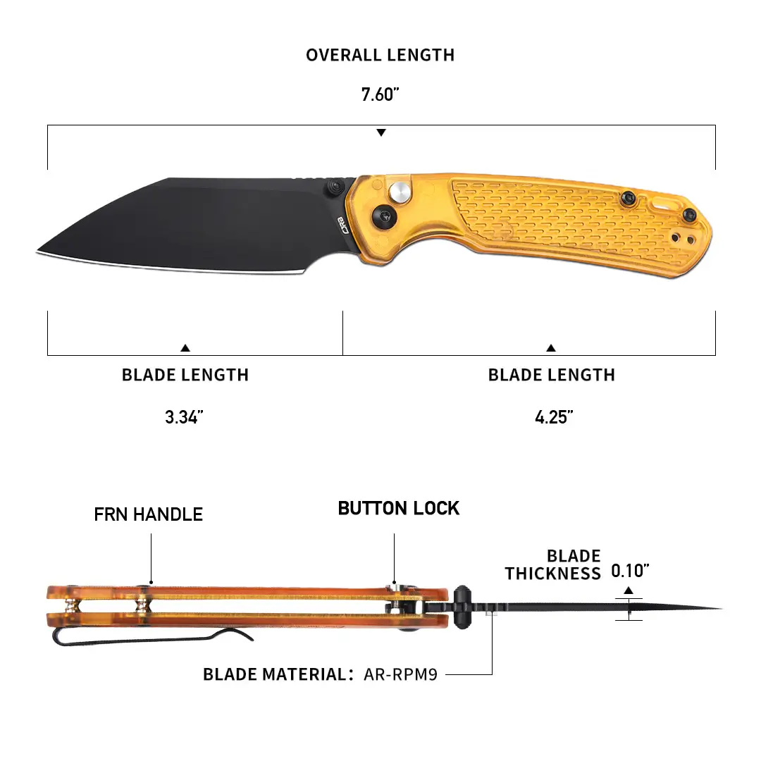 ·Sharp Cutting Edge: The CJRB Pyrite-Light folding pocket knife features a 3.34'' AR-RPM9 steel blade with a flat grind design, ensuring excellent edge retention and durability, making it an ideal choice for various cutting tasks. Ideal for pocket knife enthusiasts