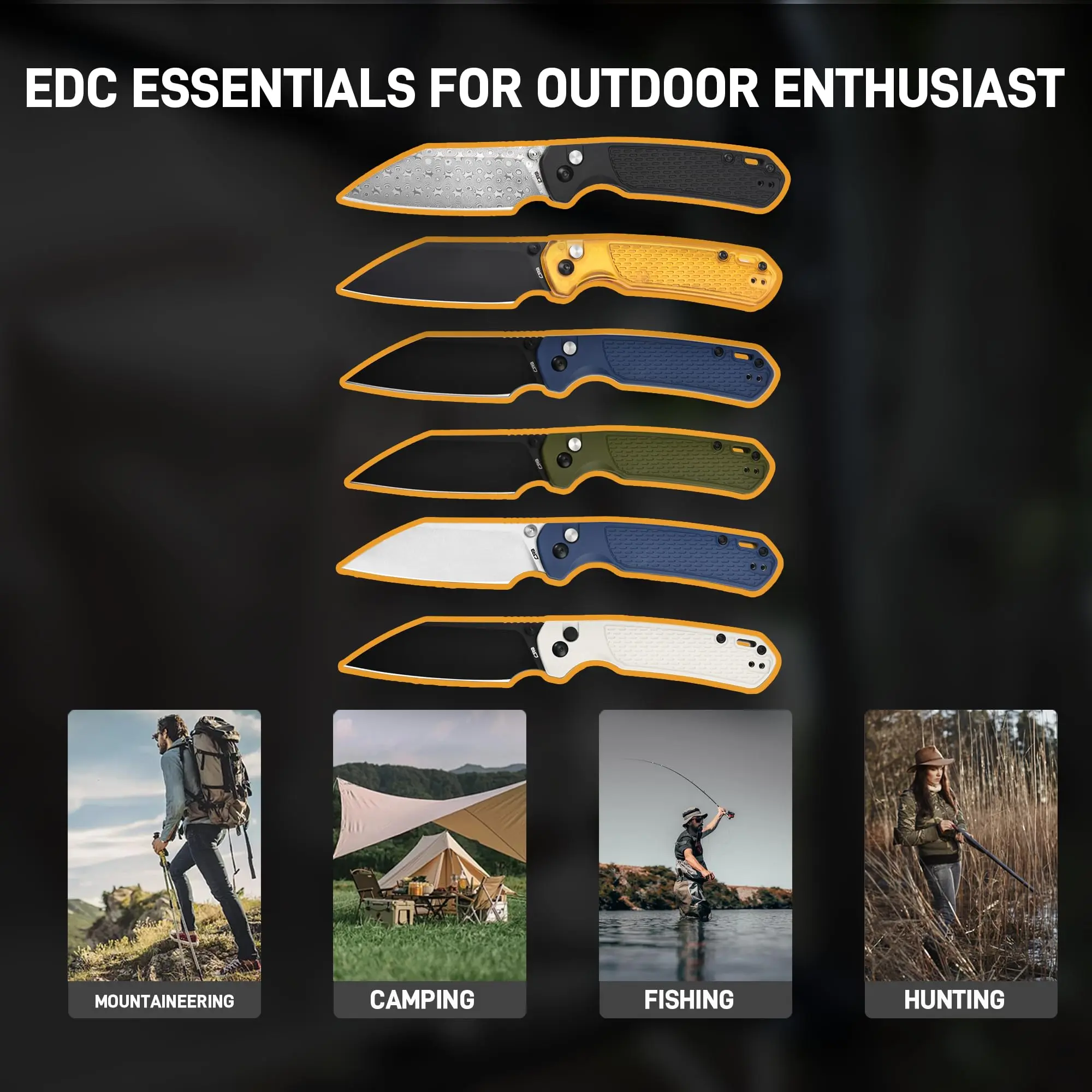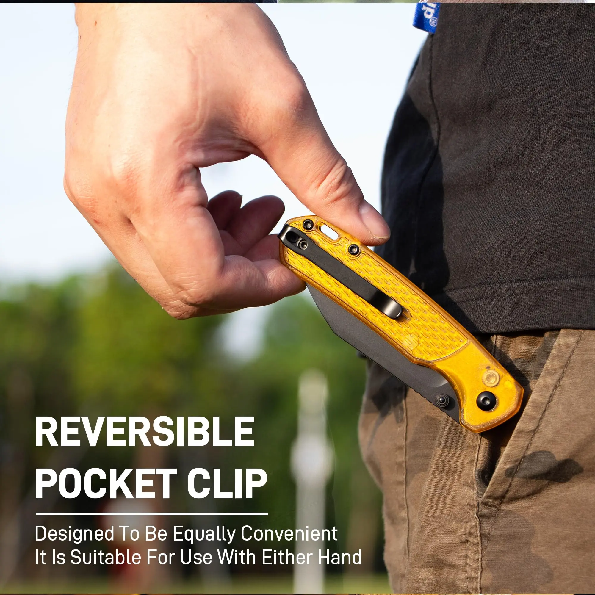 ·Stylish Amber Handle: With an amber-colored FRN handle, this EDC pocket knife is lightweight and stylish, combining practicality with elegance. Designed for ergonomic comfort and secure grip, it's a must-have folding knife for everyday carry