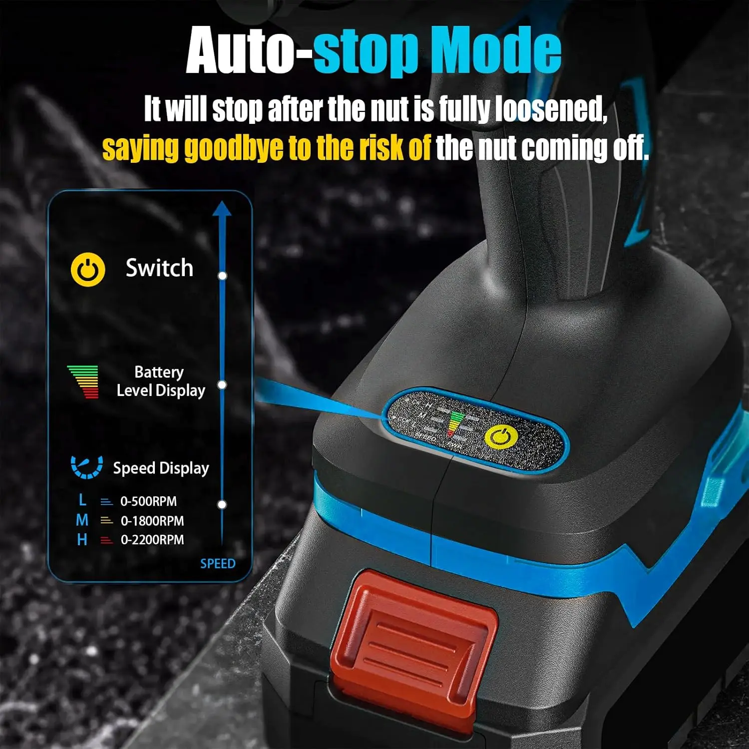 [Ergonomic Comfort Grip]:The cordless electric wrench adopts advanced ergonomic design, and the shape of the grip fits the curve of the hand. It is made of high-quality, soft and non-slip rubber material, which feels comfortable. You can hold it firmly even if your hands are sweating. The ergonomic comfort grip of this electric wrench truly achieves the perfect combination of comfort and practicality.