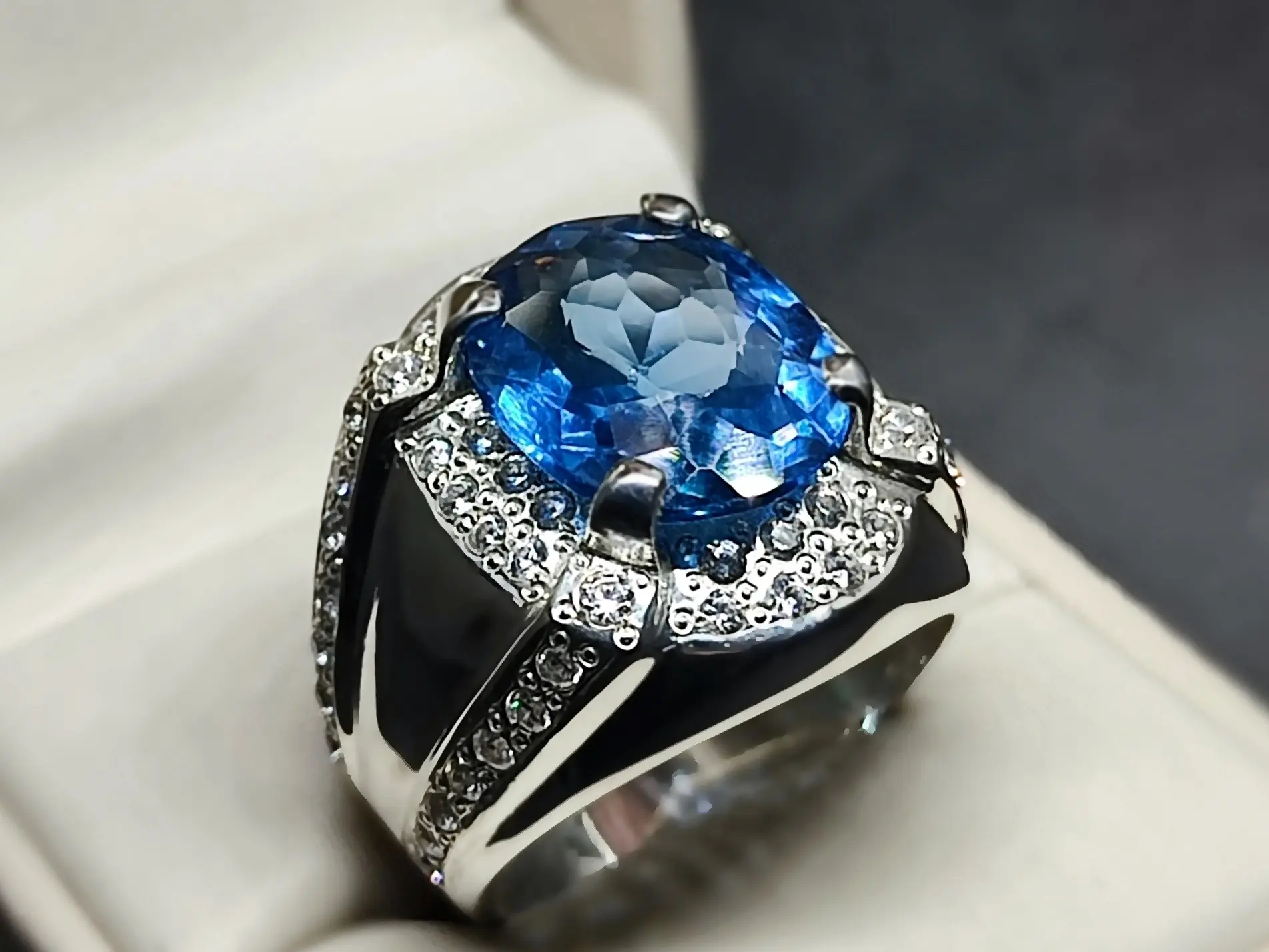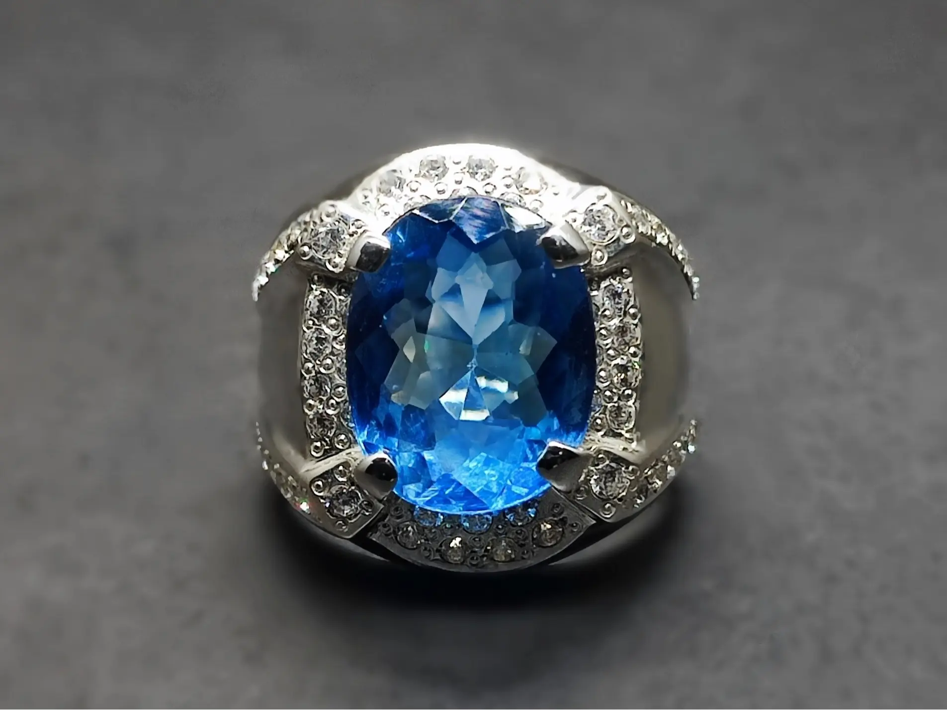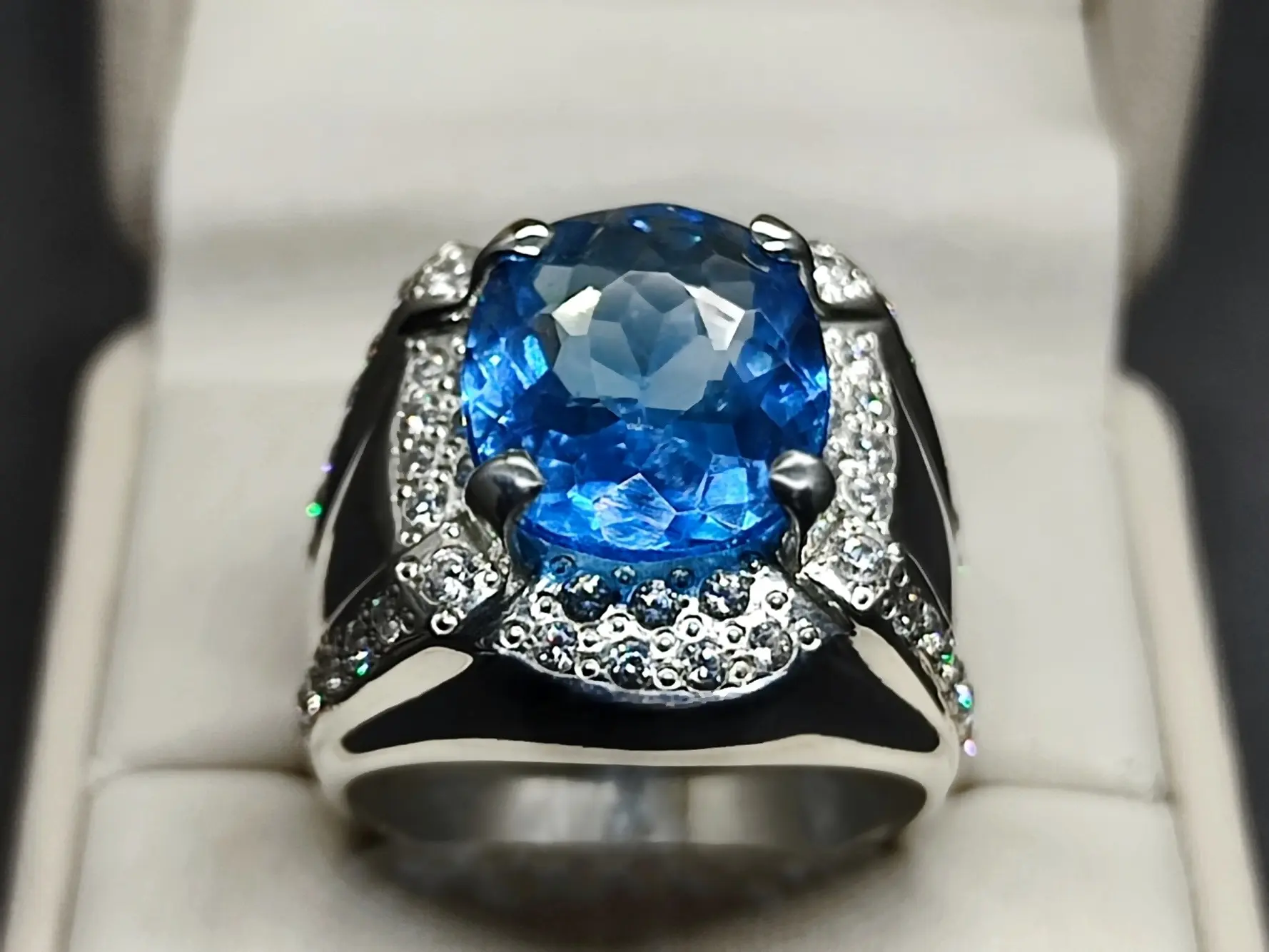 ✨ Discover the beauty of this handmade men's ring, featuring an oval cut 24-carat deep blue lab-created topaz. Originating from Thailand, this gemstone adds a touch of sophistication. The dimensions are precisely 20 x 14 x 8 mm, making it a striking piece. Crafted from sterling silver 925, the ring weighs between 18 to 20 grams. It comes with a ring box, ensuring safekeeping.