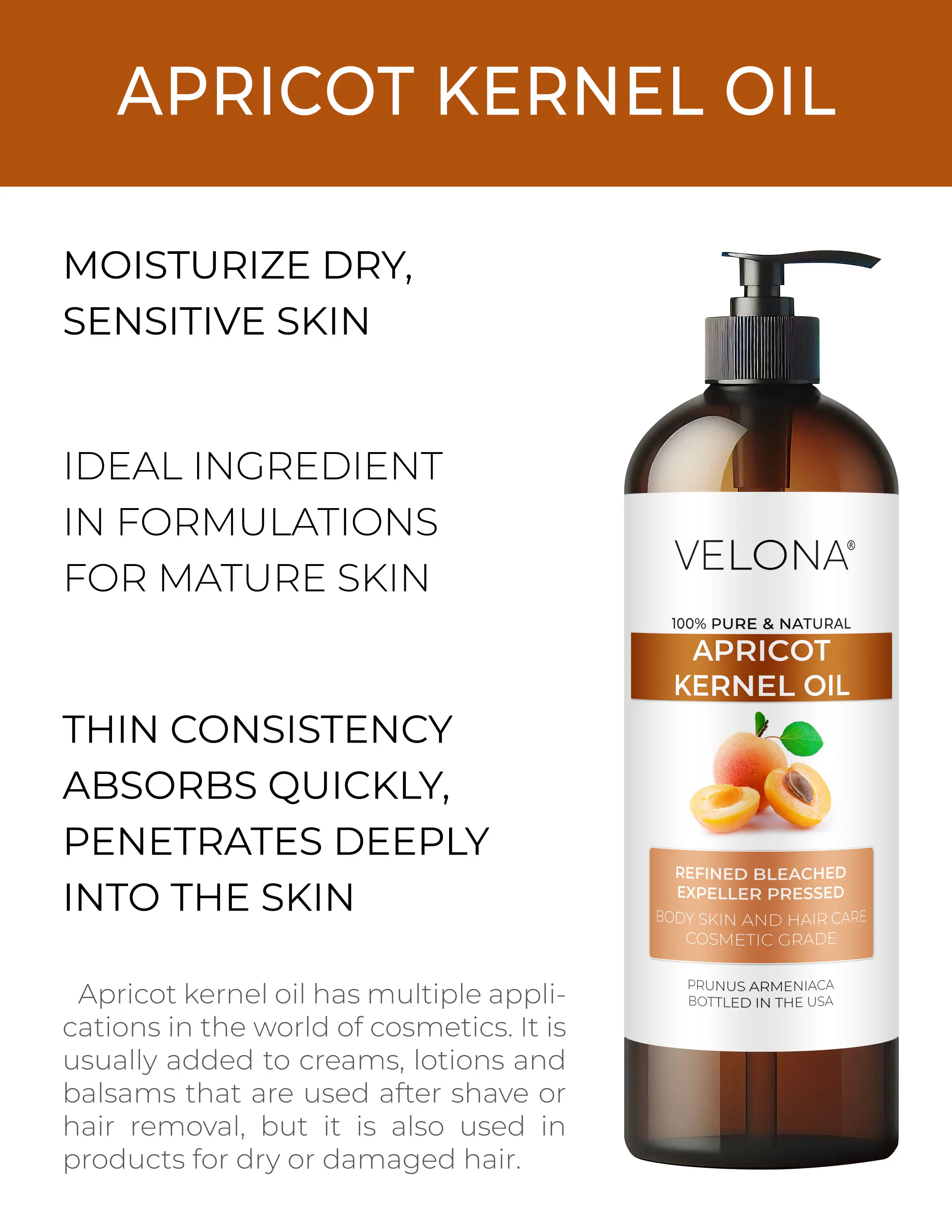 ·Apricot Kernel Oil: 100% Pure and Natural Carrier Oil. Refined. Expeller Pressed. Not Diluted, Non-GMO, No Additives, No Fragrance, Chemical Free, Alcohol Free.