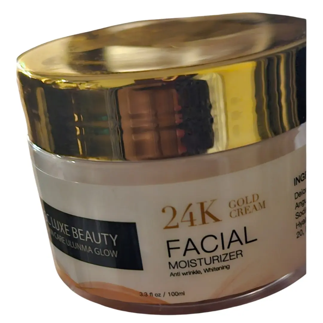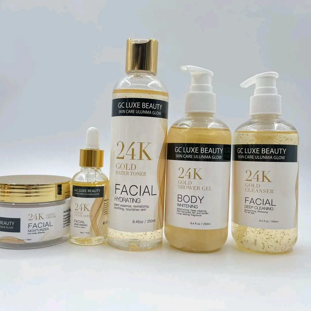 Our 24k comes in 5 pieces set *GOLD SHOWER GEL *GOLD FACILA DEEP CLEANING *GOLD FACILA WATER TONER *GOLD CREAM FACIAL MOISTURIZER DAY & NIGHT *GOLD FACILA SERUM Comprehensive facial and skincare with gold particles GLOW BEYOND GOLD *Smooths lines,tightens skin, boosts elasticity. *Renews skin, enhanced repair reveals vitality. *Hydrates...