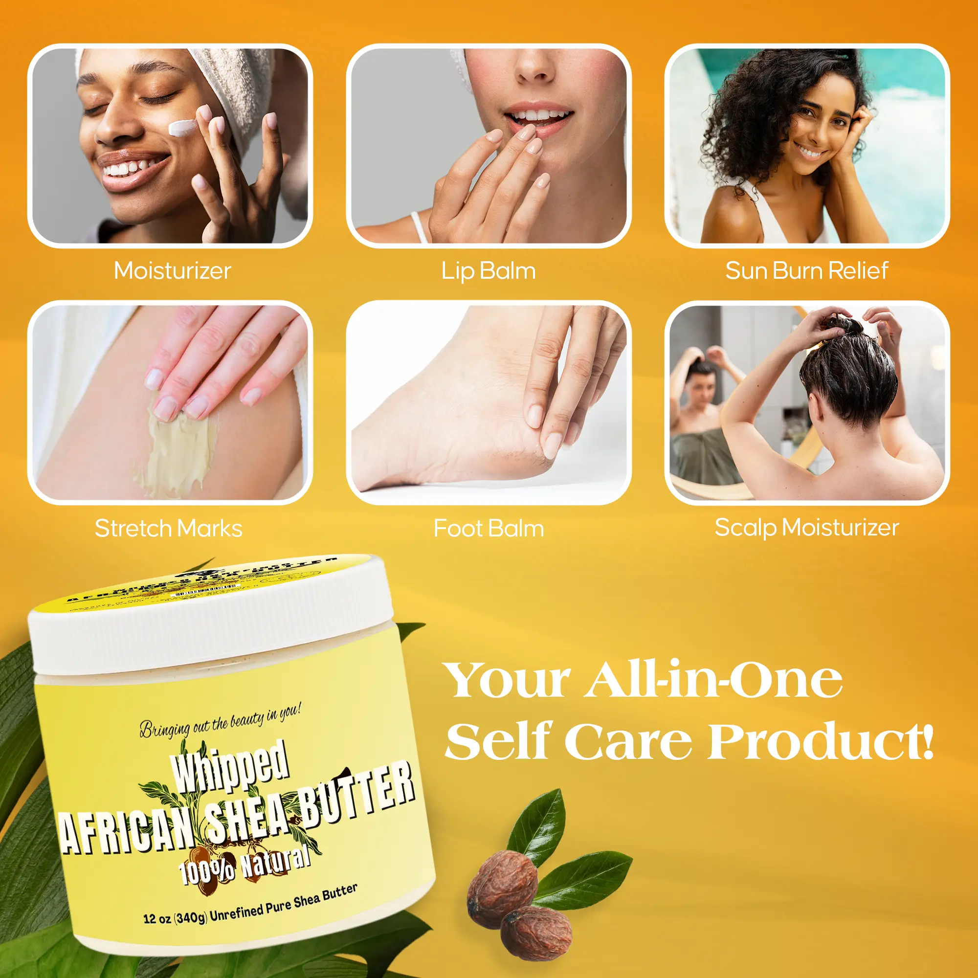 ·Premium Whipped Shea Body Butter: Enjoy the luxurious feel of African Shea Butter, expertly handcrafted in Ghana, West Africa. Our whipped shea butter, enriched with vitamin E and F, creates a protective moisture barrier, pampering your skin from head to toe for an ultimate moisturizing experience.