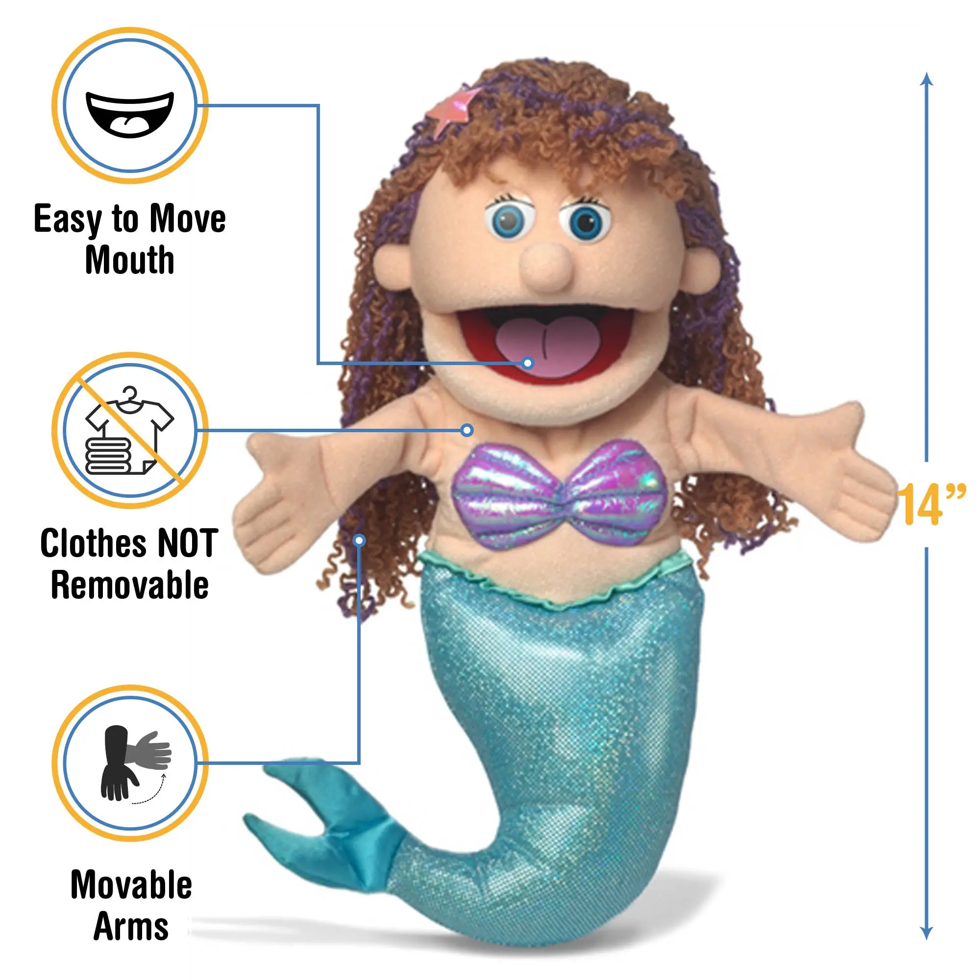 This 14” Mermaid puppet is super cute! She comes dressed as shown with a starfish in her highlighted hair and a purple shell bra! (clothing may vary slightly due to fabric availability). She has blue eyes. Her clothes are not removable.
