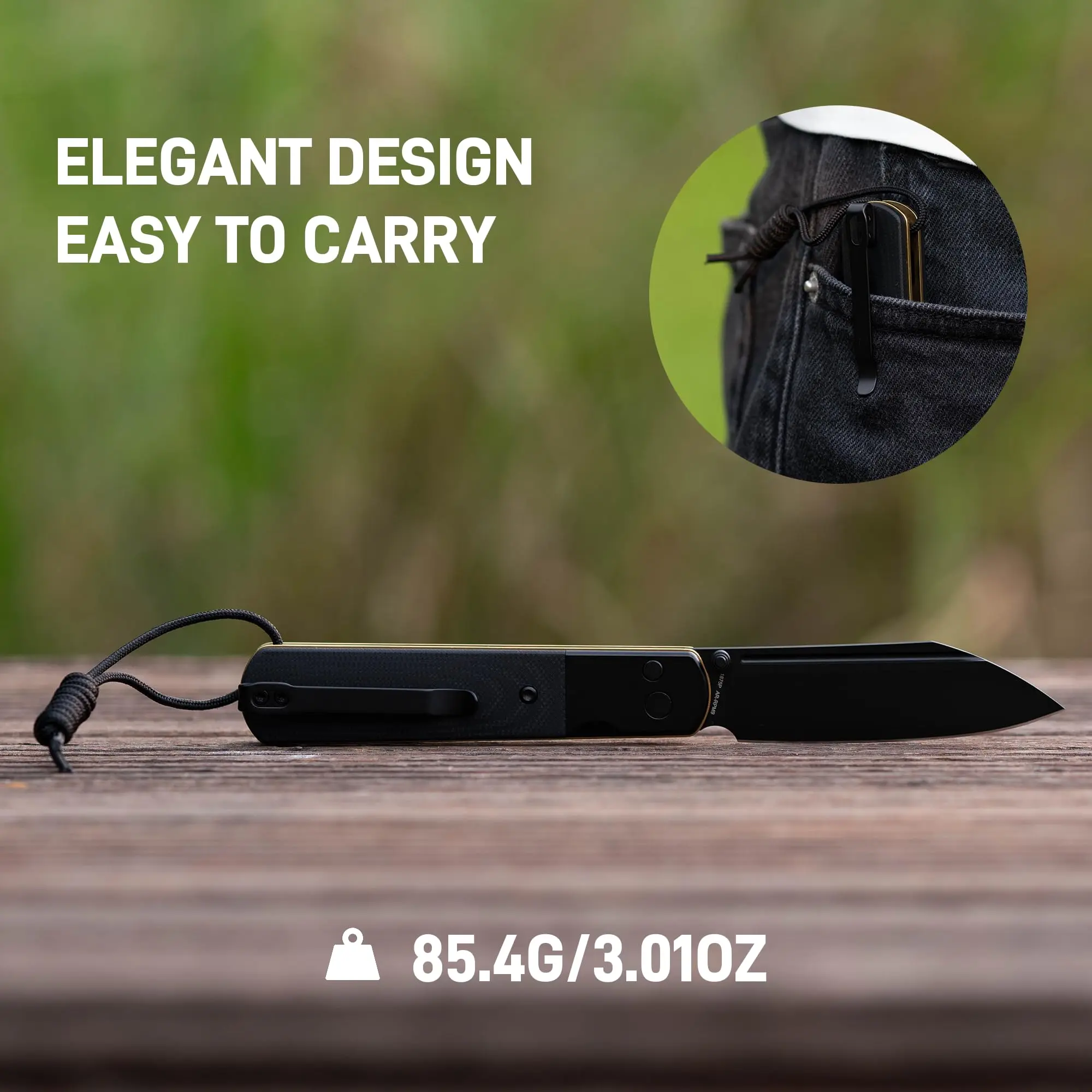 ·Sleek Design and Precision Cutting: This knife features a 3.10" AR-RPM9 Wharncliffe blade with a refined flat grind. Weighing just 3.01 oz, its Black PVD Steel and G10 Inlay inlay handle offers both elegance and practicality. Ideal for everyday carry