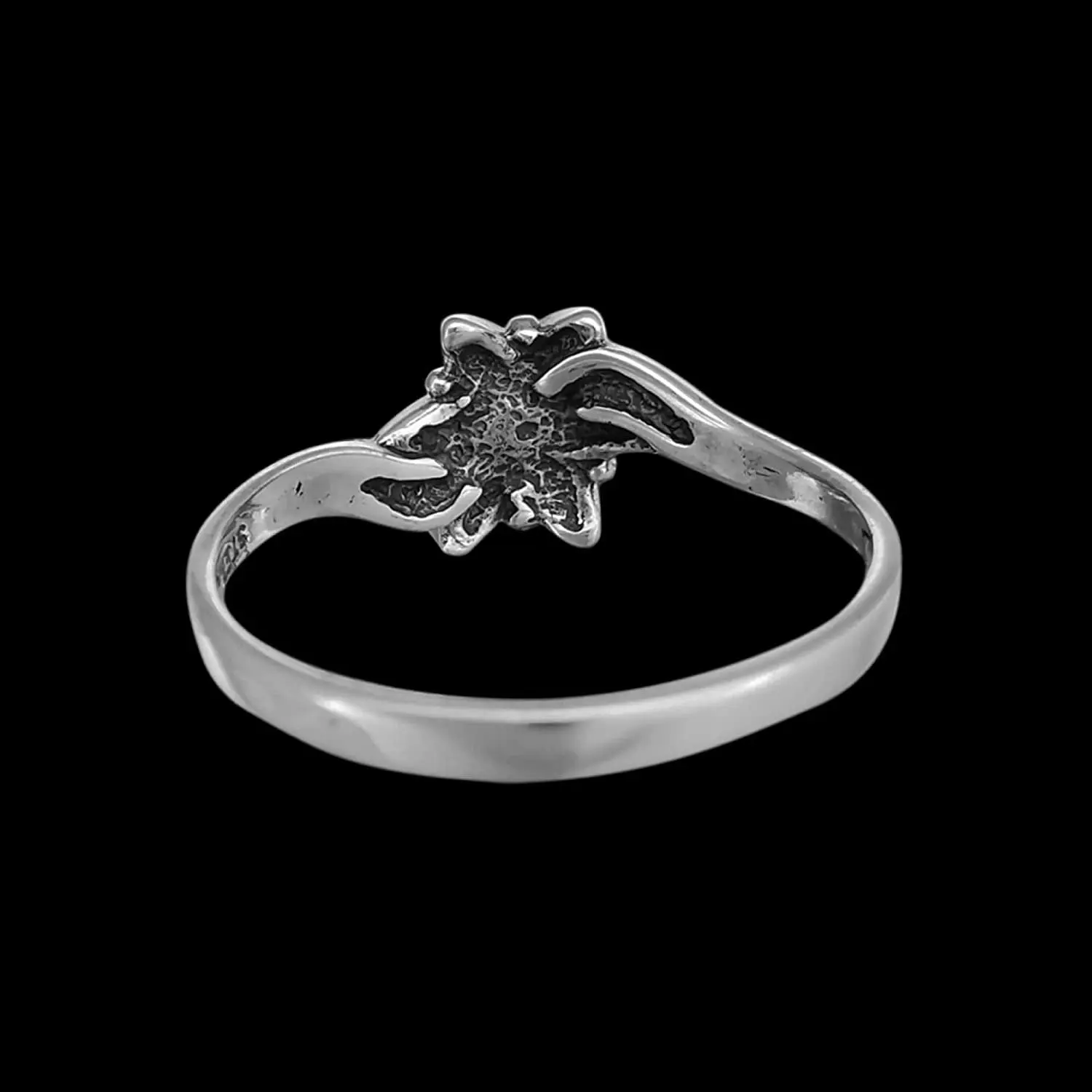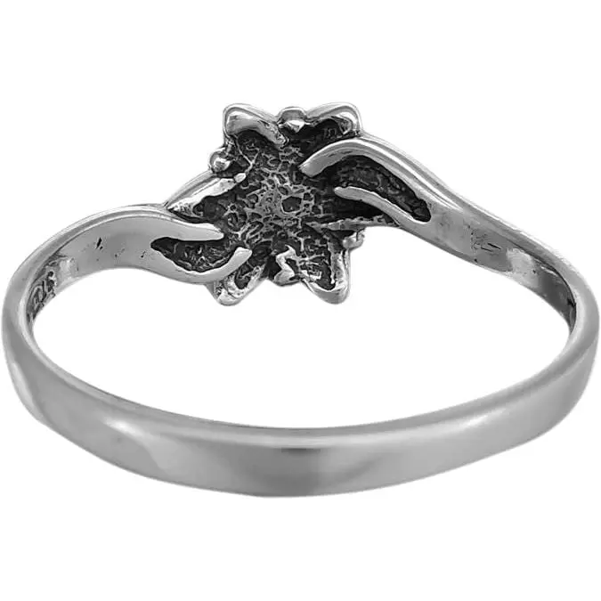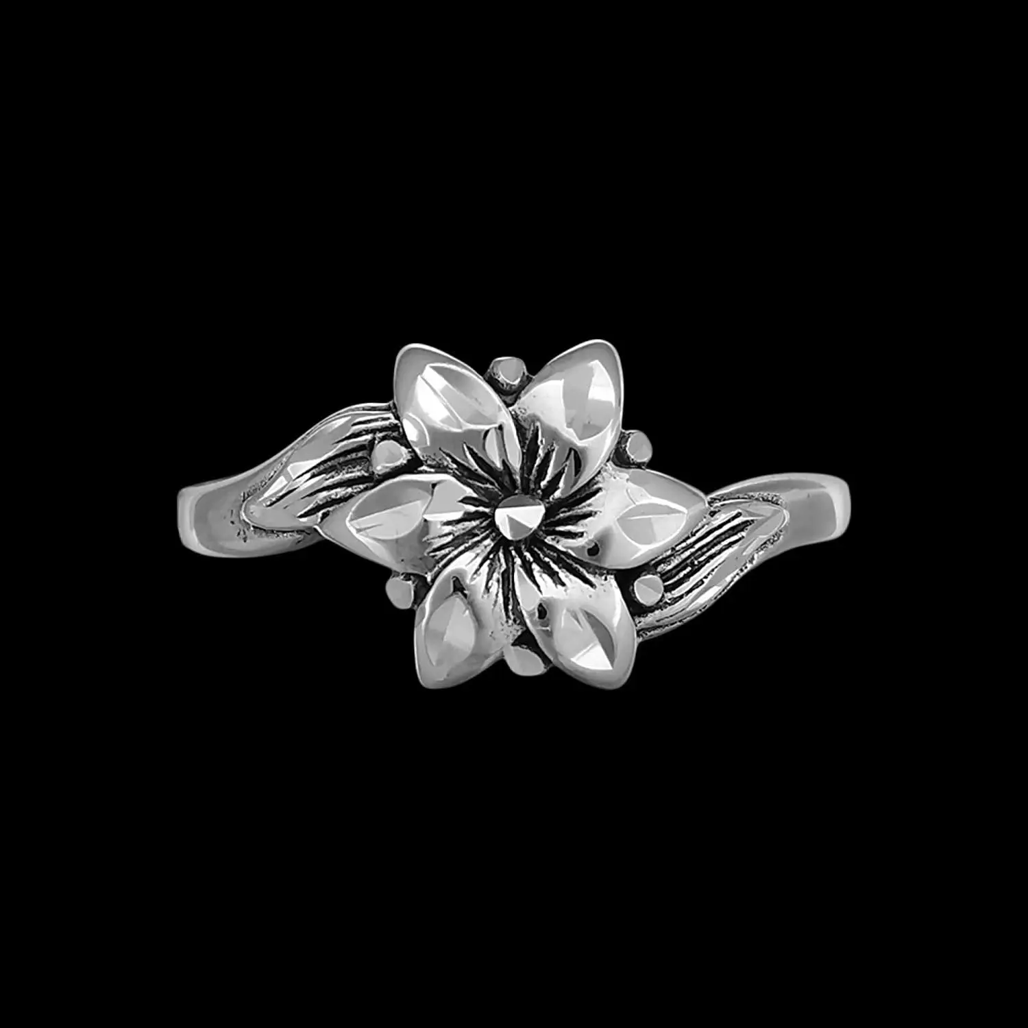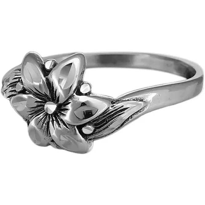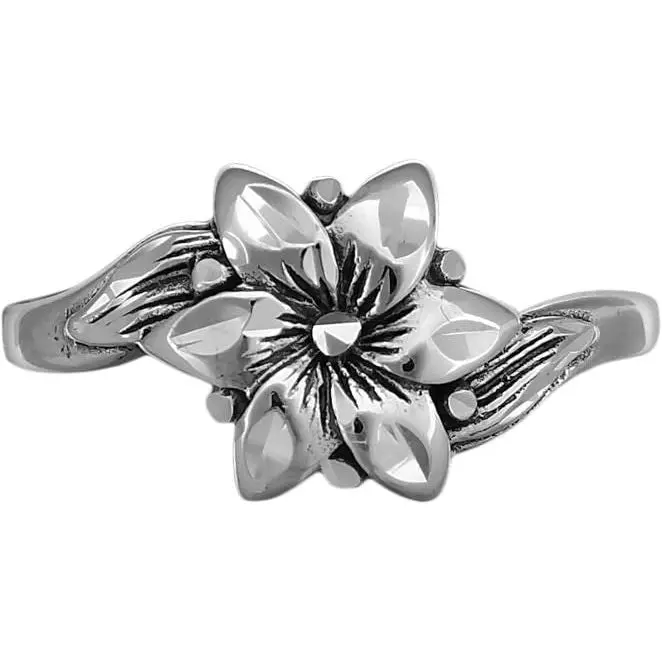 925 sterling silver ring with a sakura flower design. The design measures approximately 5/16 inch tall by 3/8 inch wide. This ring is in our diamond cut finish.