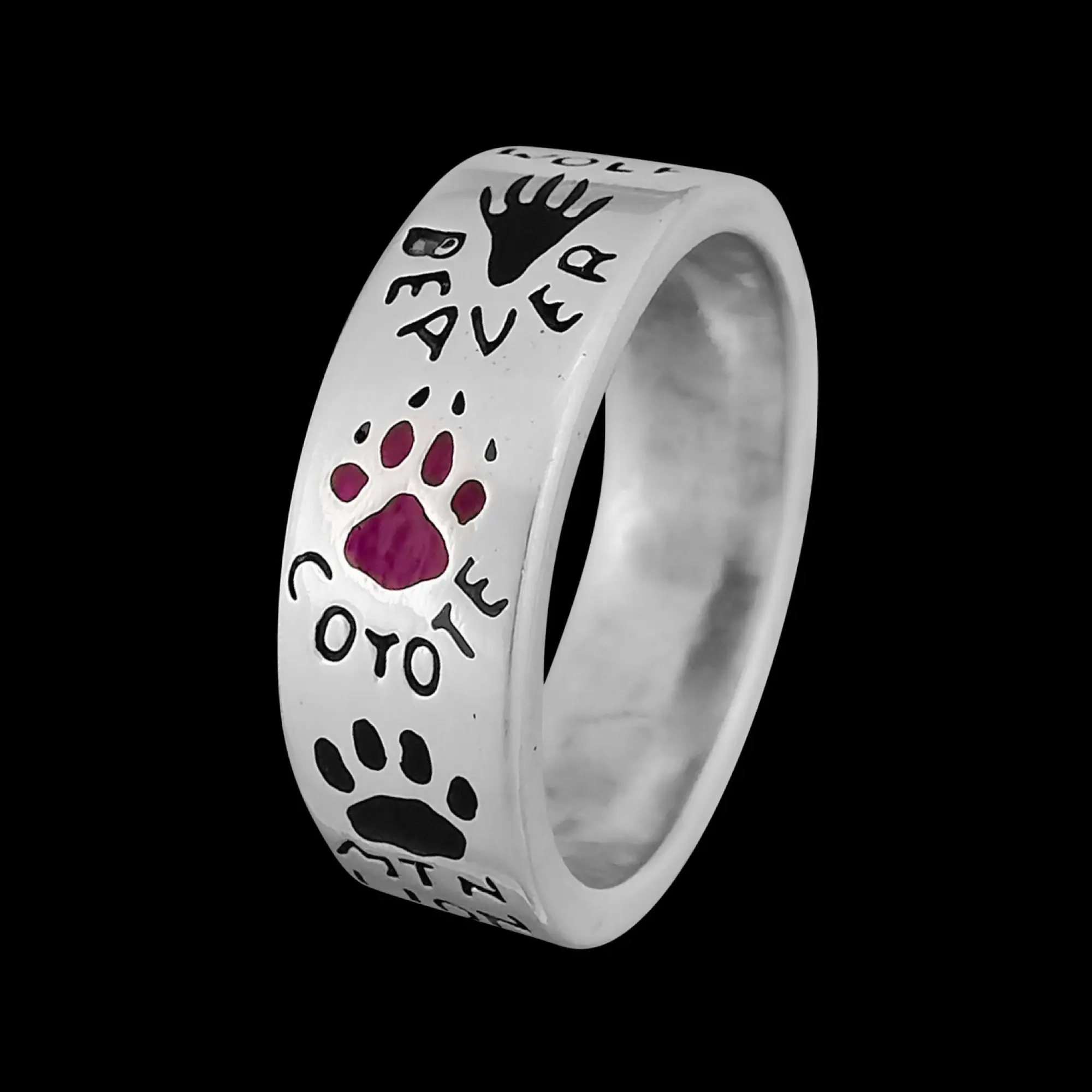 Indulge your love for the great outdoors with this captivating sterling silver band ring in size 5. Designed for outdoor enthusiasts, this ring is a conversation starter and a true eye-catching piece. It features a unique design showcasing eight distinct animal tracks, each labeled for easy identification. The animal tracks include Raccoon, Mustang, Moose, Mountain Lion, Coyote, Beaver, Grey Wolf, and Bear.