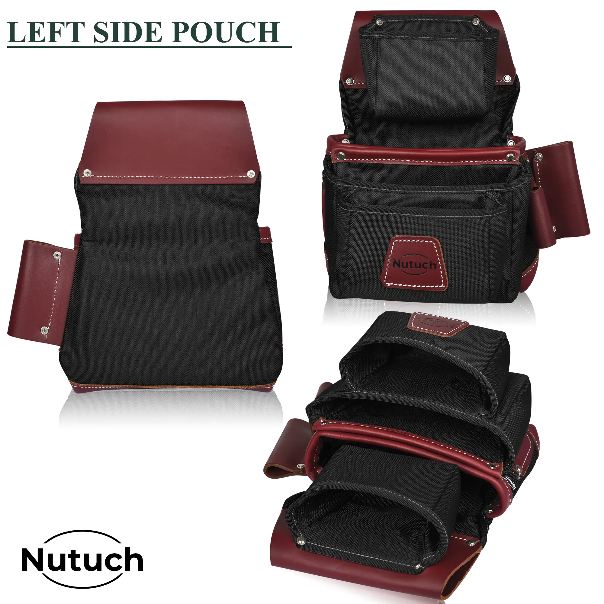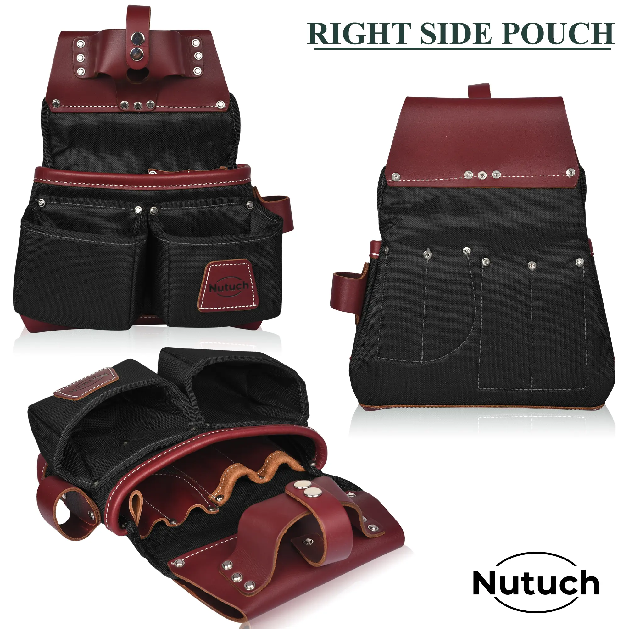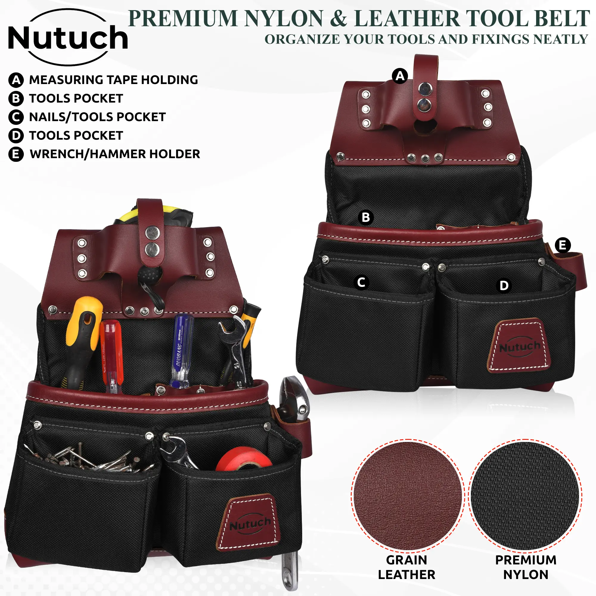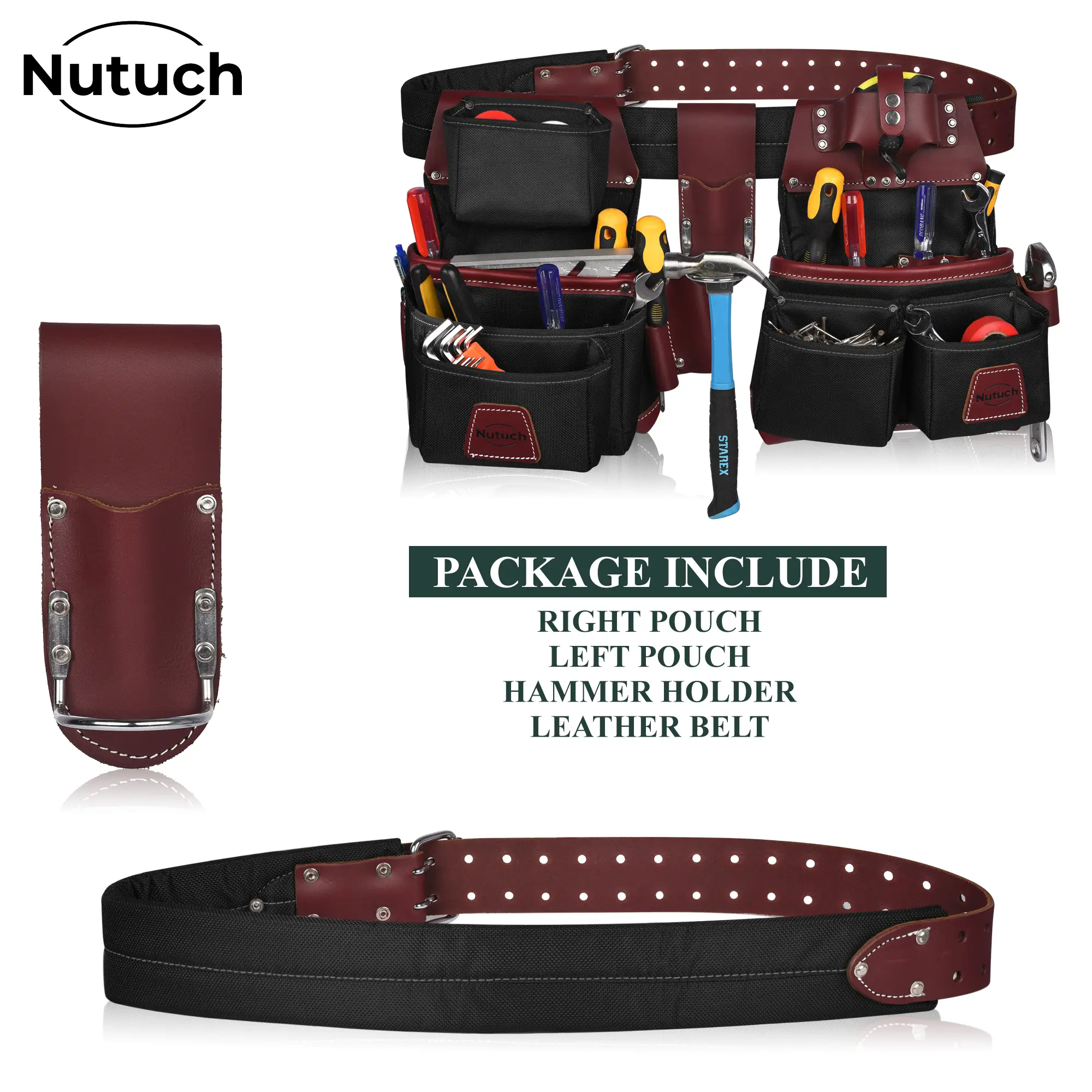 * NUTUCH Tool belt is Extremely Abrasion Resistant Industrial 1680 D Cordura Nylon with exclusive Top Grain leather. This Construction Belt is light weighted and has Foam padded belt which is adjustable to fit waist sizes from 30 to 47 inches. Belt thickness is 4 mm-4.50 mm.