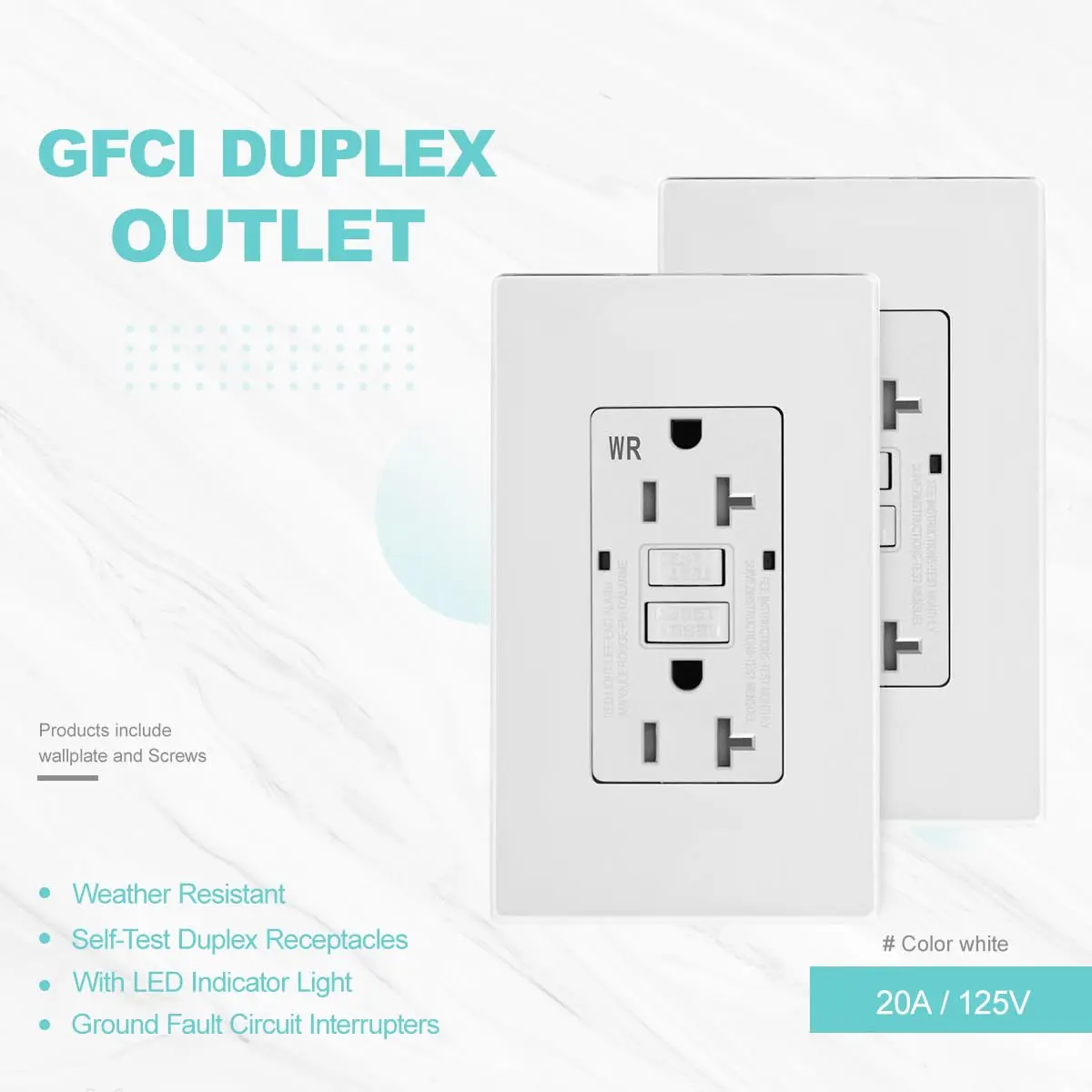 GFCI Outlet WR Weather Resistant Tamper Resistant TR Receptacle Self-Test with LED Indicator, 20Amp 125 Volt Screwless Wallplate Included ETL Listed
