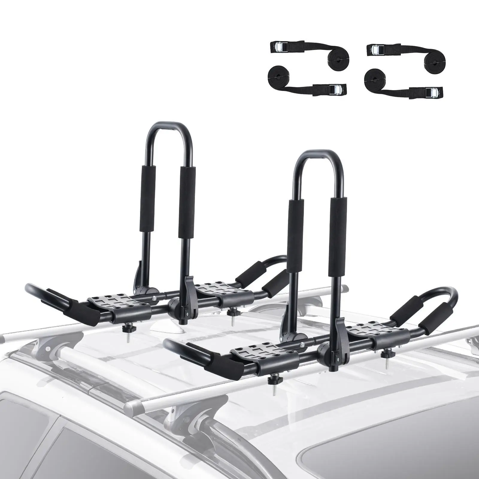 • Strong & Heavy Duty: Our racks are made of high-strength thick alloy steel and high-quality plastic, one set of racks can withstand a dynamic load of 150 lbs / 68.0 kg, easily load two kayaks without warping or damage. In addition, our racks are added with rust-resistant coating for a long service life in the wind and rain. Note: Please check your car's roof and crossbar rack's carrying capacity when using it to avoid crushing the roof.
