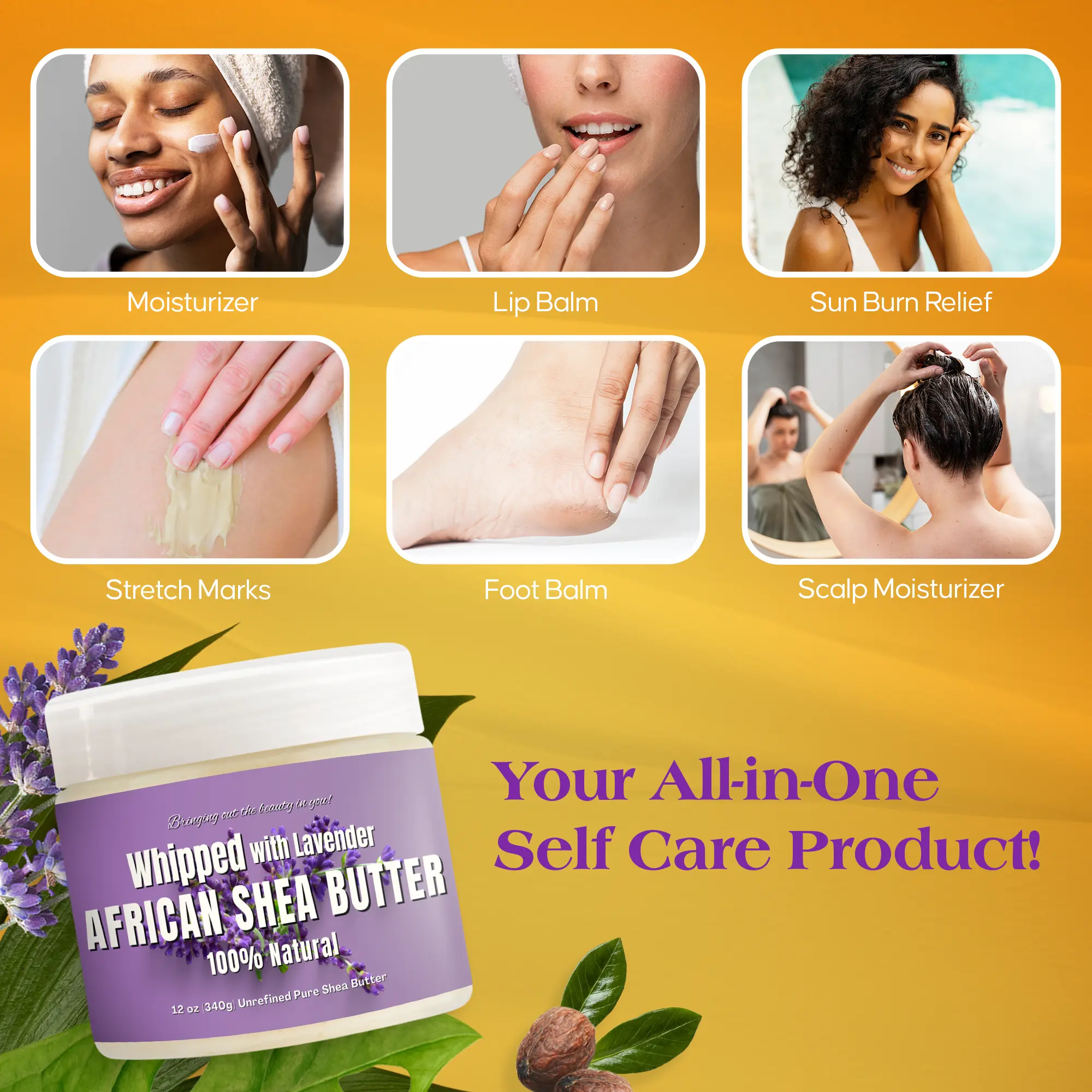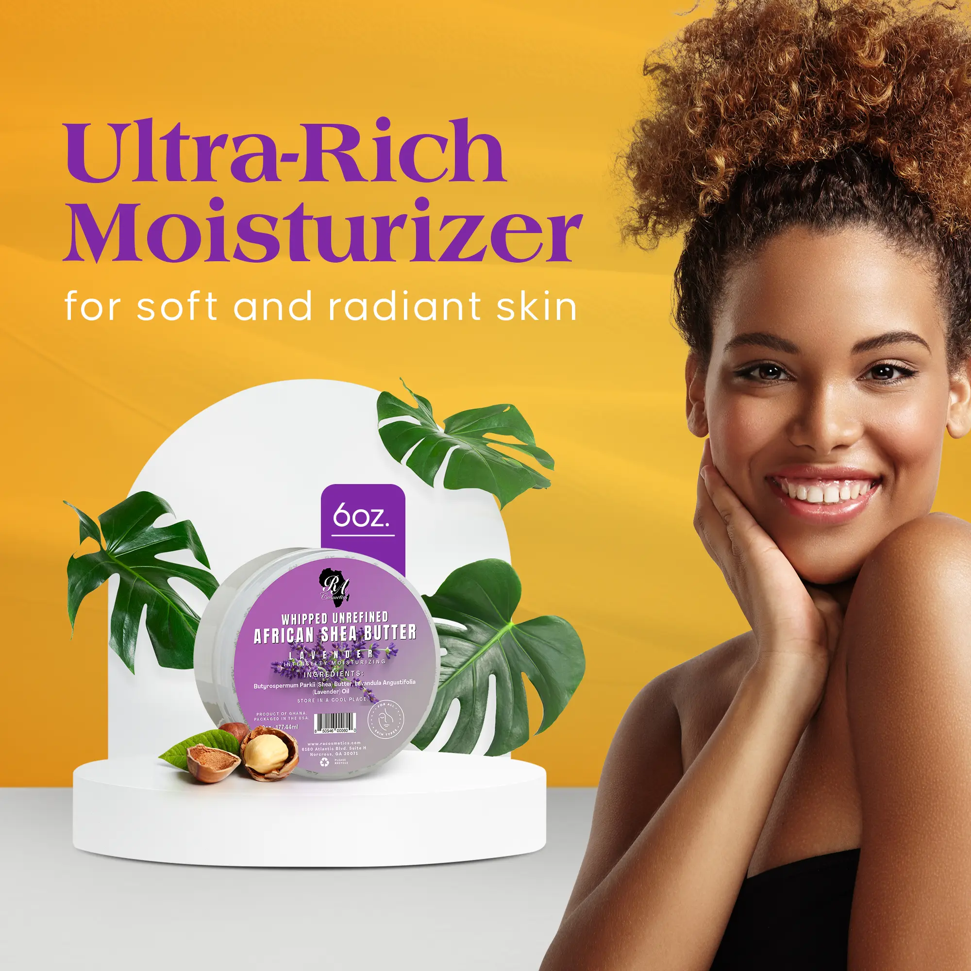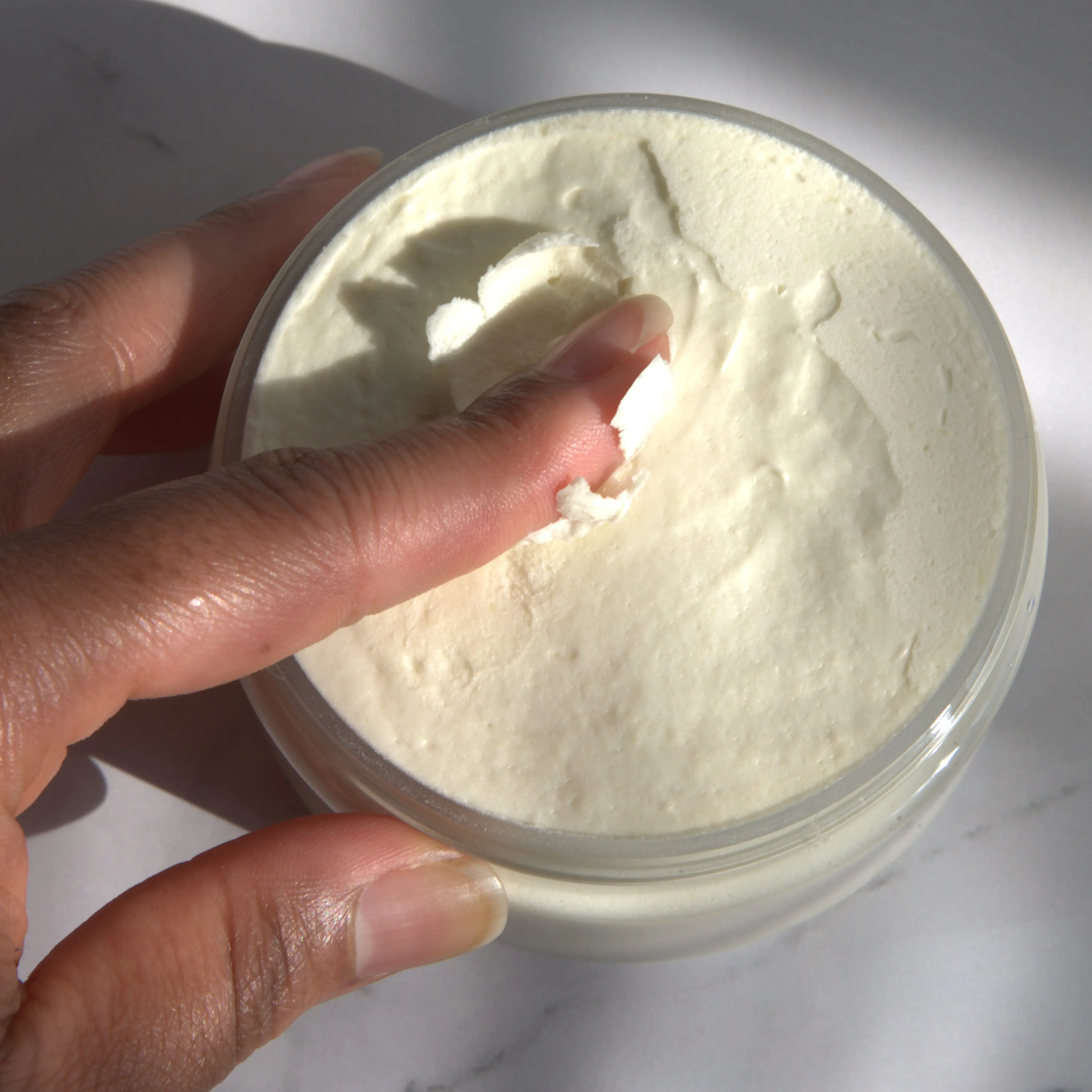 Whipped Shea Butter is a luxurious, all-natural moisturizer that provides deep hydration and nourishment for your skin. This creamy, lightweight formula is made from pure, organic shea butter that has been carefully whipped to perfection for a silky, smooth texture. Rich in essential fatty acids and vitamins A, E, and F, this whipped shea butter helps to soothe dry, rough skin, improve elasticity, and promote a youthful, glowing complexion. Perfect for daily use, it absorbs quickly without leaving a greasy residue, making it ideal for all skin types, including sensitive skin.