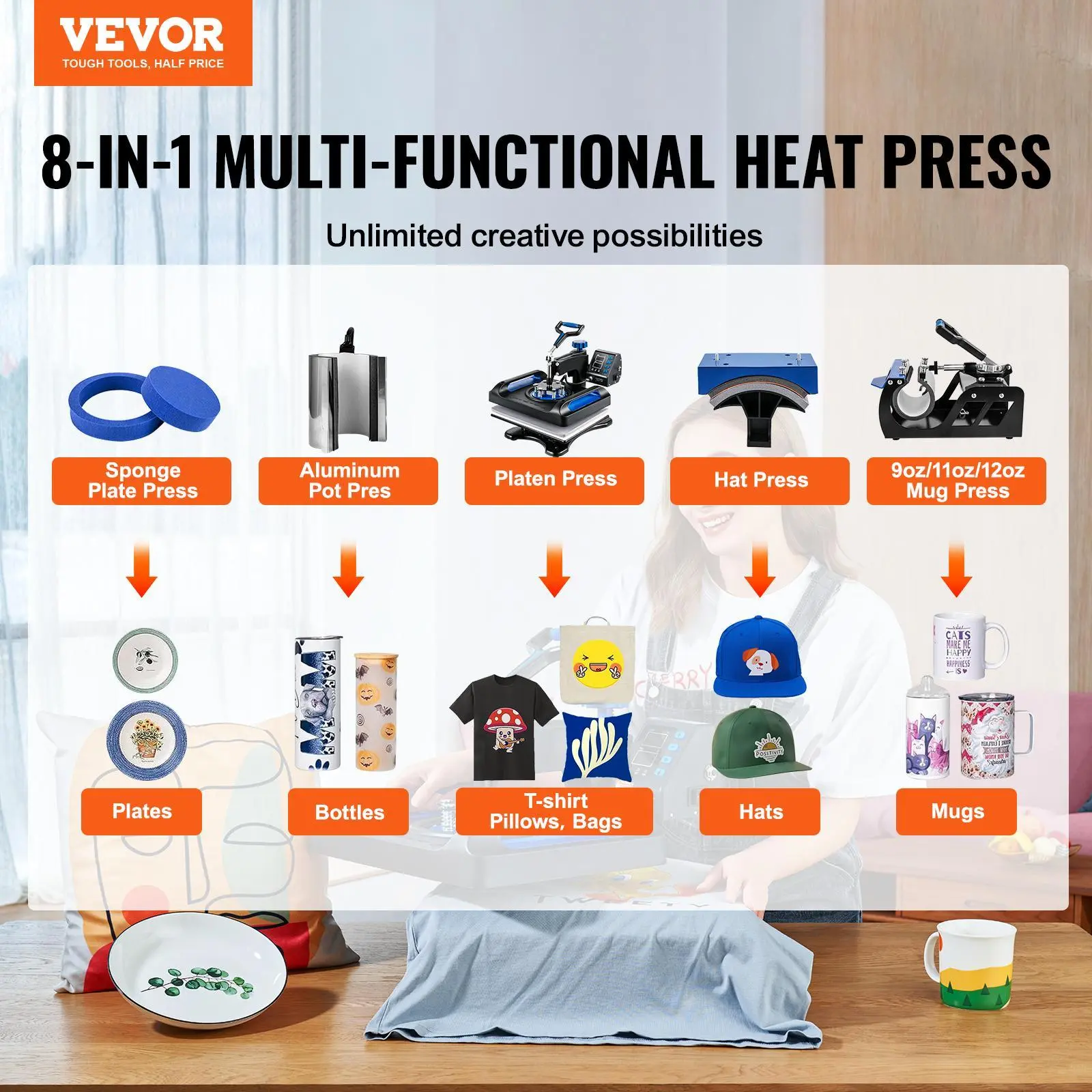 • 【8-IN-1 VERSATILE KIT】- With a 12"x 15" (29 x 38 cm) large heat platen, the 8 in 1 heat press uses Teflon-coated platen, non-stick & stable. Suitable for applying letters, numbers, and patterns onto caps, T-shirts, mugs, plates, aluminum pots, etc.