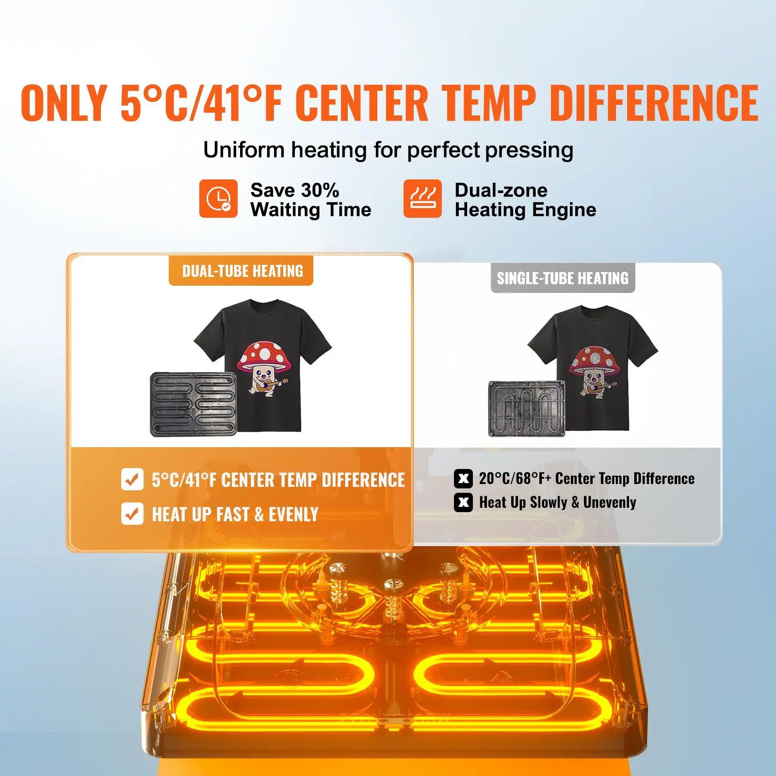 • 【DUAL-TUBE HEATING】- Unlike ordinary single tube heating, our heat press 12x15 adopts the latest double-tube heating technology. That makes the temperature difference is only about 5 ℃ between the center and the edge. But the old-fashioned heating tube is more than 10 ℃.