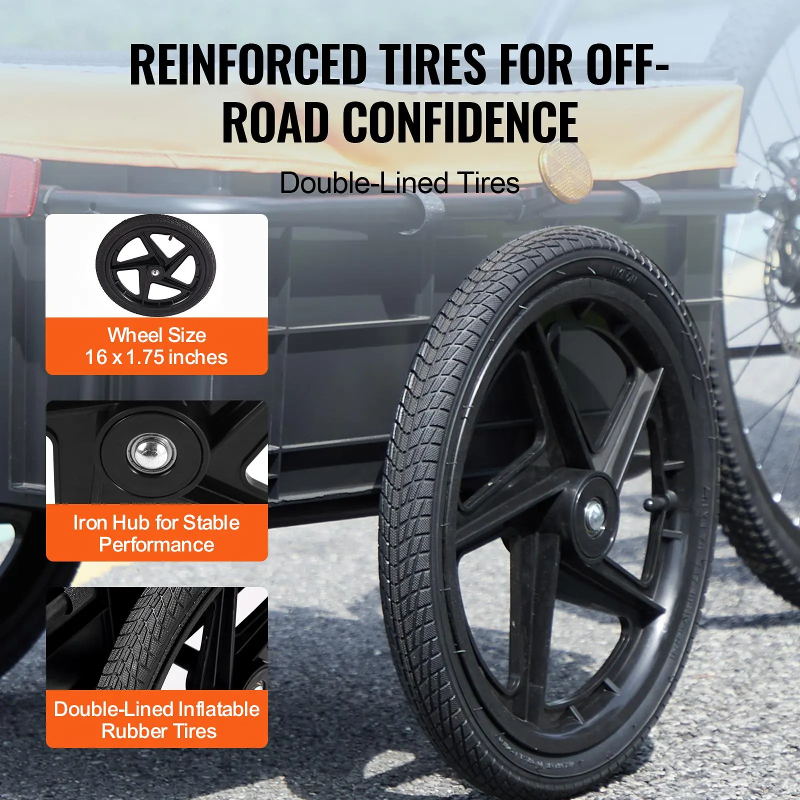 • Professional Tire Design: Roll smoothly on any road! Our bike trailer comes equipped with sporty 16" x 1.75" tires and iron hubs, providing excellent stability and traction on various surfaces, whether you're cruising on concrete, navigating gravel paths, or tackling sandy trails.