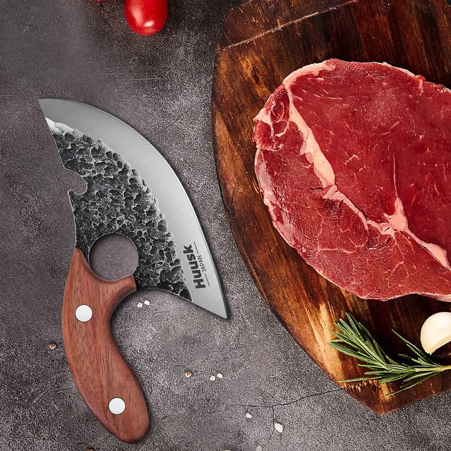 ·Ergonomic Design: Features a top-quality oak wood handle with an ergonomic bend for added wrist comfort during extended use. The blade includes a precision, laser-carved index finger hole for superior control and a slot for opening beer bottles, making it perfect for cooking and entertaining.