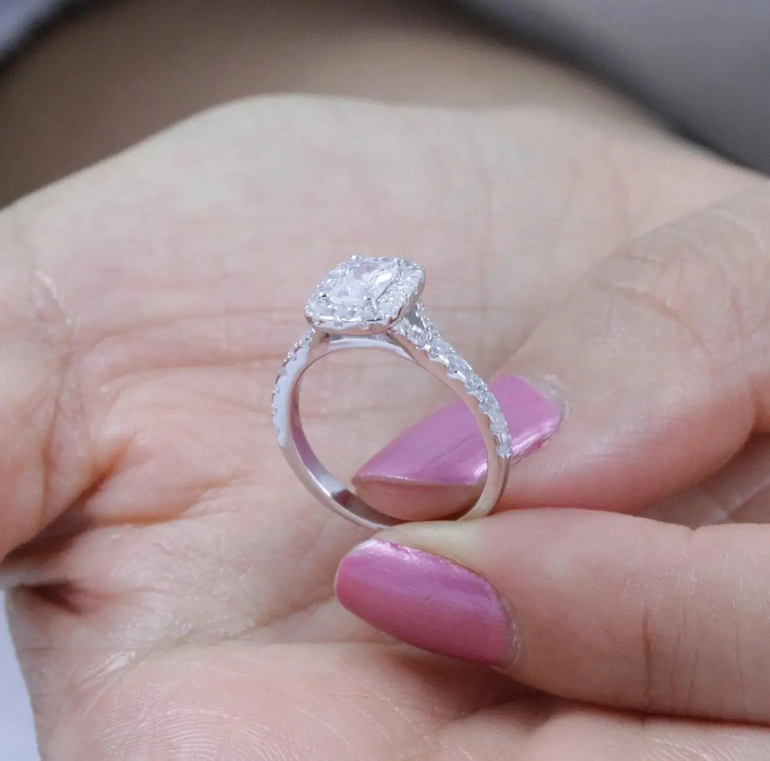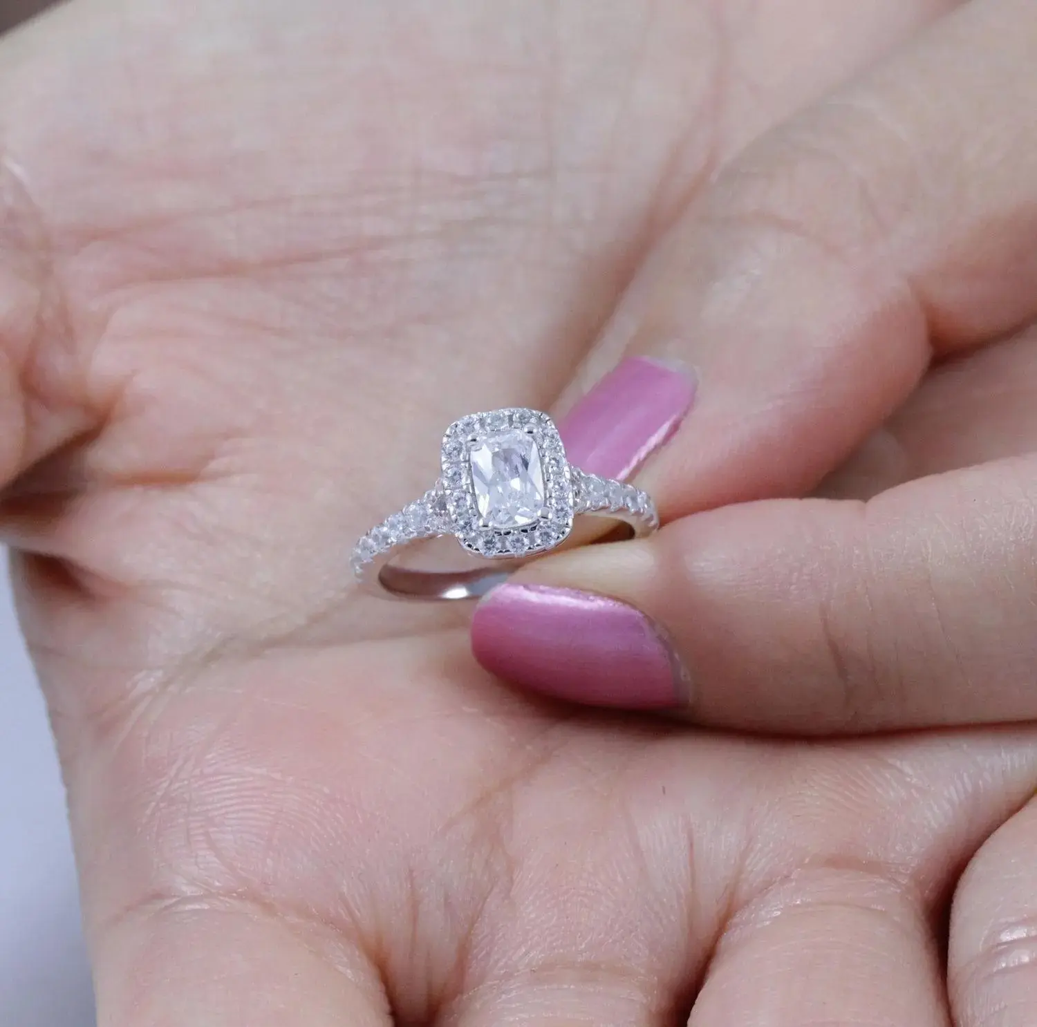 You are looking at gorgeous french set 925 sterling silver Cz engagement ring / wedding band. The ring features a 6mm x 4mm brilliant cushion cut center stone, 30pcs 1.2mm and 8pcs 0.5mm round cut accent stones. Top quality AAA Cubic Zirconia display amazing enriched clarity just like real diamonds! Total carat weight is approx. 1.5 carats diamond equivalent. Set in .925 sterling silver (stamped) and finished with rhodium plating for maximum shine and protection (platinum look).