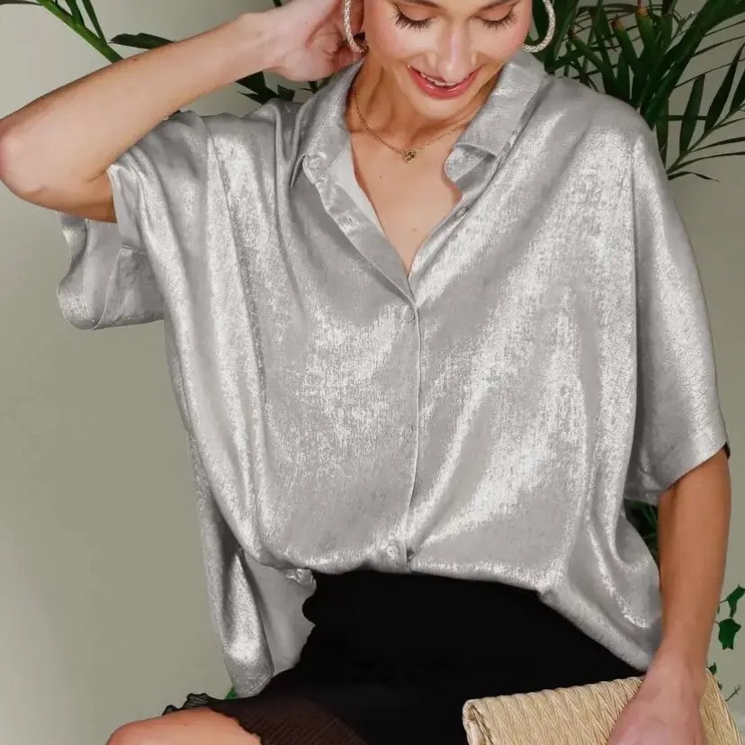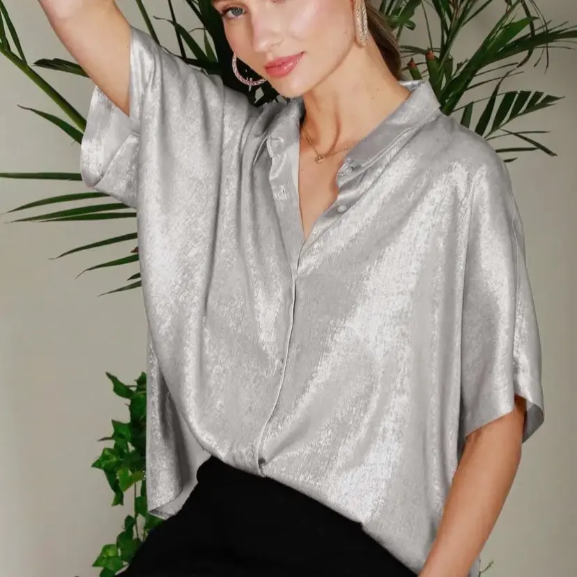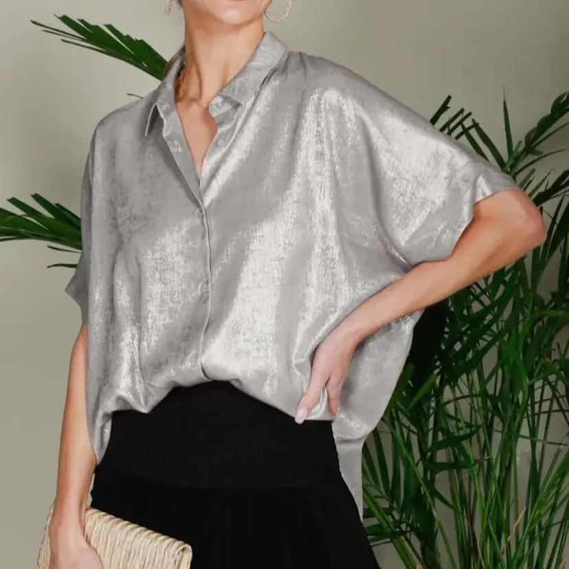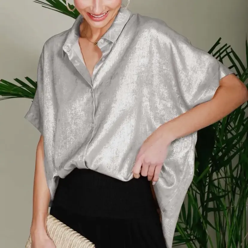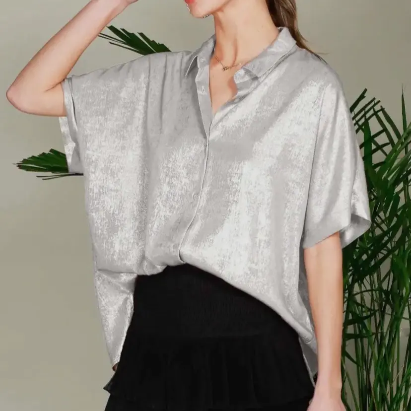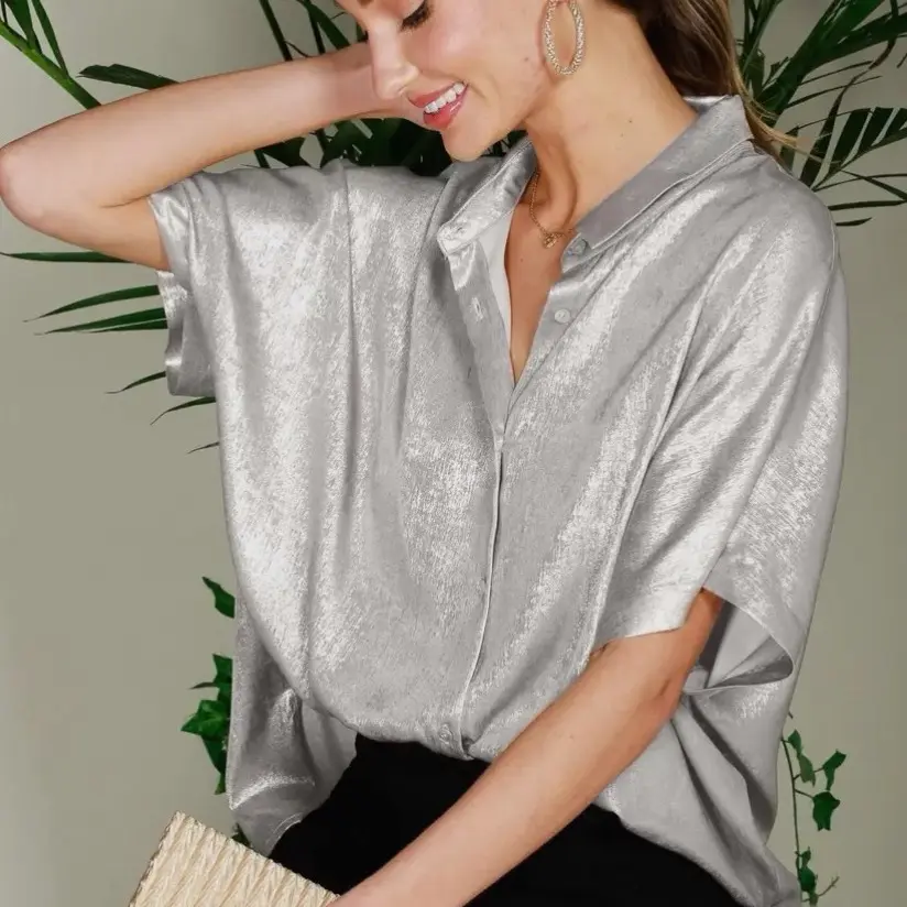 This Women's Silver Collared Metallic Woven Button Down Top is the perfect blend of glamour and versatility for your wardrobe.