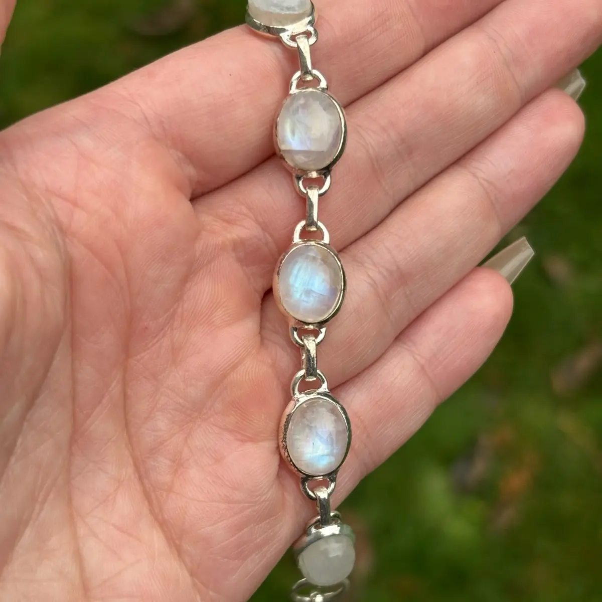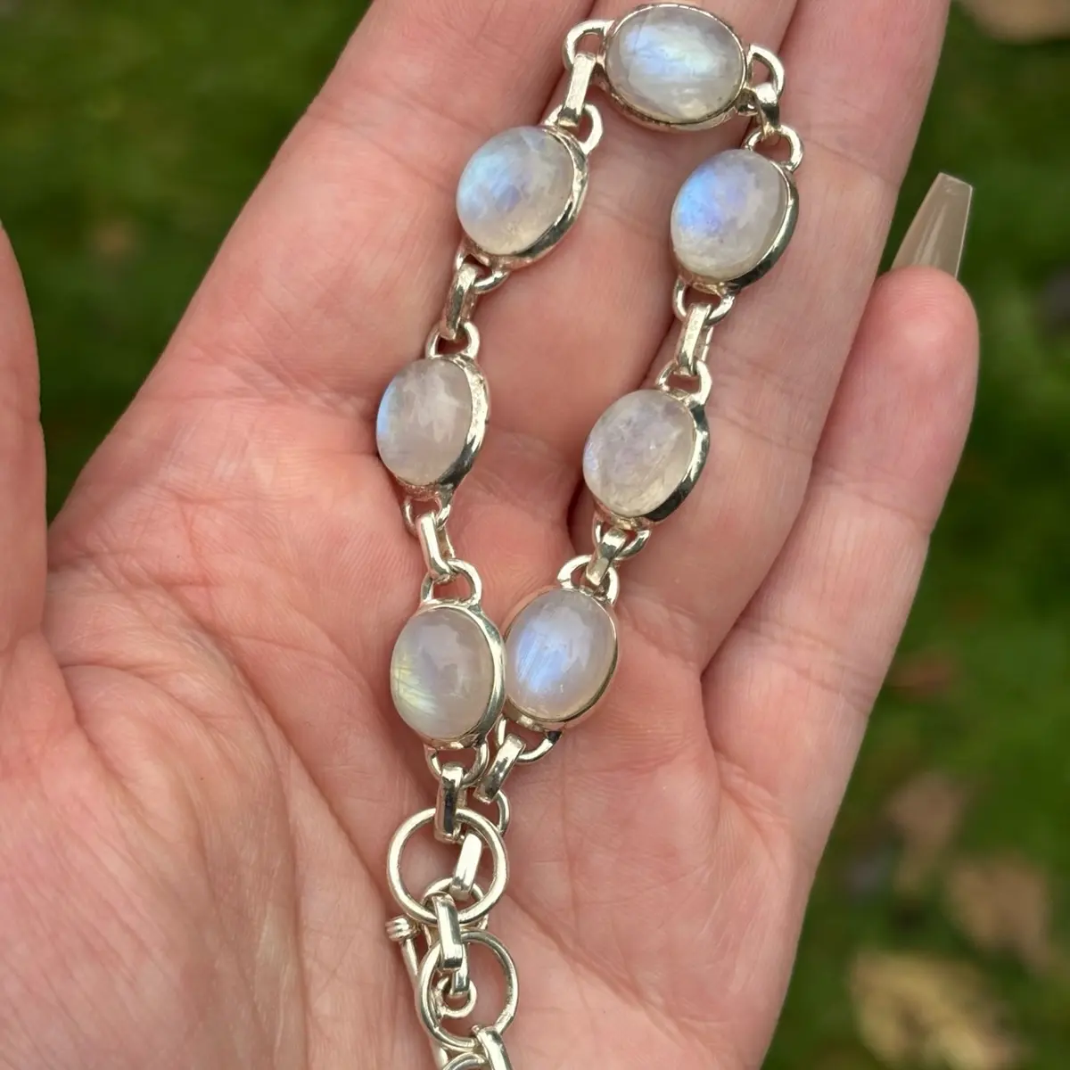 This sterling silver bracelet is a stunning piece of jewelry that features several oval rainbow moonstone cabochons. The oval shape of the cabochons adds a unique and elegant touch to the bracelet, making it stand out from other bracelets. The rainbow moonstone cabochons are known for their iridescent and colorful play of light, which adds a beautiful and eye-catching element to the bracelet.