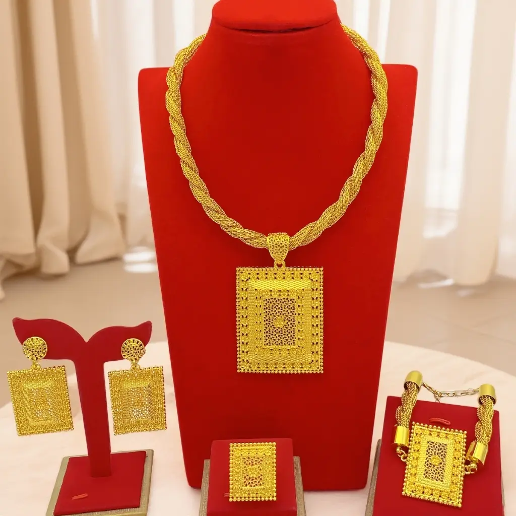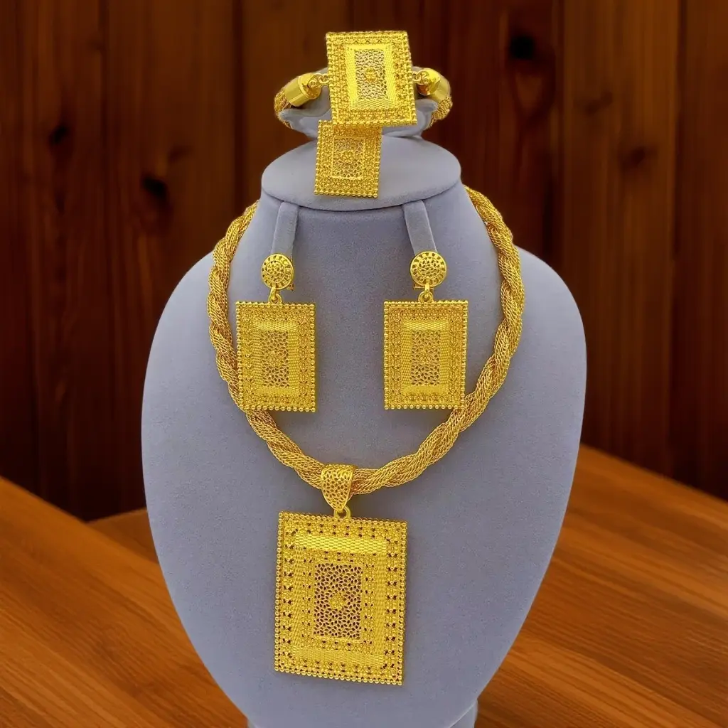 4 Pcs Jewelry Rectangle Pendant Ring Earrings Necklaces Bracelet Women's Gold Plated Wedding Decorations Chain Collar Mom Christmas Gifts Original Set
