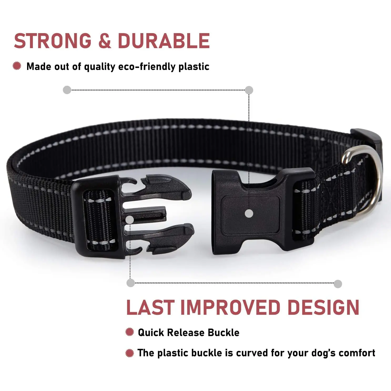 ·【CONVENIENT & DURABLE】Quick release premium ABS made buckles, easy to put it on/off. The plastic buckle is curved for your dog’s comfort. The metal D ring is chrome coated to add durability.