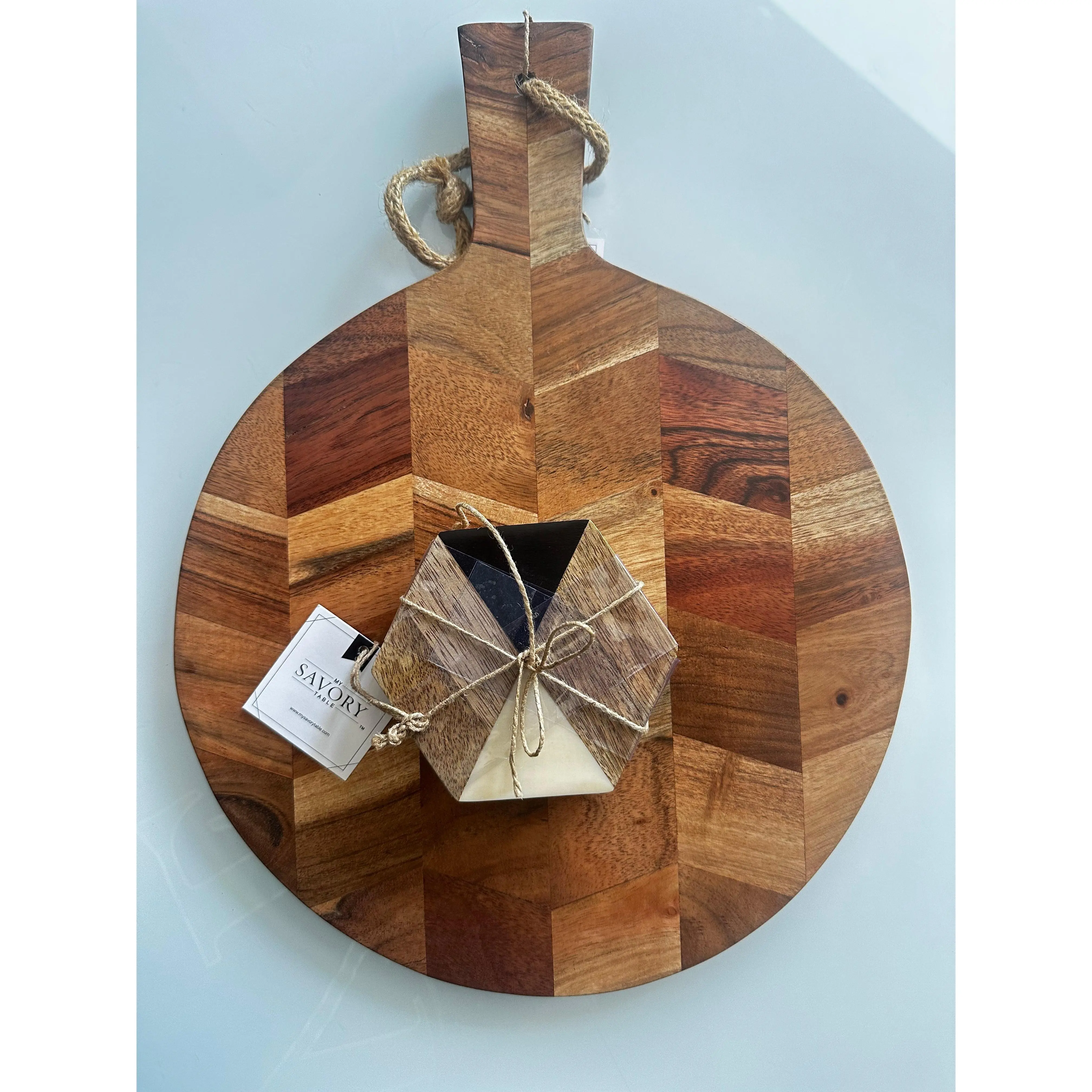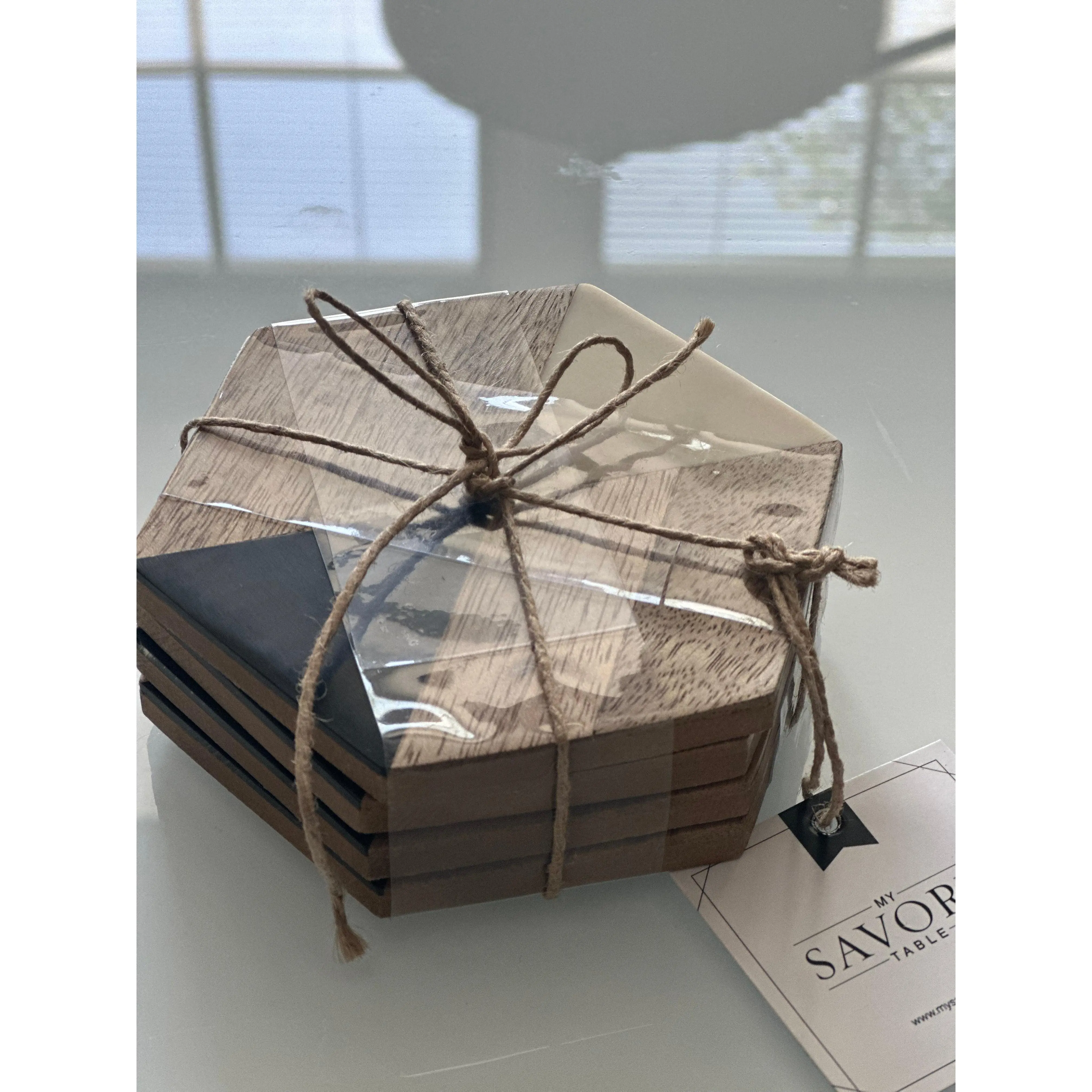 Hexagon, Mango, and Resin inlay coasters. Comes in a set a four.