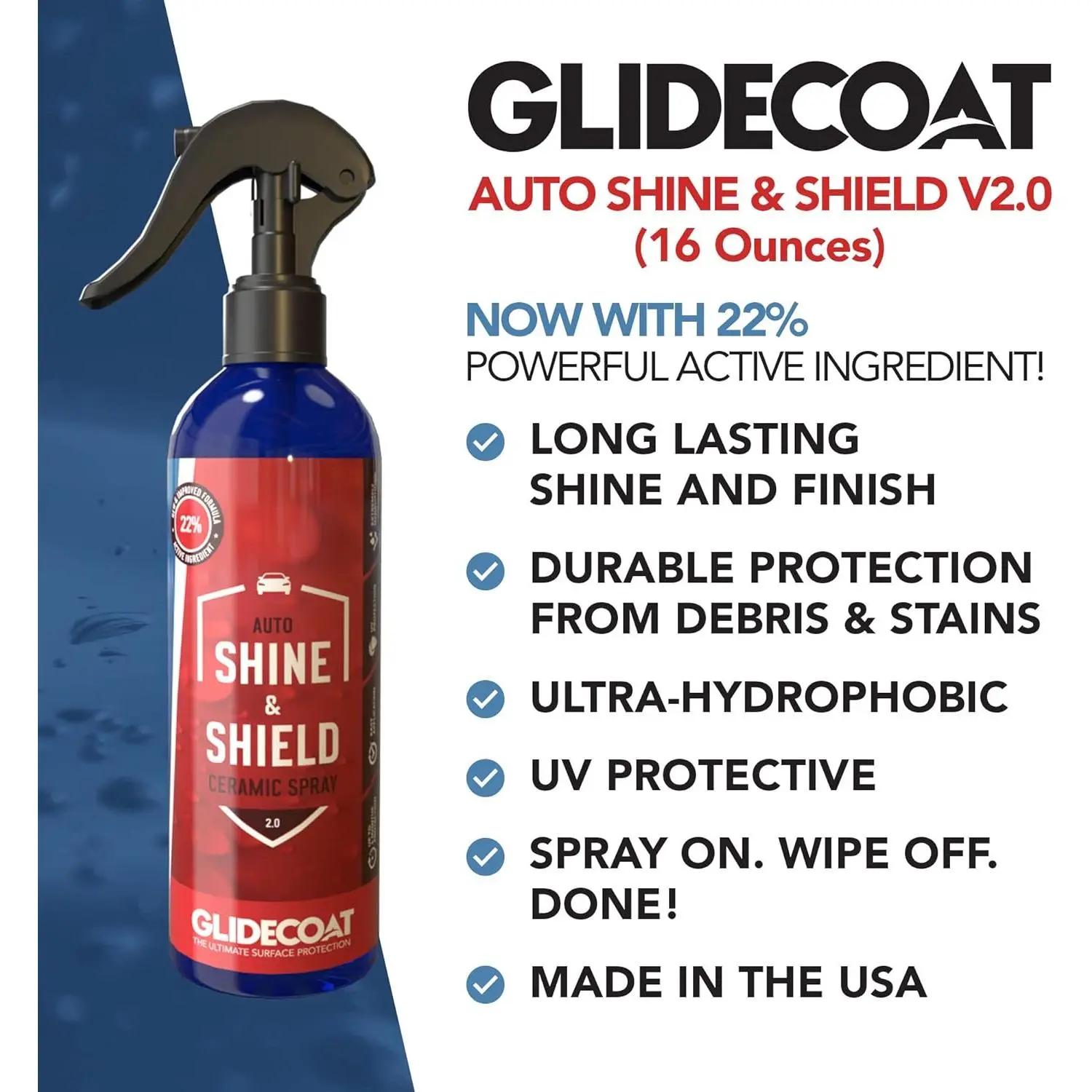 QUICK AND EASY APPLICATION - Our hydrophobic spray is so easy to use, you'll be giving your car a quickie before you're off to the races! Just spray Glidecoat Shine & Shield on the desired surface and then wipe it off with a microfiber cloth! You're never too busy if it's that easy!