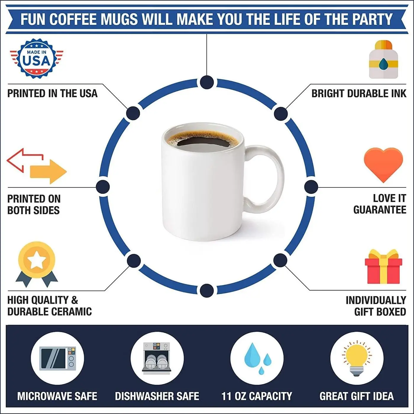 High quality white gloss 11oz ceramic mugDishwasher safe & Microwave safeTop-to-bottom full wrap dye sublimationAAA ORCA Coating for maximum print vibrancy & longevityDecoration Method: Sublimation