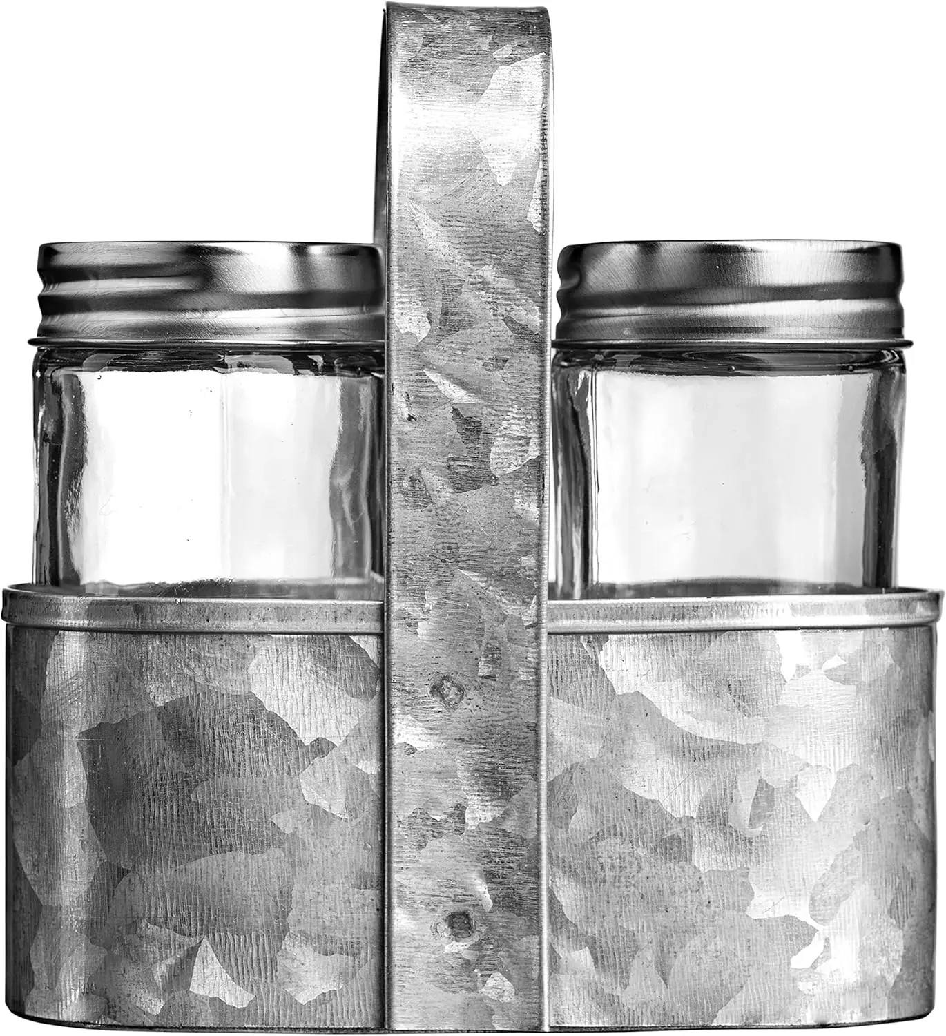 Add a touch of farmhouse charm to your home with this silver galvanized steel salt and pepper holder that complements various decor styles.