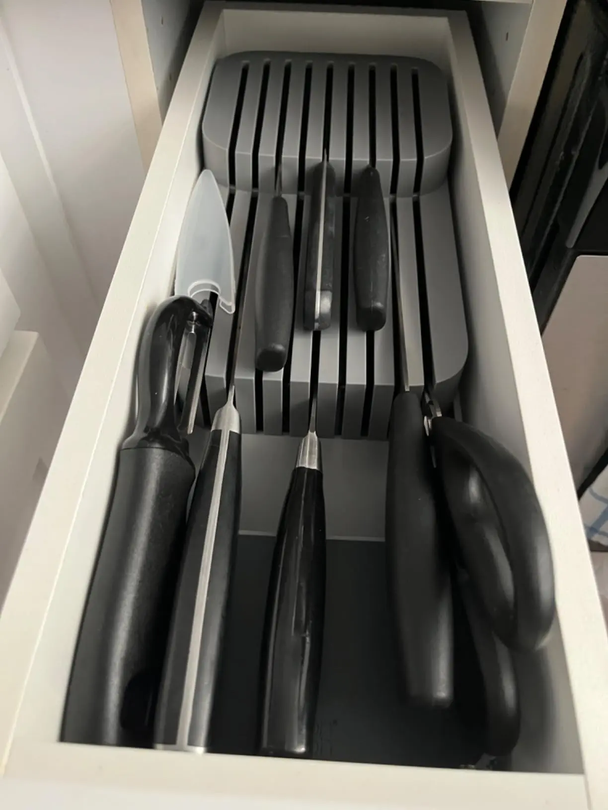 Designed to hold knives securely, this organizer prevents them from shifting, ensuring no more worrying about knives moving around or jamming in the drawer.