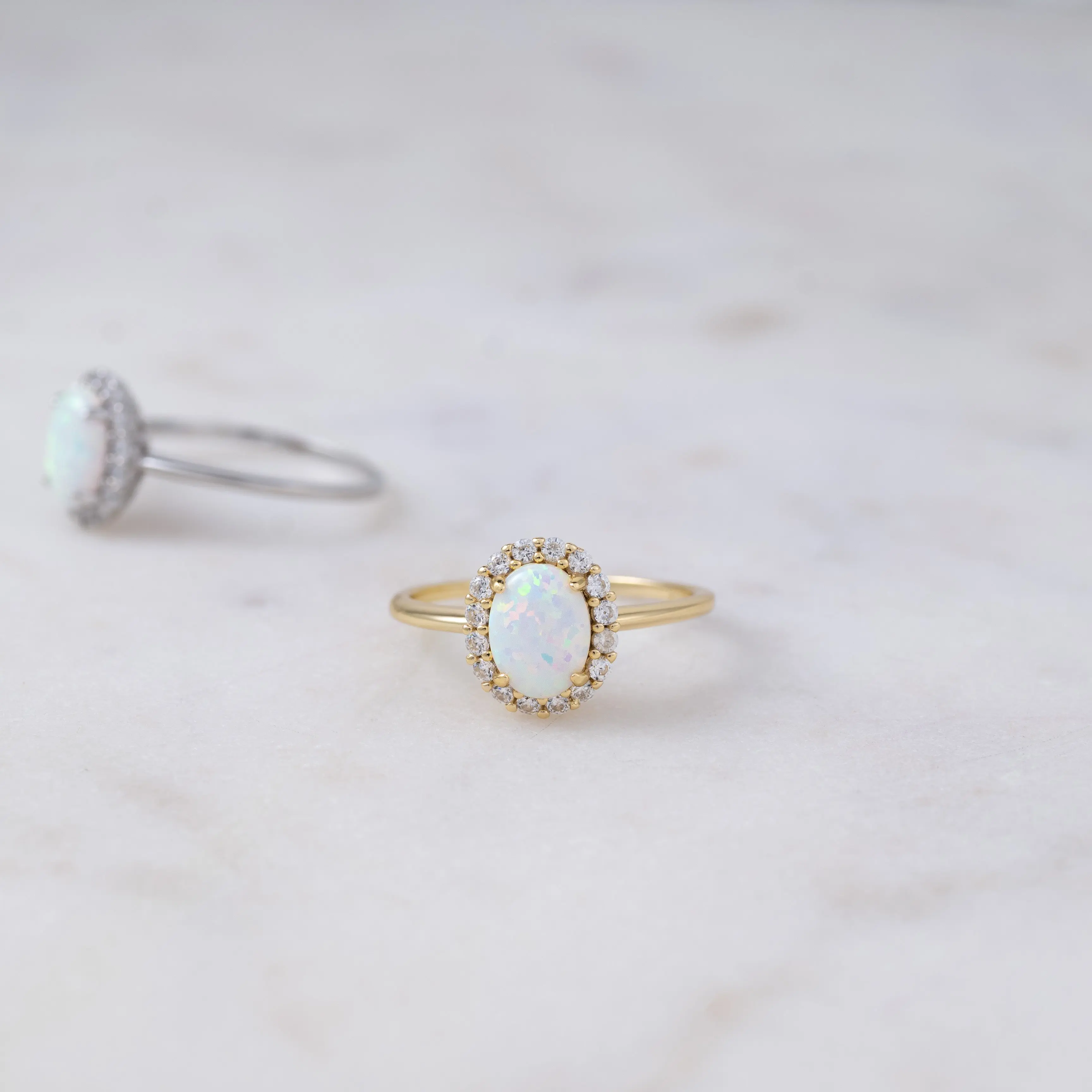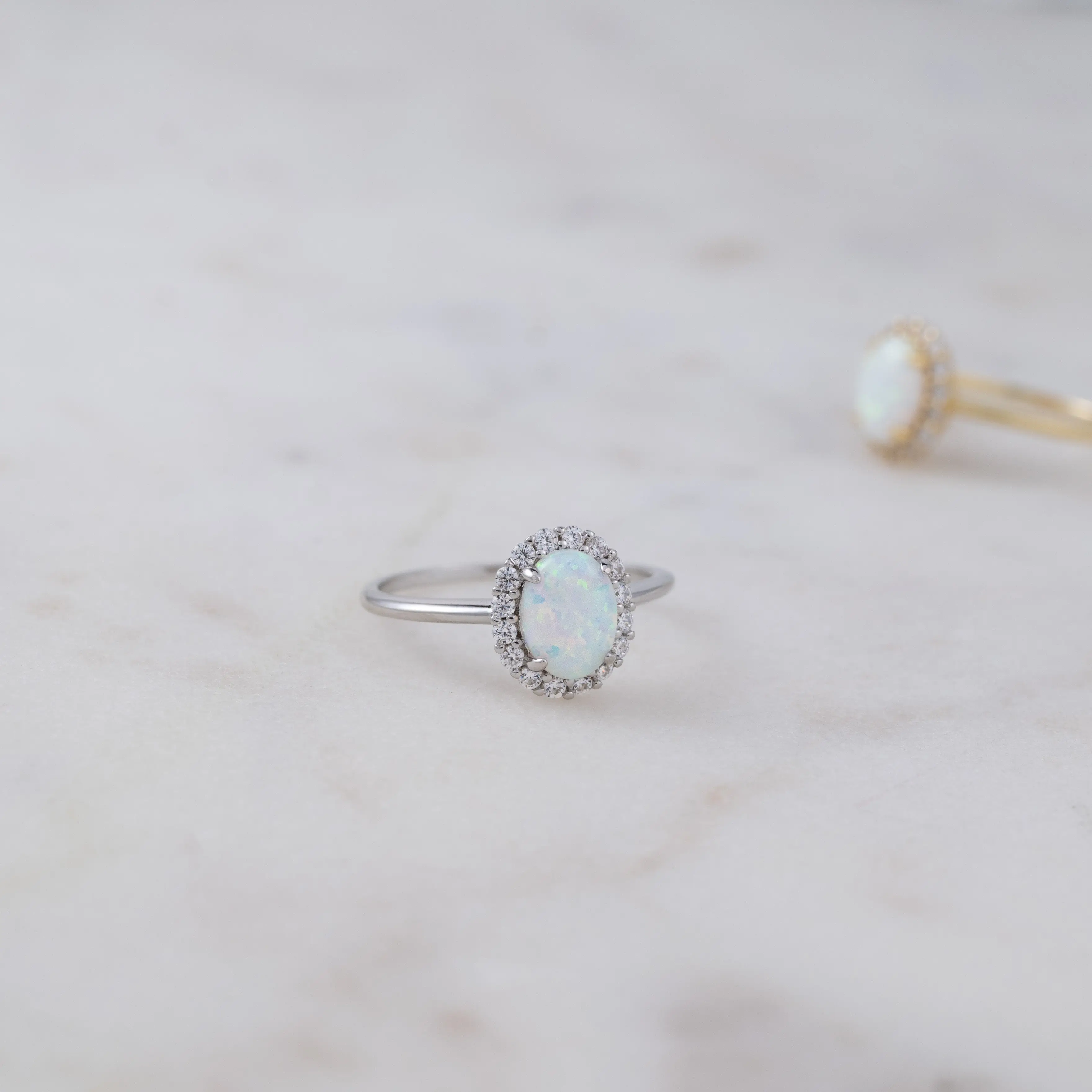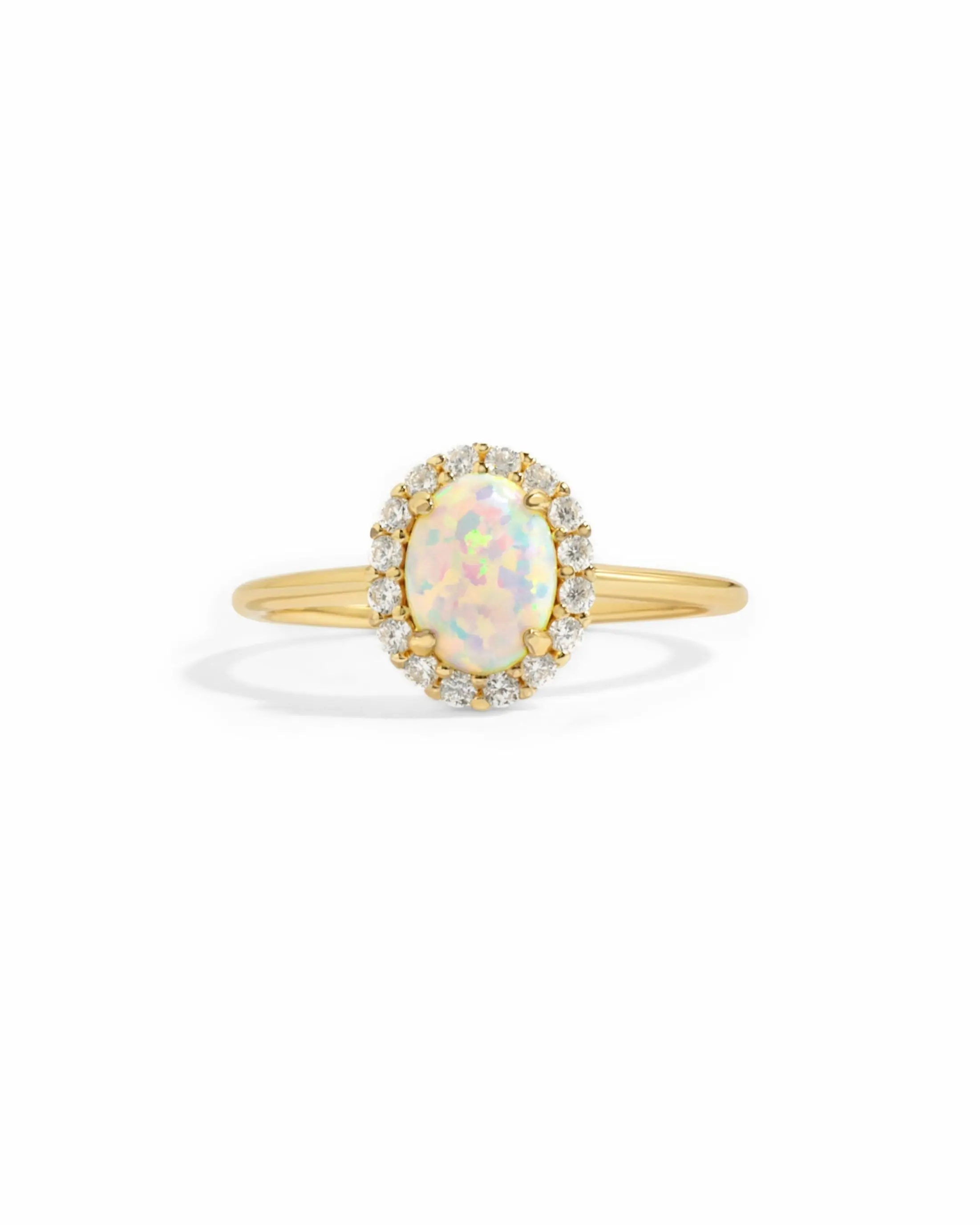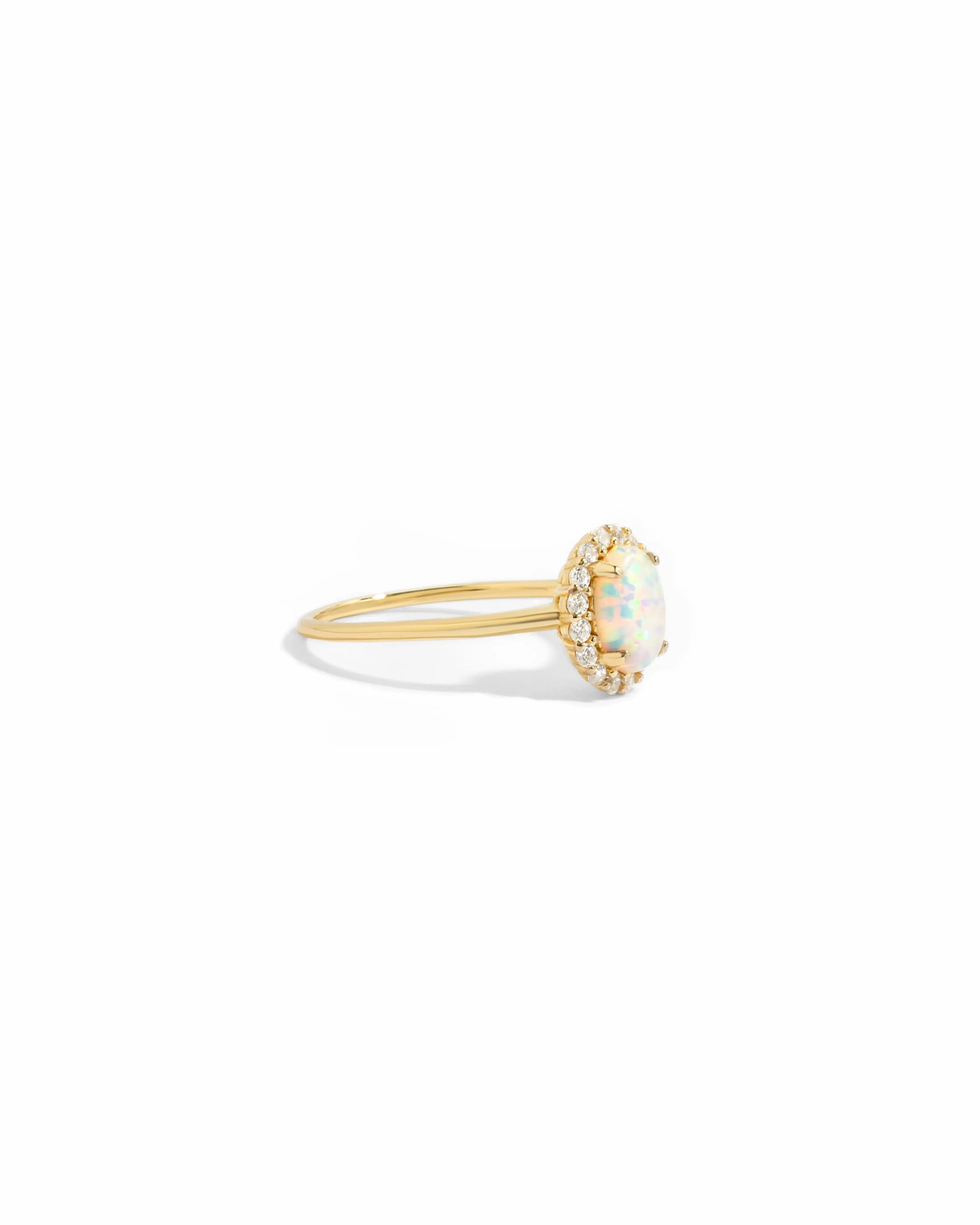 This beautiful opal ring features an oval cut with a pavé halo. It is absolutely stunning! Perfect for gifting an october baby or treating yourself! The opal ring makes a statement!