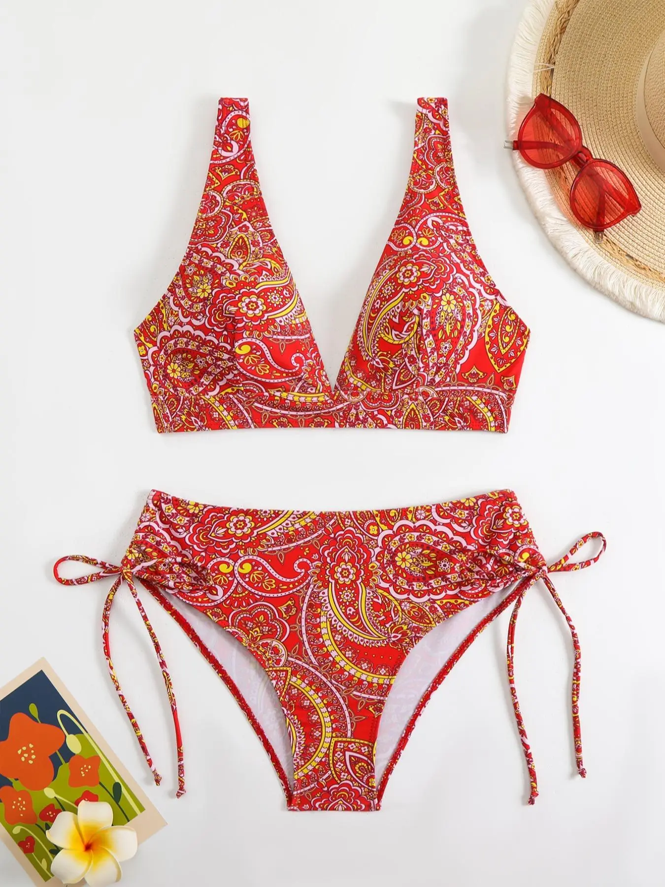 Two-Piece Set Women's Paisley Print Bikini Set, Casual Adjustable Strap V Neck Swim Top & Tie Side Swim Bottom, Ladies Swimsuit for Beach Holiday Vacation, Bikinis Sets, Ethnic Pattern Bikini